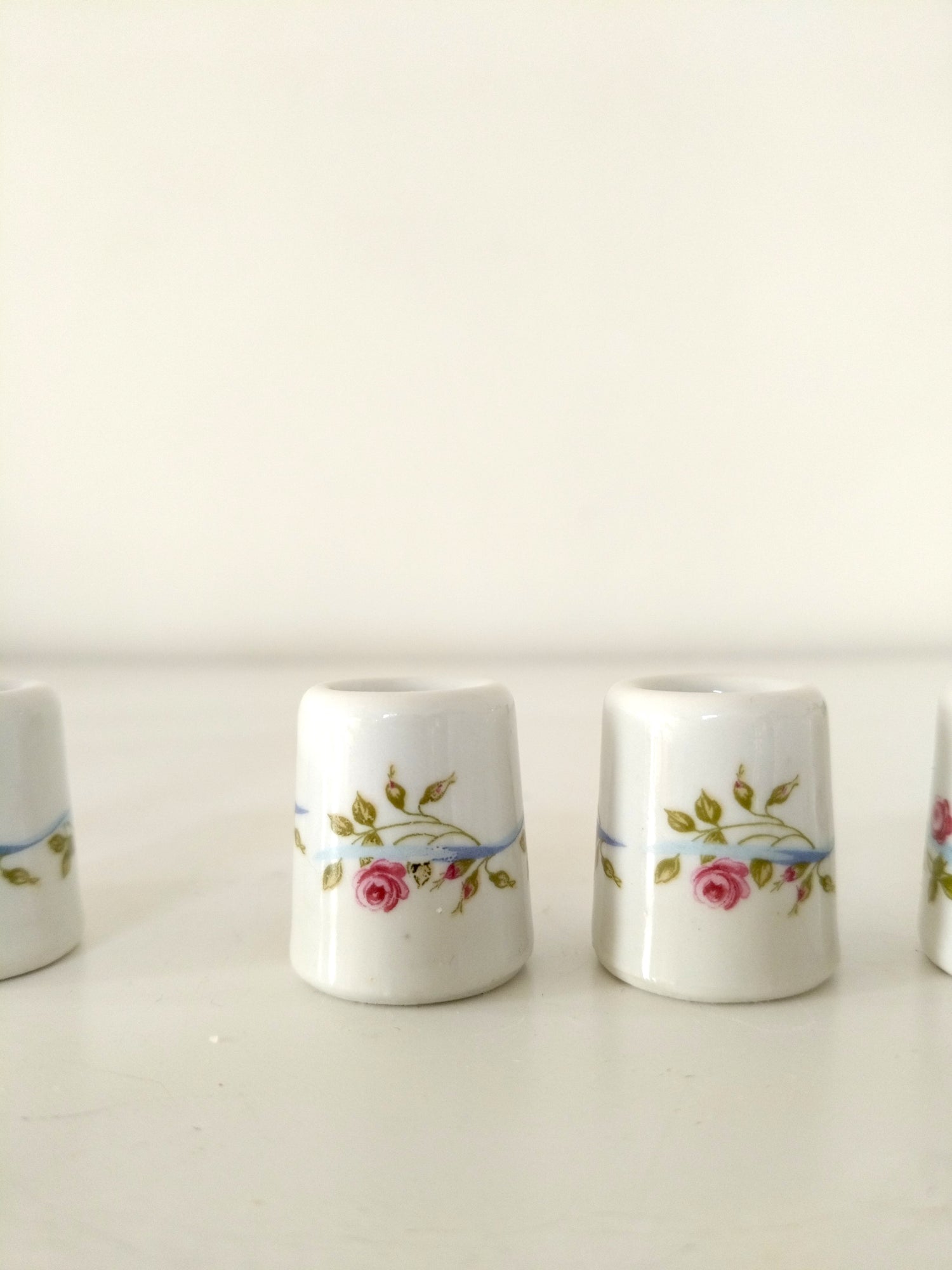 Porcelaine - 2 à grosses roses ont un petit éclat sur la base + l'une ou l'autre très petite marque dans le décor de l'un ou l'autre - 3cm de hauteur.