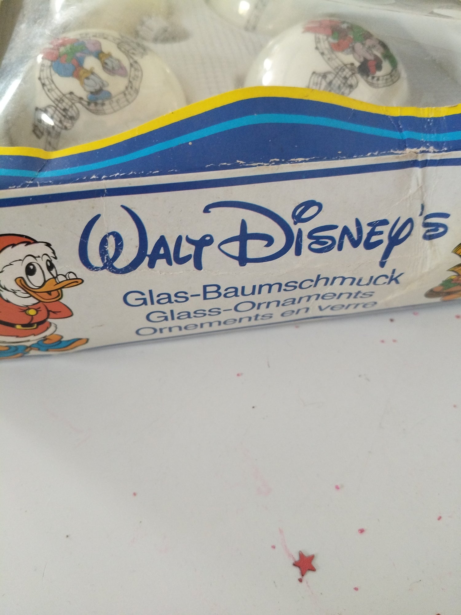 Verre, 4 boules identiques, une face Mickey l'autre Donald - marques d'usage/fabrication visibles sur les photos, décors intacts - +- 6cm de diamètre