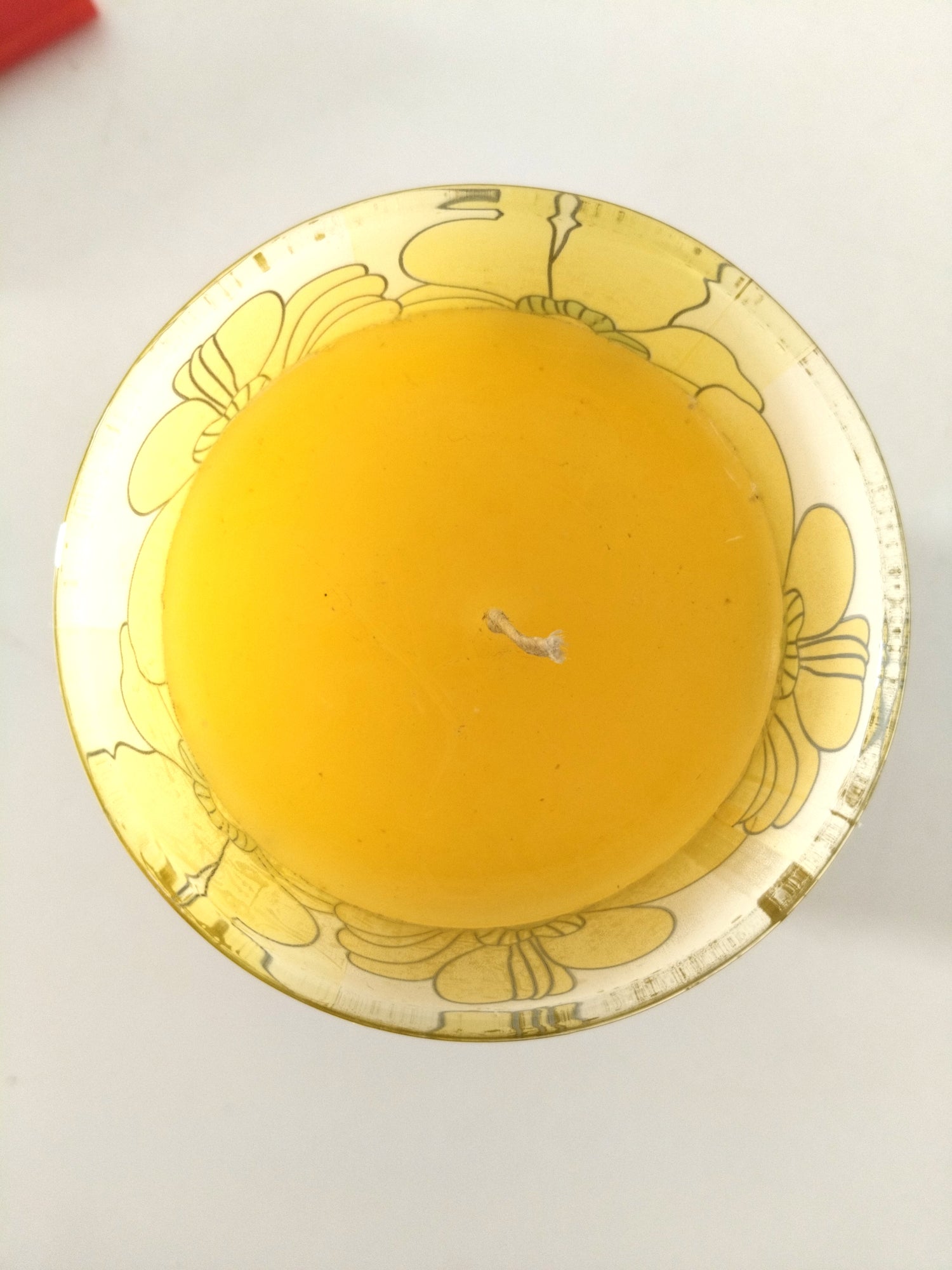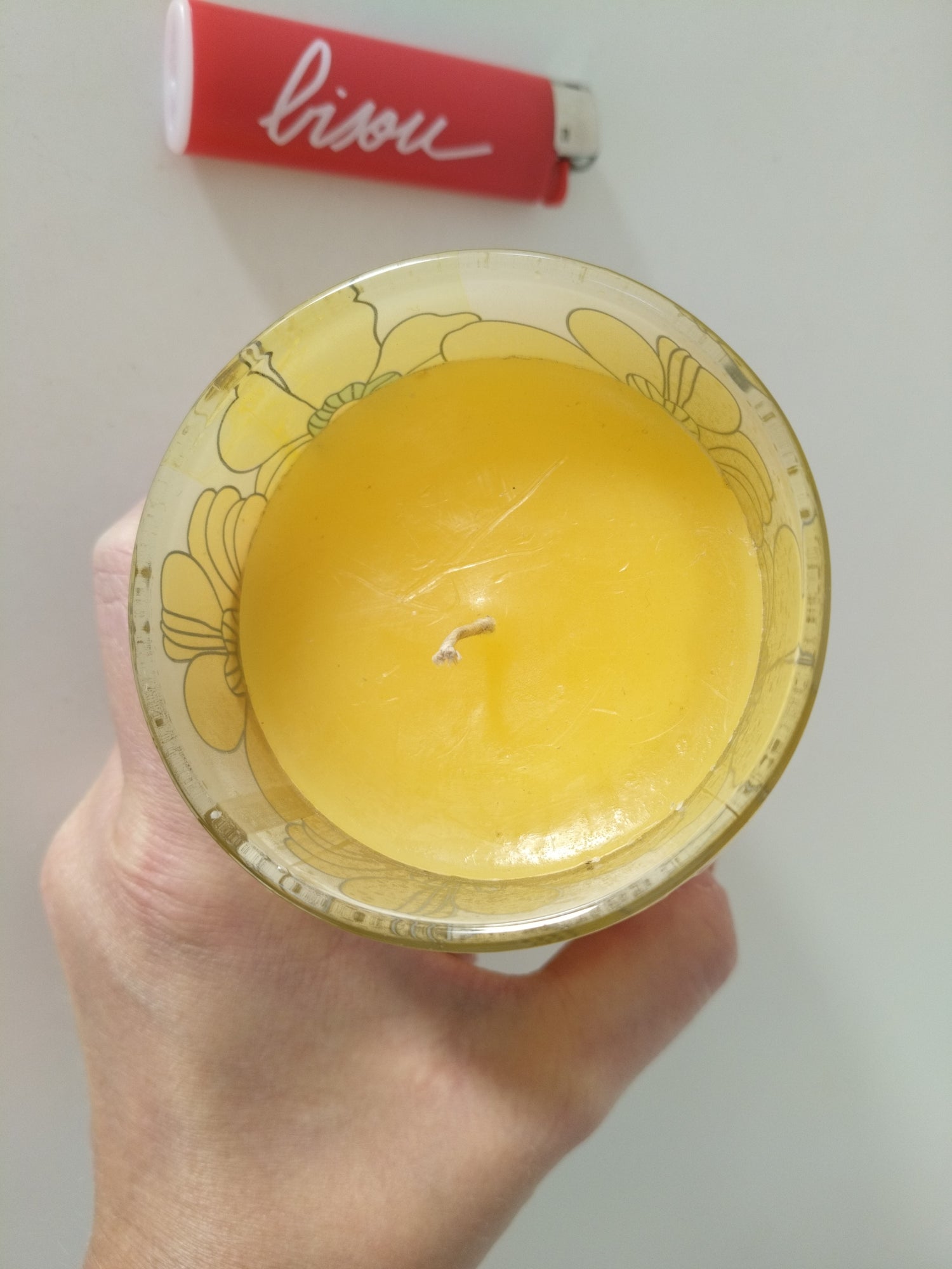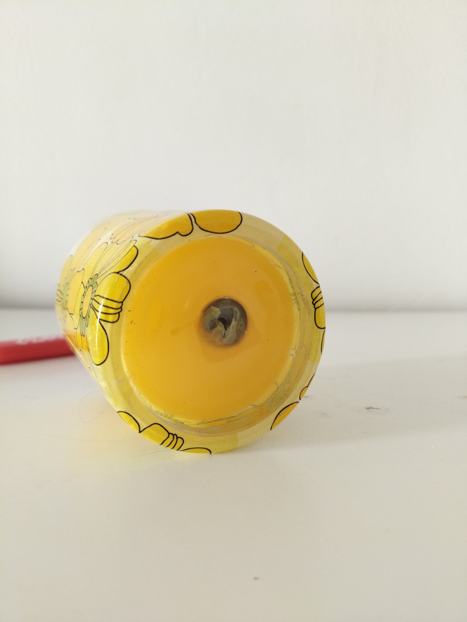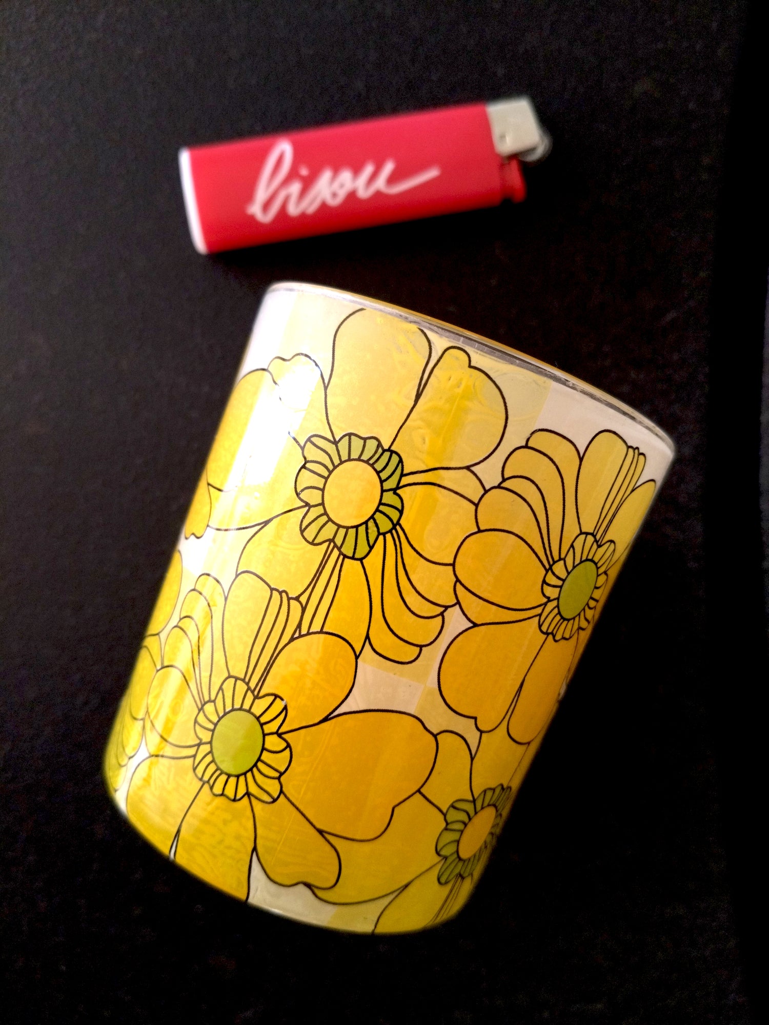 Verre, décor plastifié, bougie inodorante - jamais utilisé, petites marques de stockage sur la bougie - 8,3cm de hauteur 7cm de diamètre.