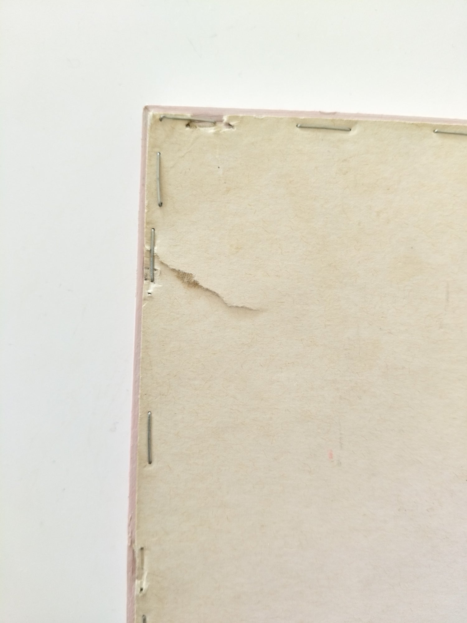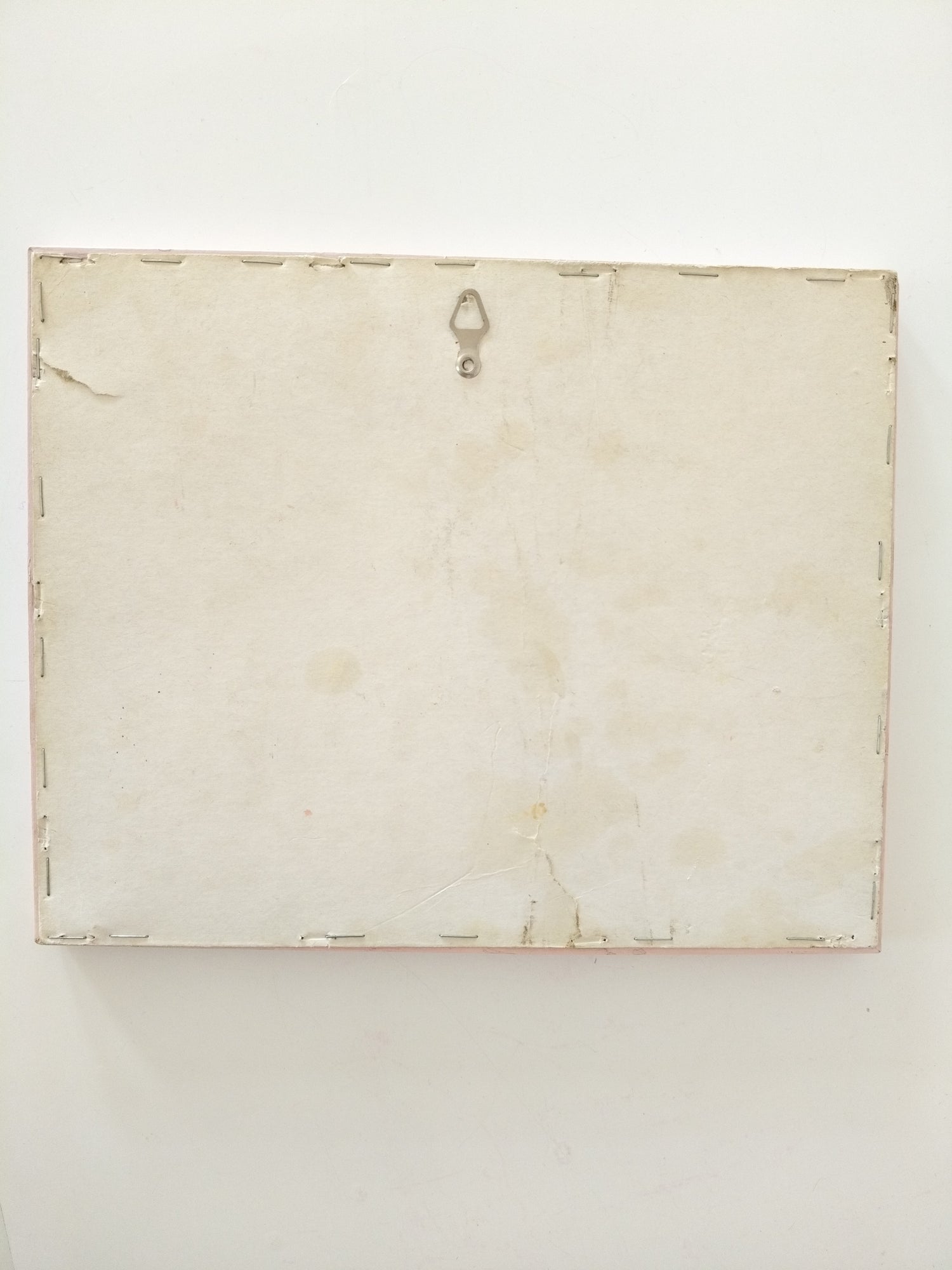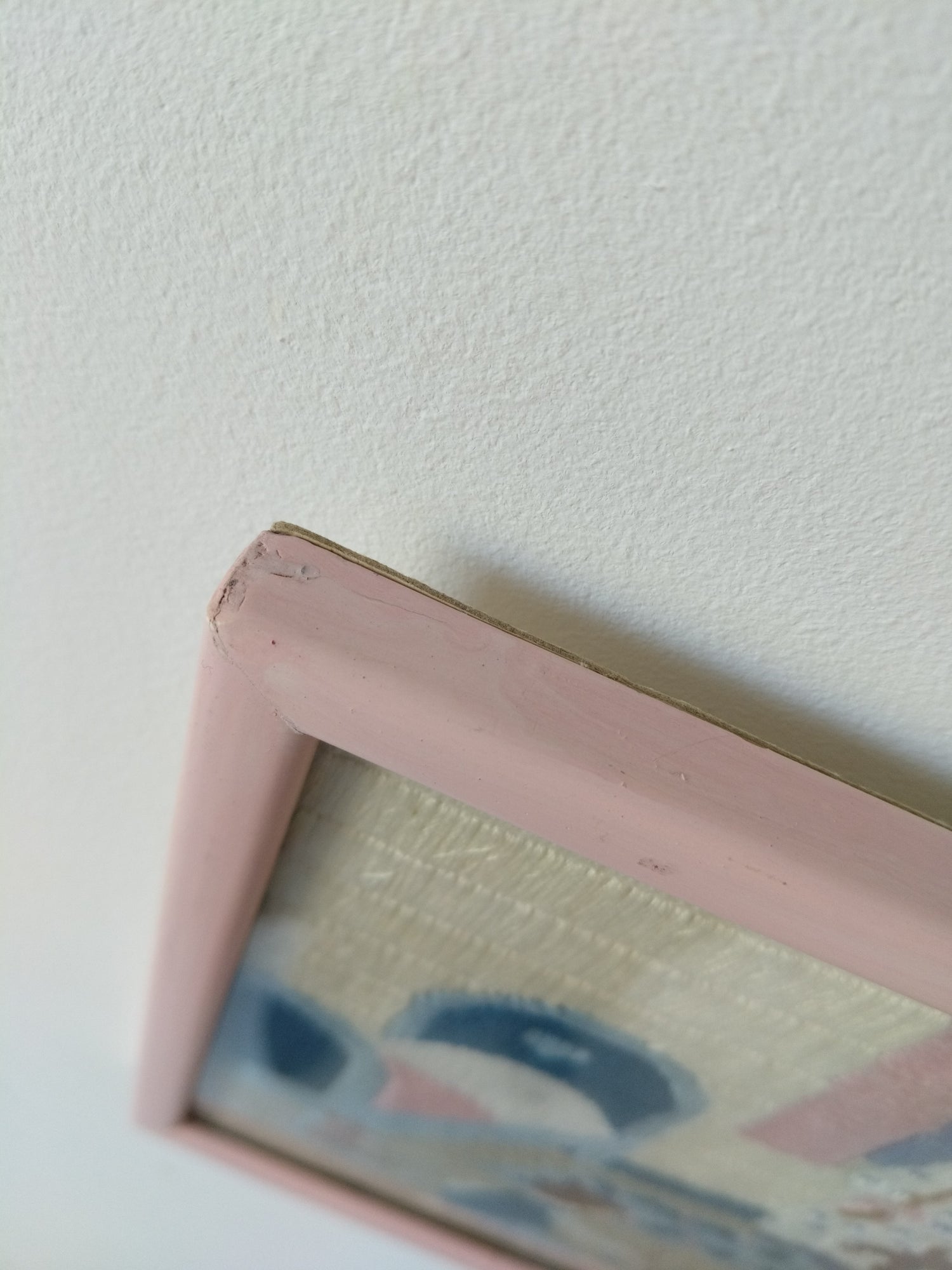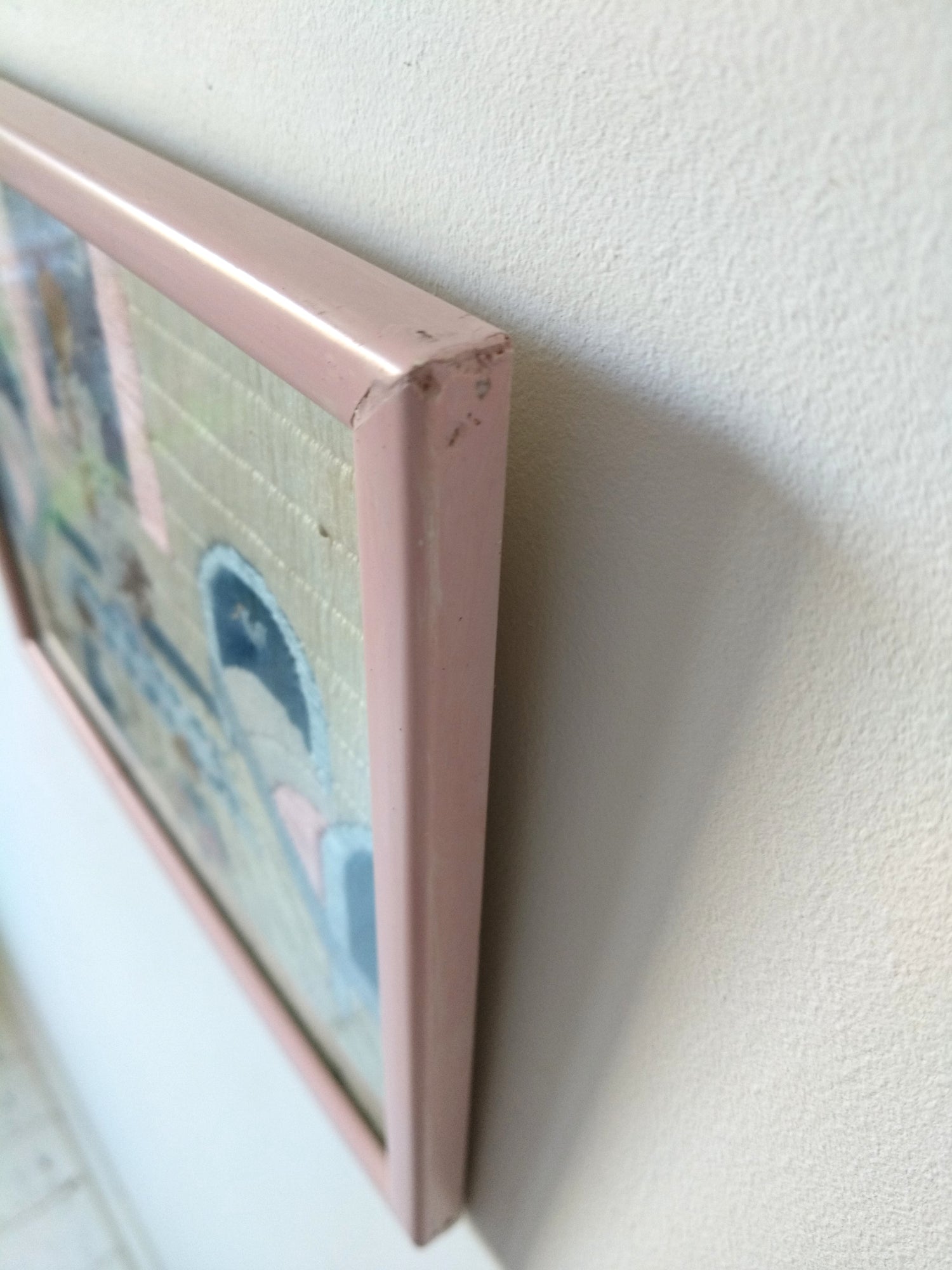 Encadrement bois peint en rose, vitre en verre - marques du temps/fabrication visibles sur les photos + une petite rayure sur la vitre - +- 26 x 21cm.