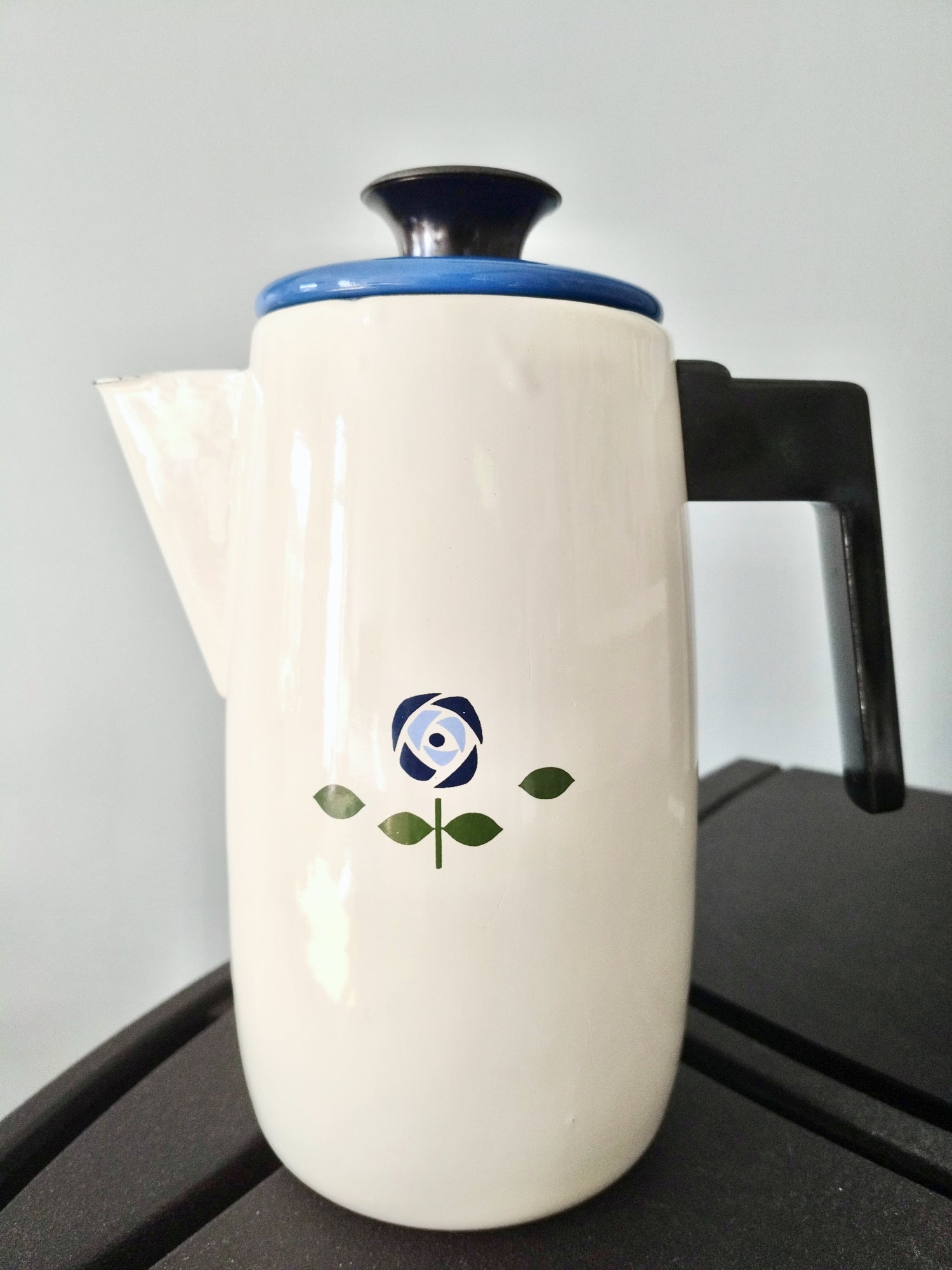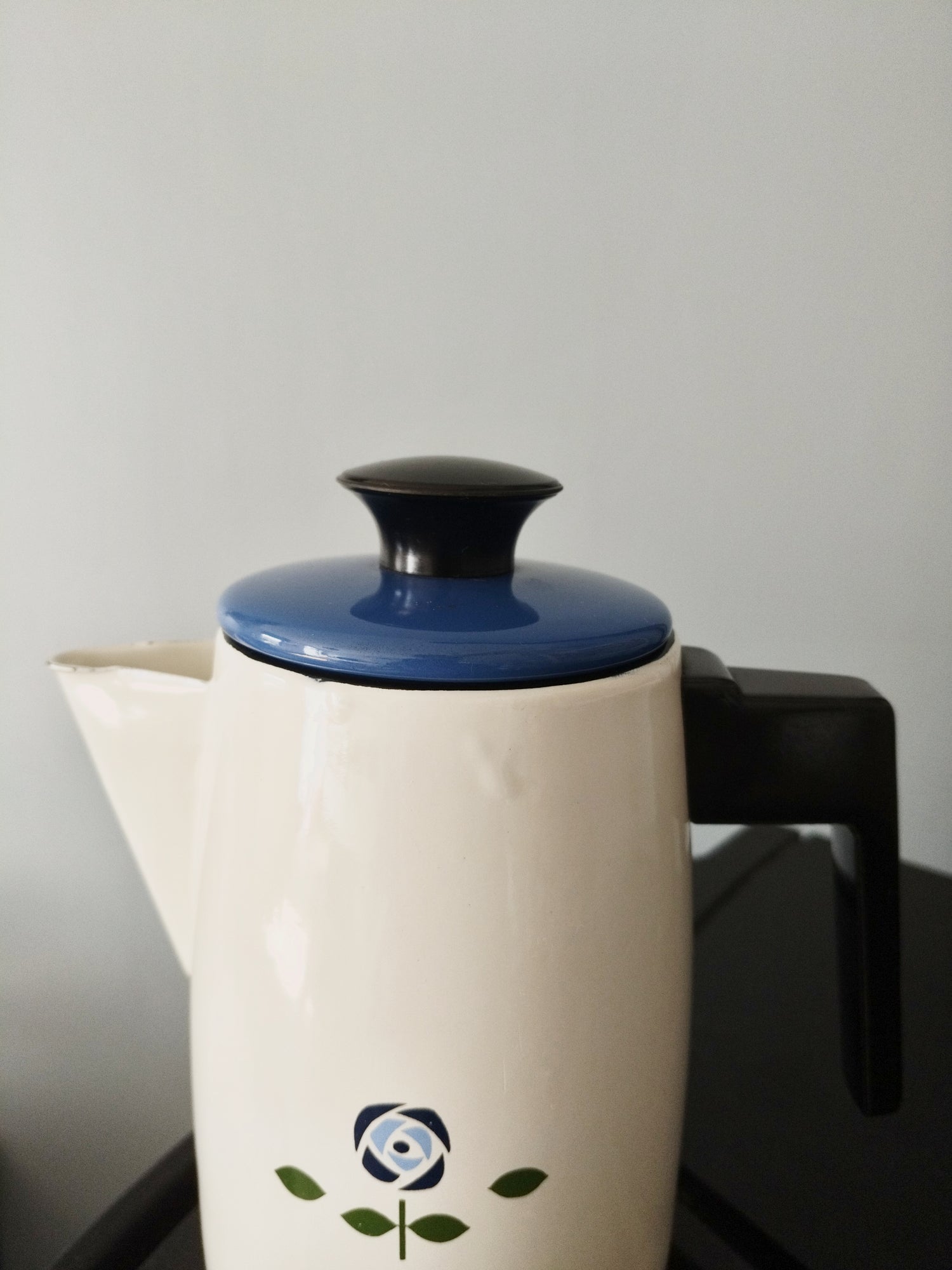 Émail - très bel état d'époque, très minimes marques d'usage et deux trois petites imperfections de fabrication. Quant au couvercle, son bord est plus marqué, cf photos - 19cm de hauteur sans couvercle, 1750ml de contenance.