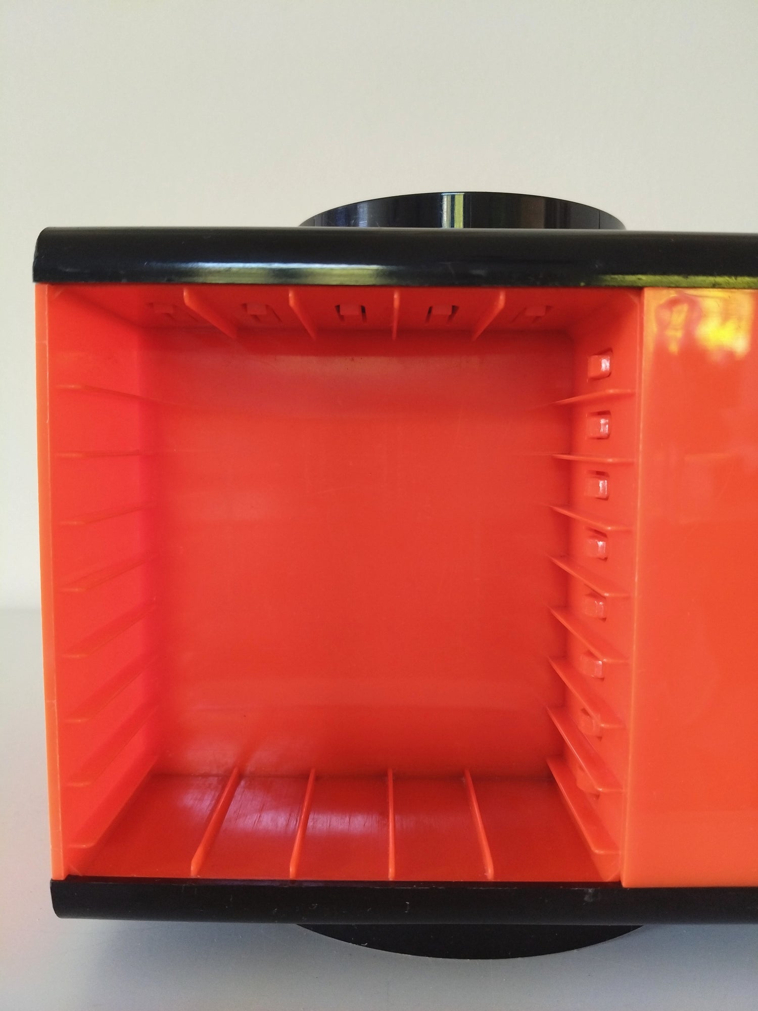 Tout plastique, orange bien peps, cassettes seules à l'horizontale, boîtes à la verticale - petites marques (une plus étendue)et rayures dans le plastique - 16,5cm de côté 14,5cm de hauteur (sans la poignée)