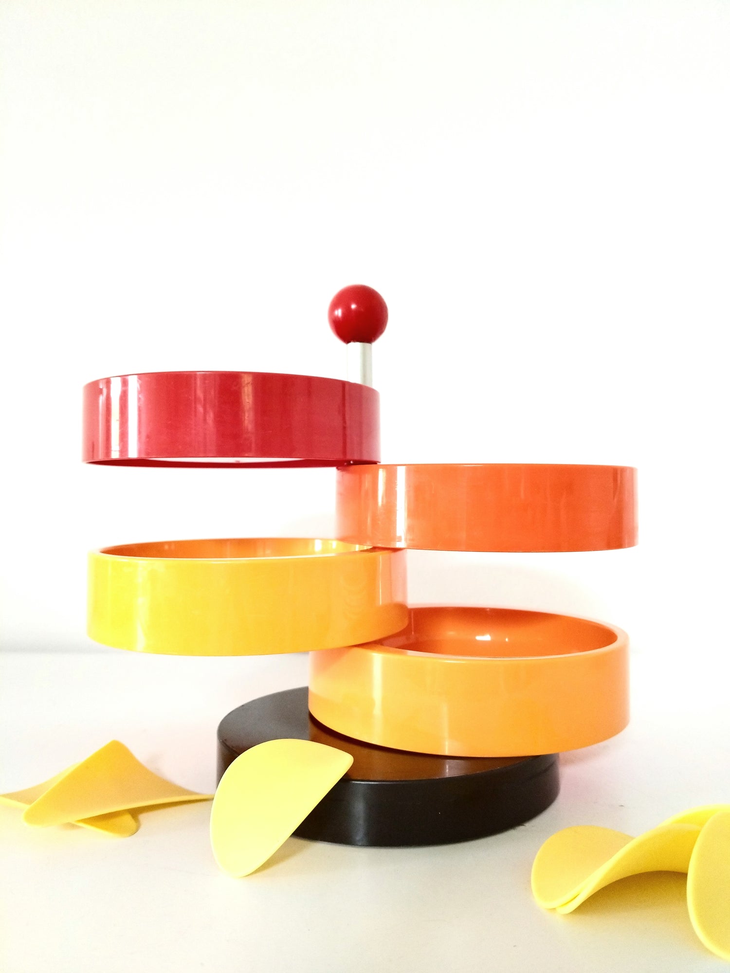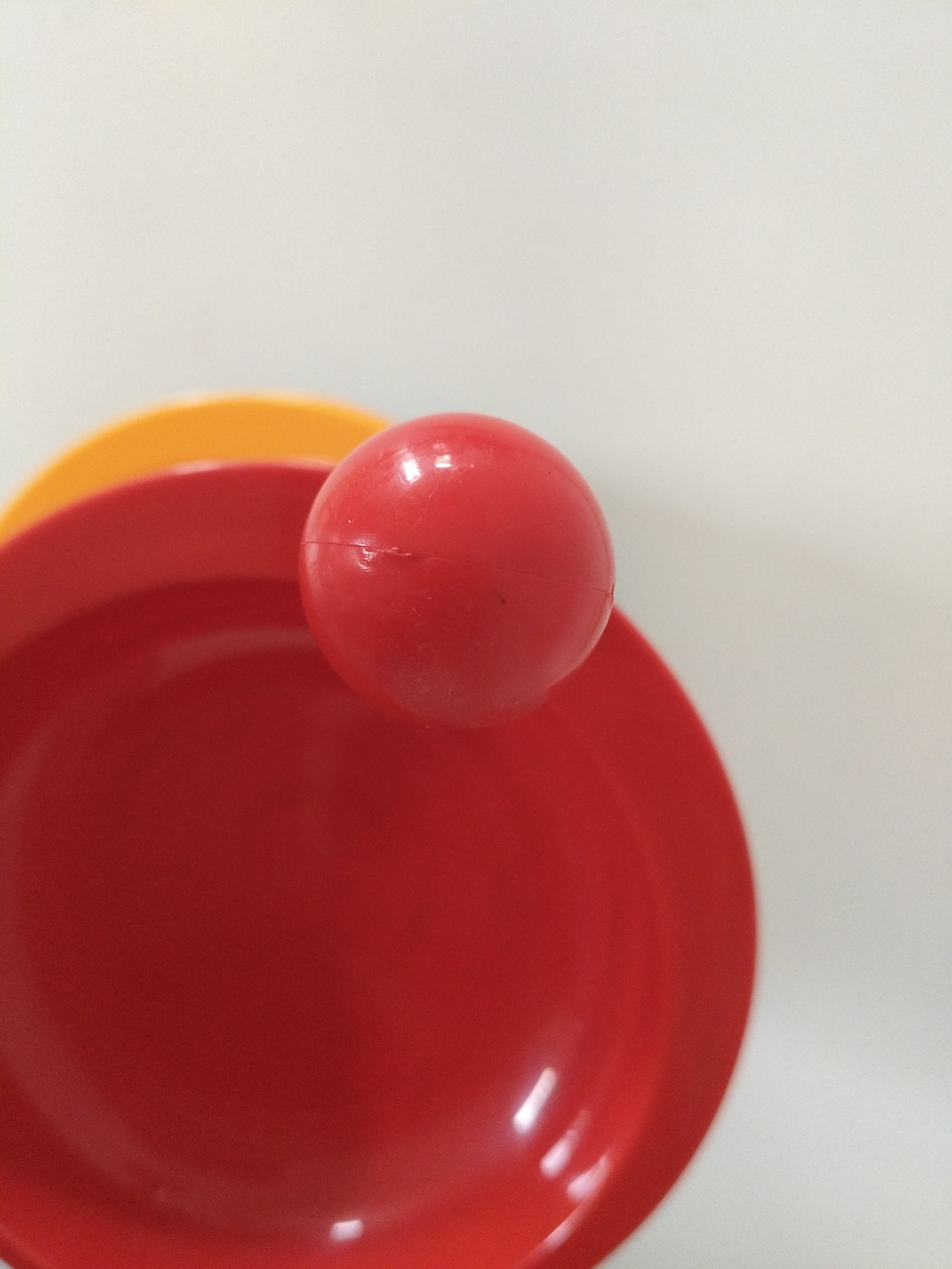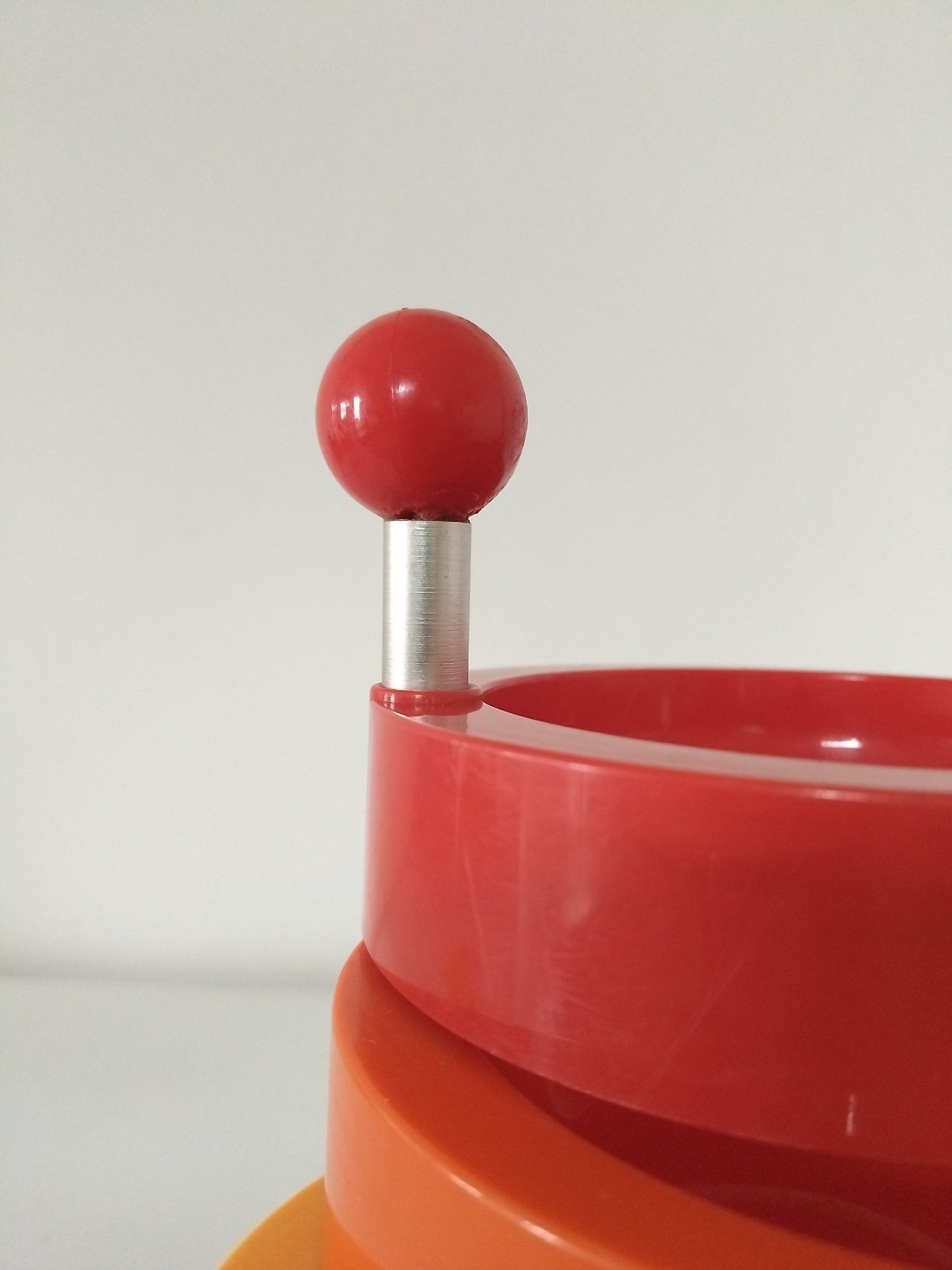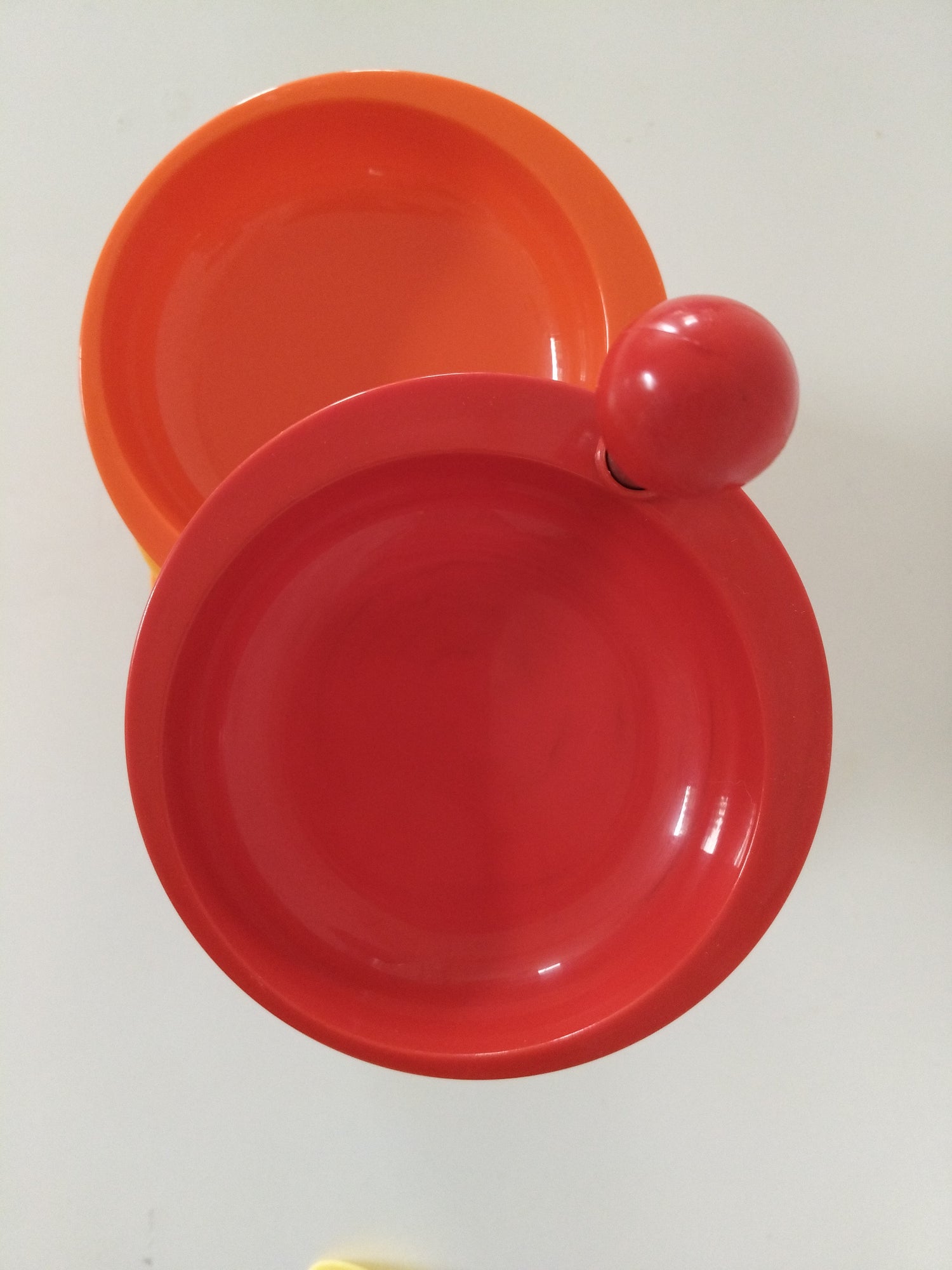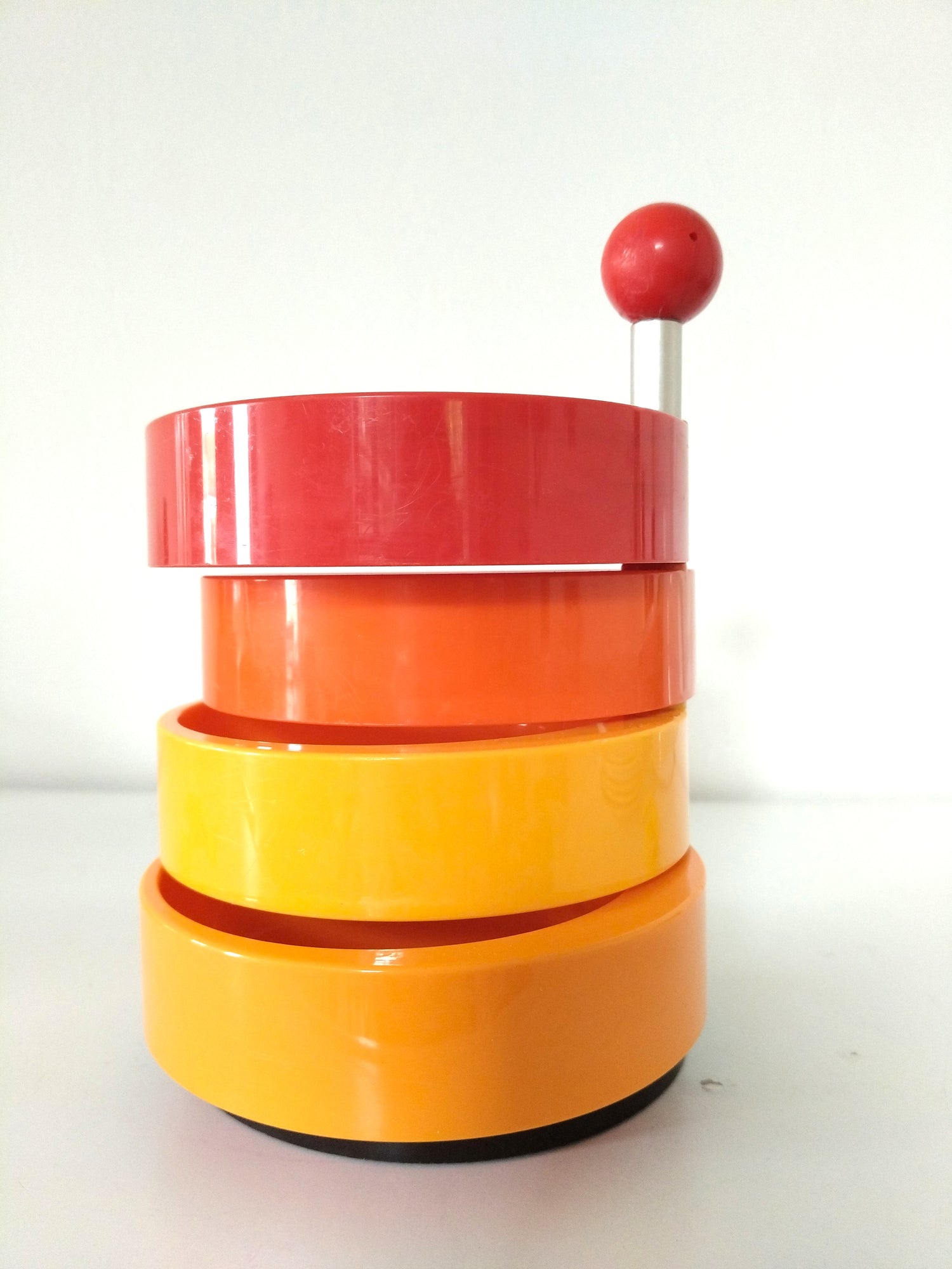 Plastique - 4 coupelles pivotantes et coulissantes - les marques les plus importantes : la boule rouge du dessus a été recollée (à la base, elle se visse) et cela n'a pas été fait très proprement (excès/ traces de colle mais j'ai lissé et coloré pour unifier un max, ça reste tout de même un peu visible). C'est très solide, très tenace, ça ne risque rien, pas d'inquiétude! Quelques marques sur la base. Il semblerait qu'il y ait un très fin cheveu sans danger et pas visible dans le compartiment jaune. Et enfin, le rouge, a des marques noirâtres qui semblent être dans le plastique depuis toujours. 20,5cm au plus haut 12,8cm de diamètre.