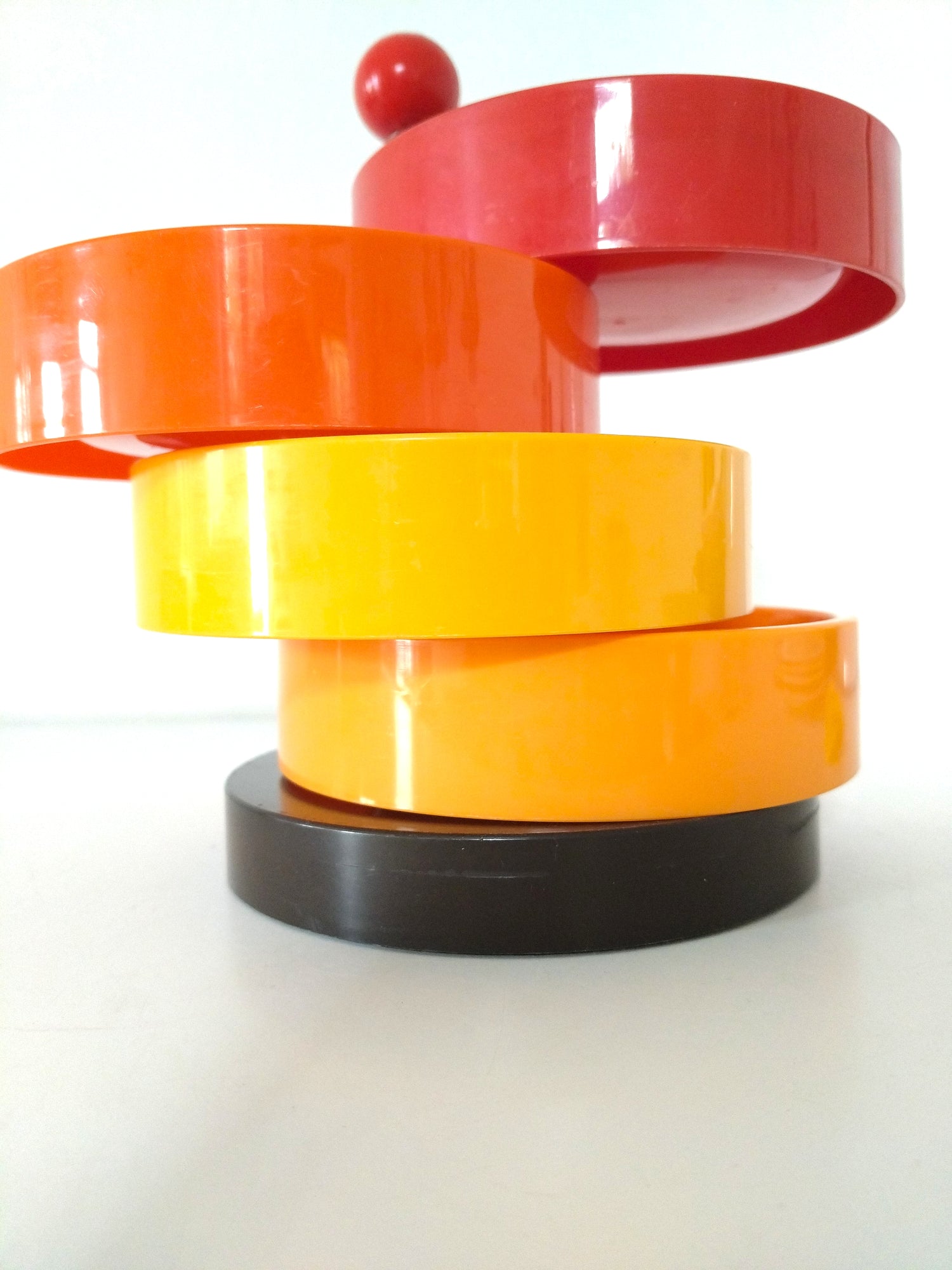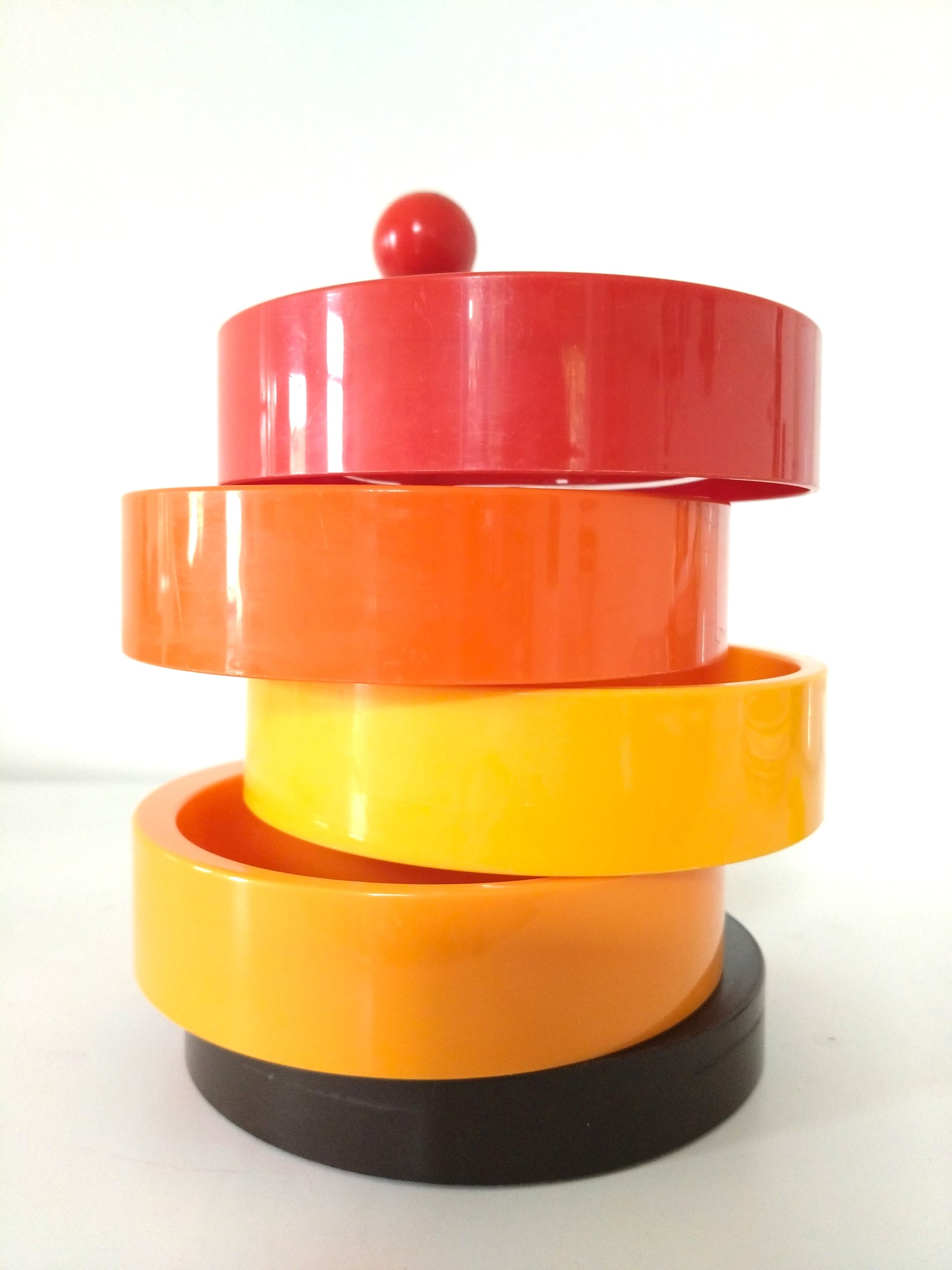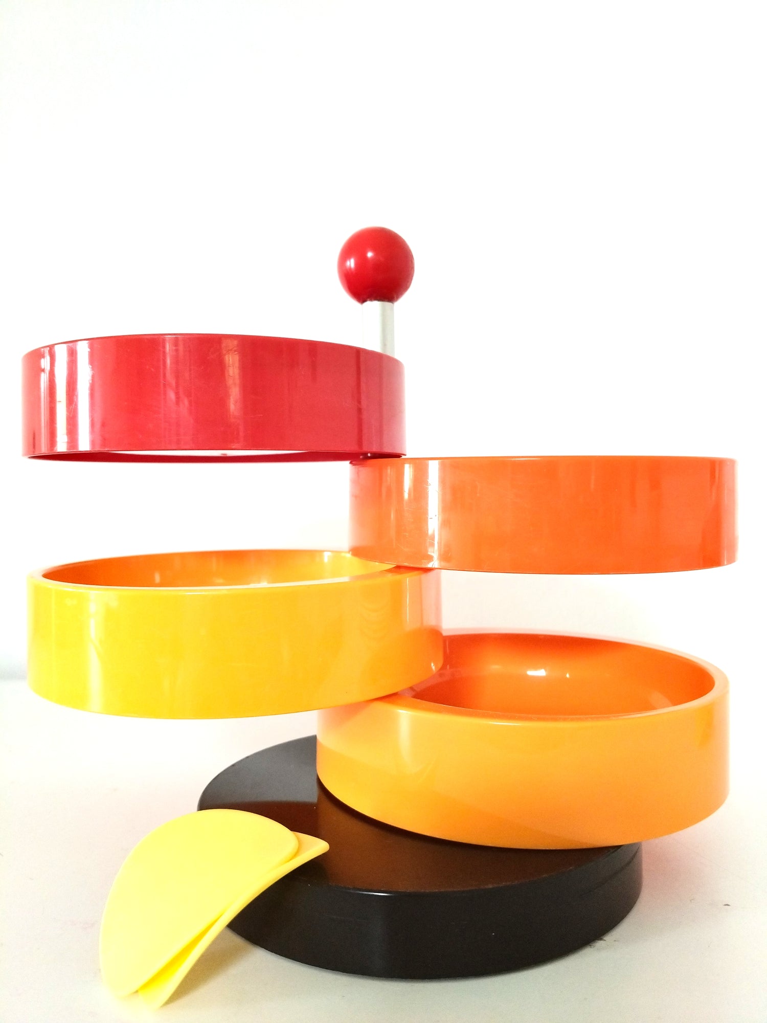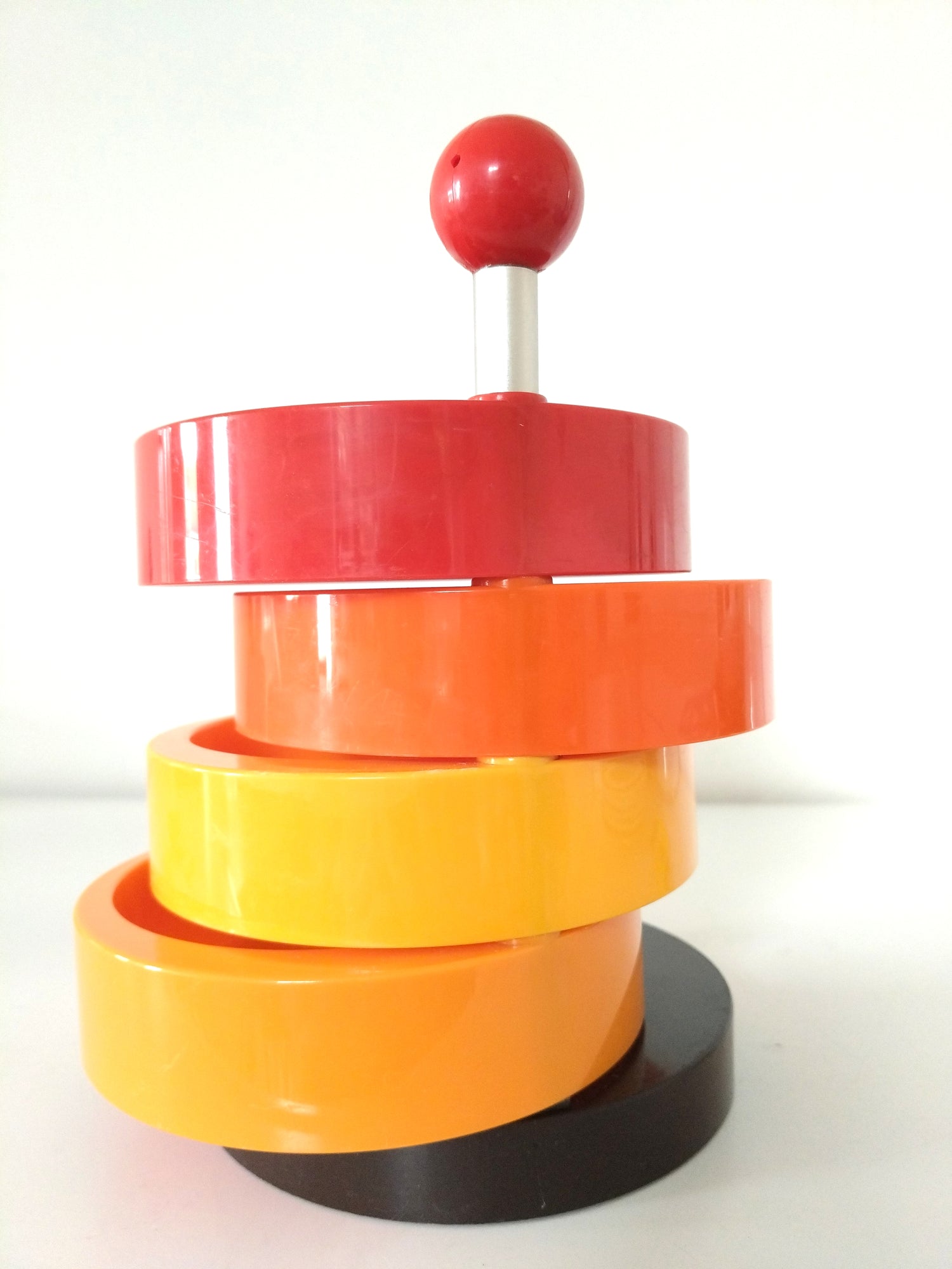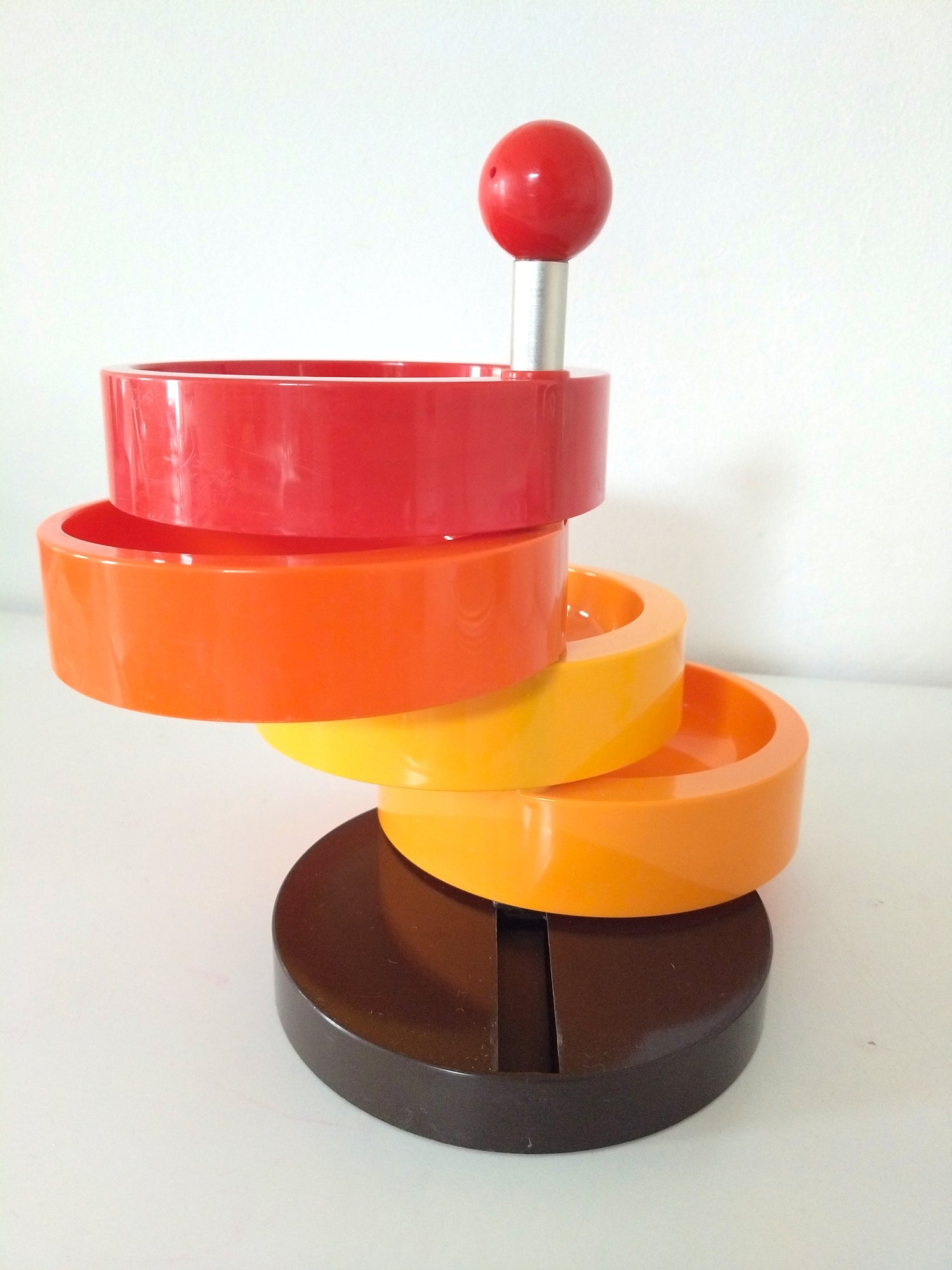 Plastique - 4 coupelles pivotantes et coulissantes - les marques les plus importantes : la boule rouge du dessus a été recollée (à la base, elle se visse) et cela n'a pas été fait très proprement (excès/ traces de colle mais j'ai lissé et coloré pour unifier un max, ça reste tout de même un peu visible). C'est très solide, très tenace, ça ne risque rien, pas d'inquiétude! Quelques marques sur la base. Il semblerait qu'il y ait un très fin cheveu sans danger et pas visible dans le compartiment jaune. Et enfin, le rouge, a des marques noirâtres qui semblent être dans le plastique depuis toujours. 20,5cm au plus haut 12,8cm de diamètre.