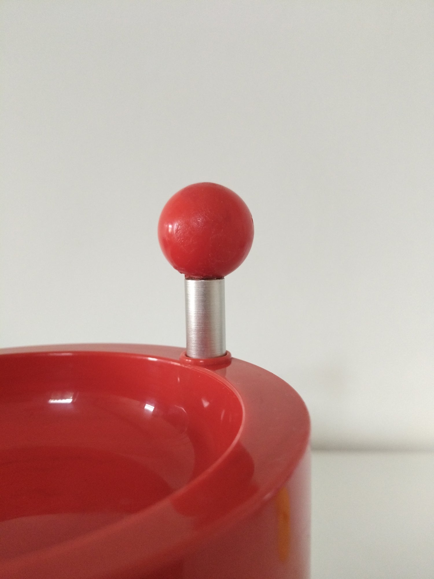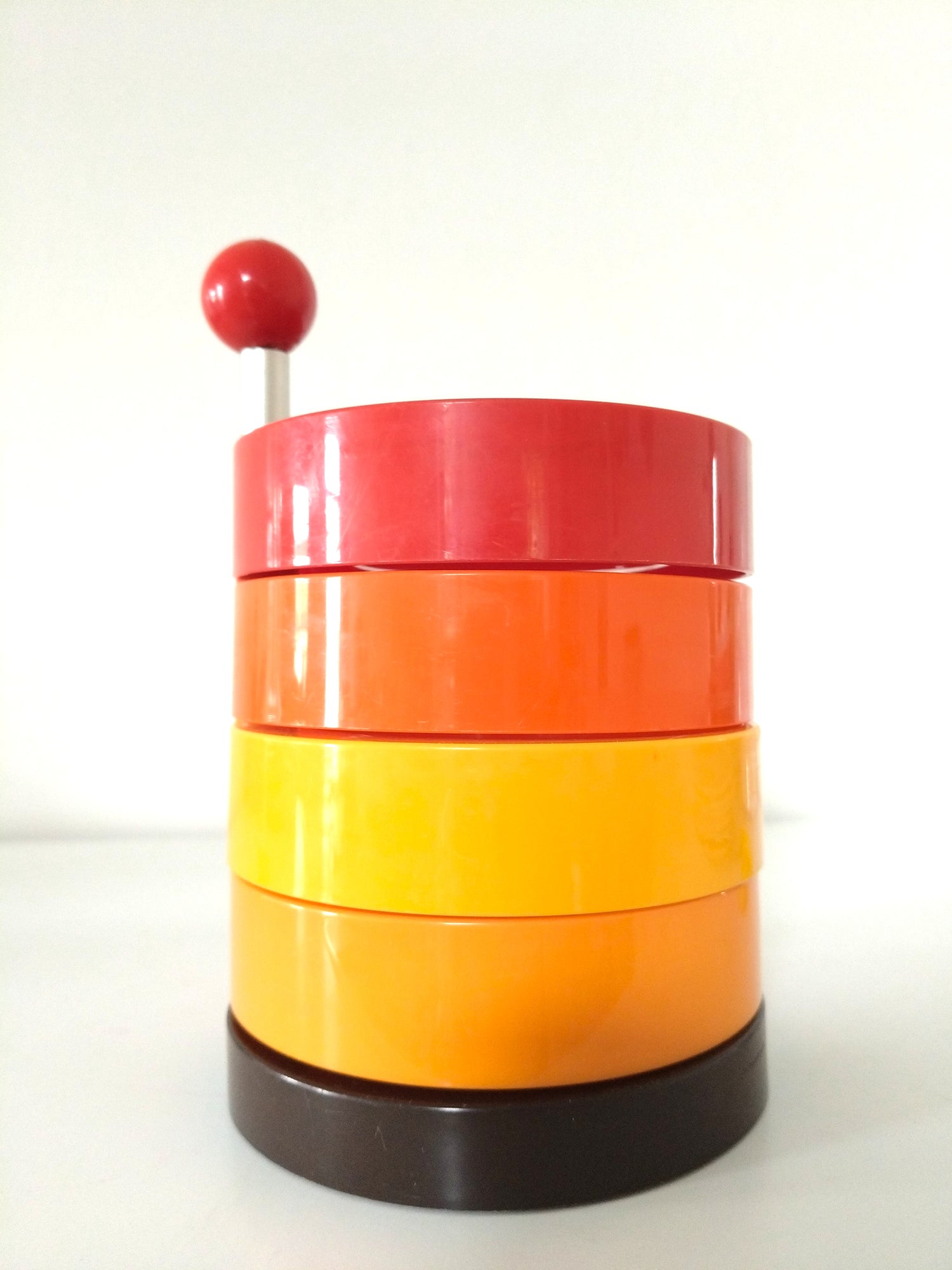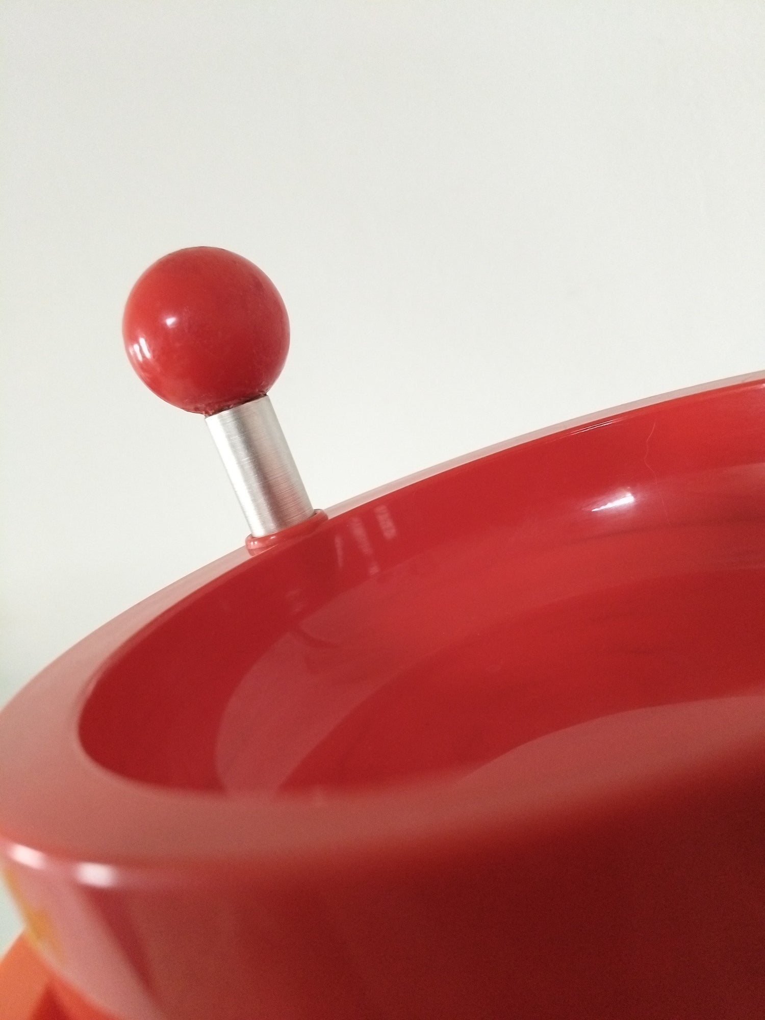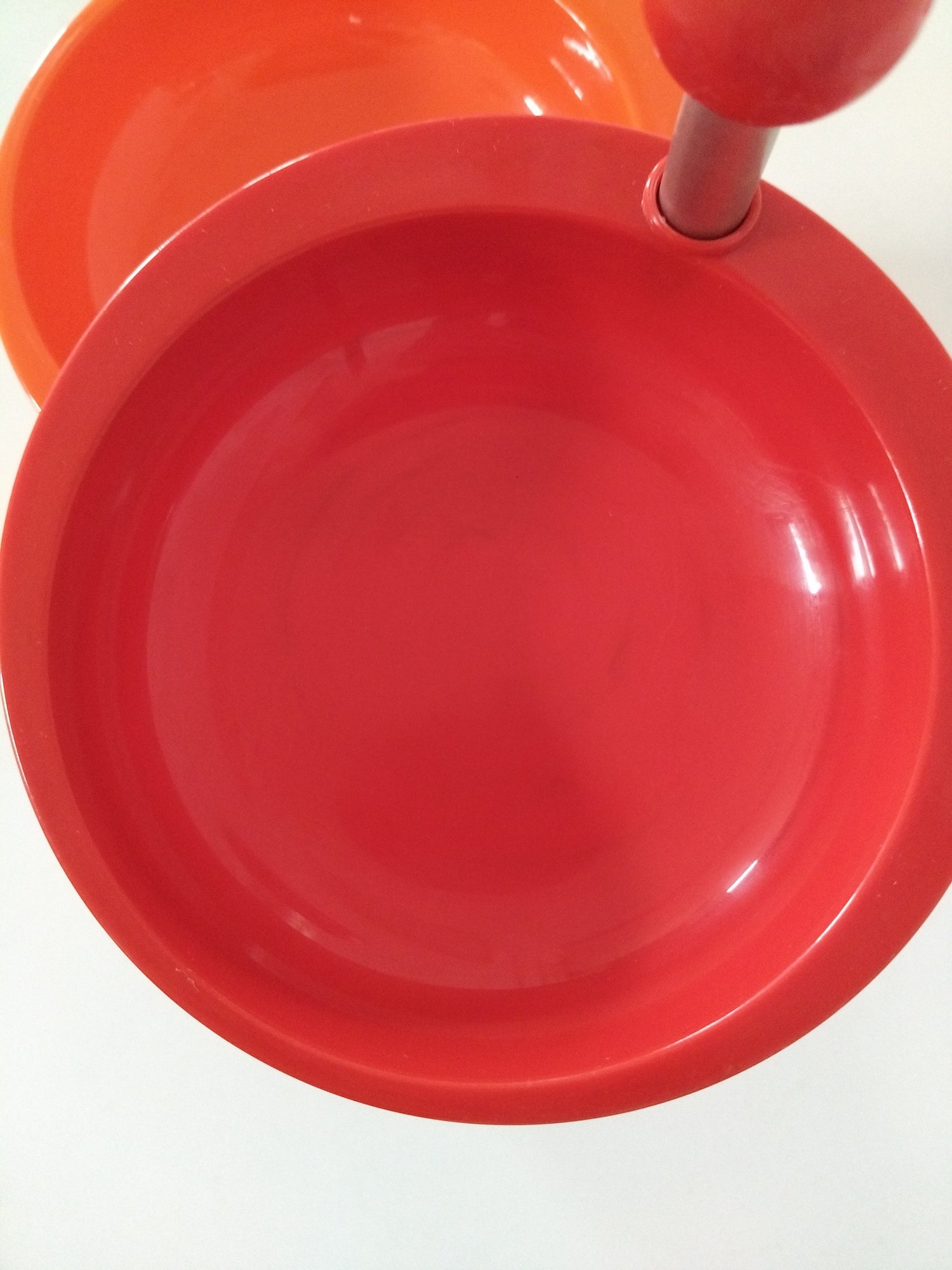Plastique - 4 coupelles pivotantes et coulissantes - les marques les plus importantes : la boule rouge du dessus a été recollée (à la base, elle se visse) et cela n'a pas été fait très proprement (excès/ traces de colle mais j'ai lissé et coloré pour unifier un max, ça reste tout de même un peu visible). C'est très solide, très tenace, ça ne risque rien, pas d'inquiétude! Quelques marques sur la base. Il semblerait qu'il y ait un très fin cheveu sans danger et pas visible dans le compartiment jaune. Et enfin, le rouge, a des marques noirâtres qui semblent être dans le plastique depuis toujours. 20,5cm au plus haut 12,8cm de diamètre.