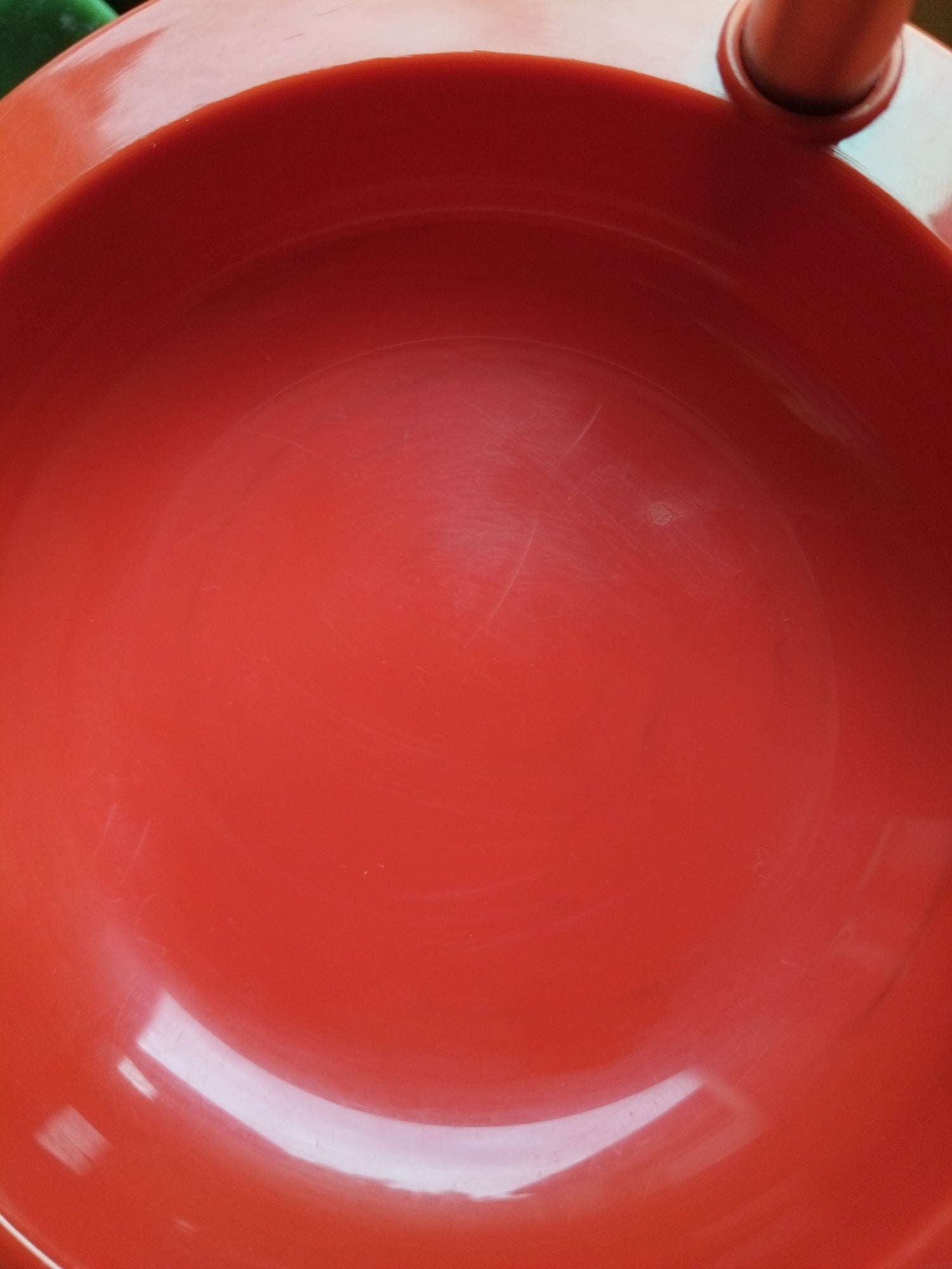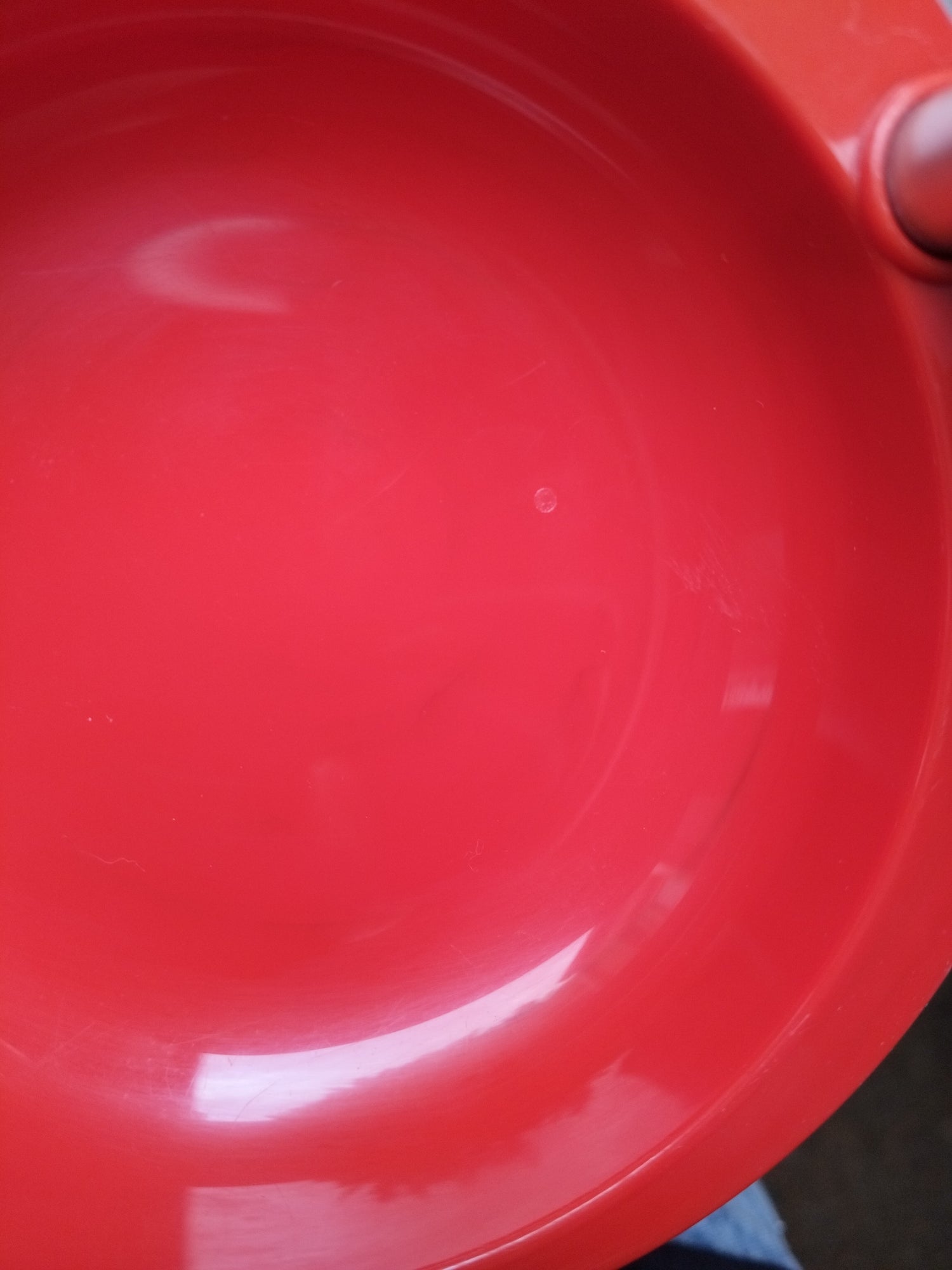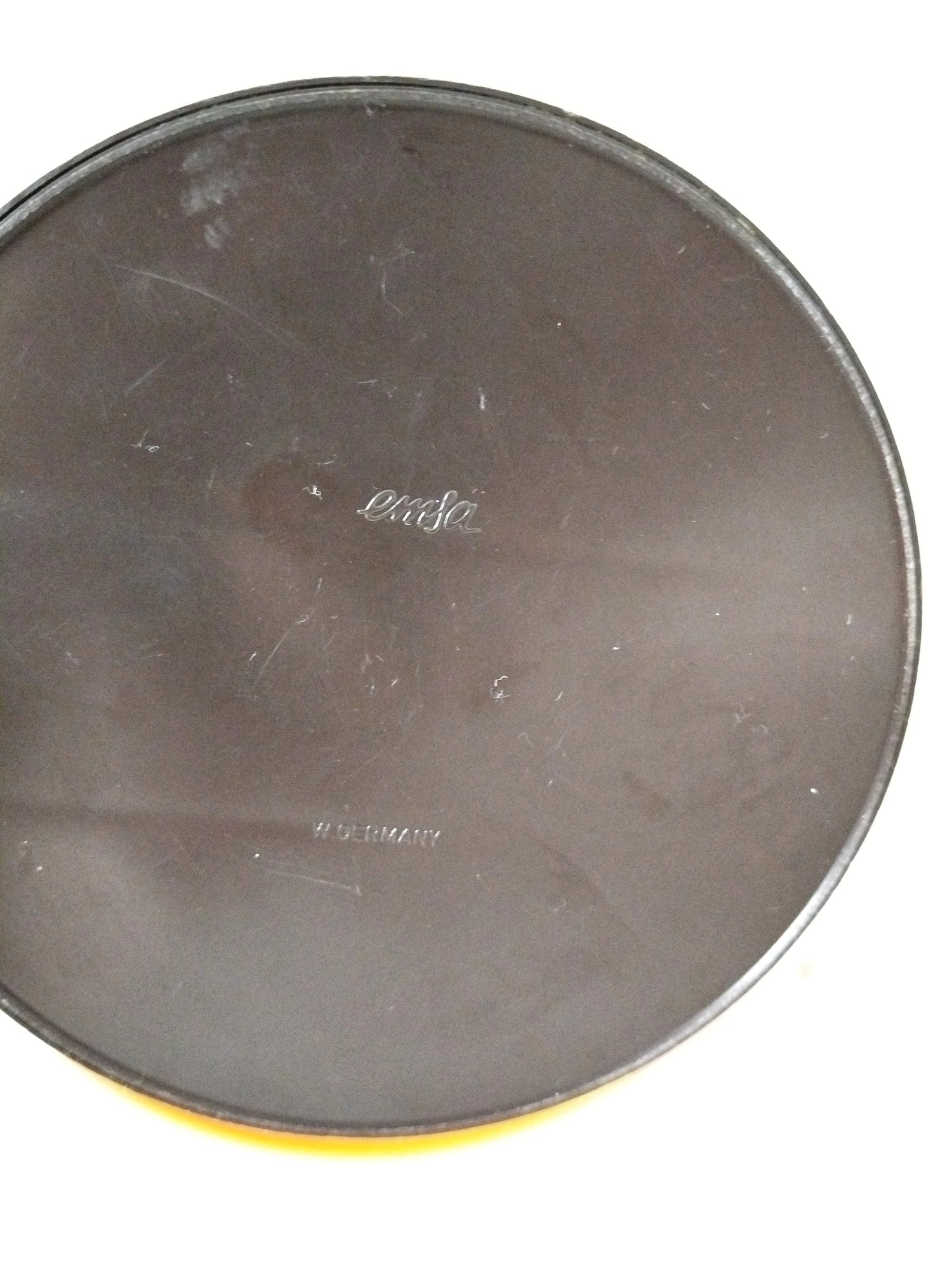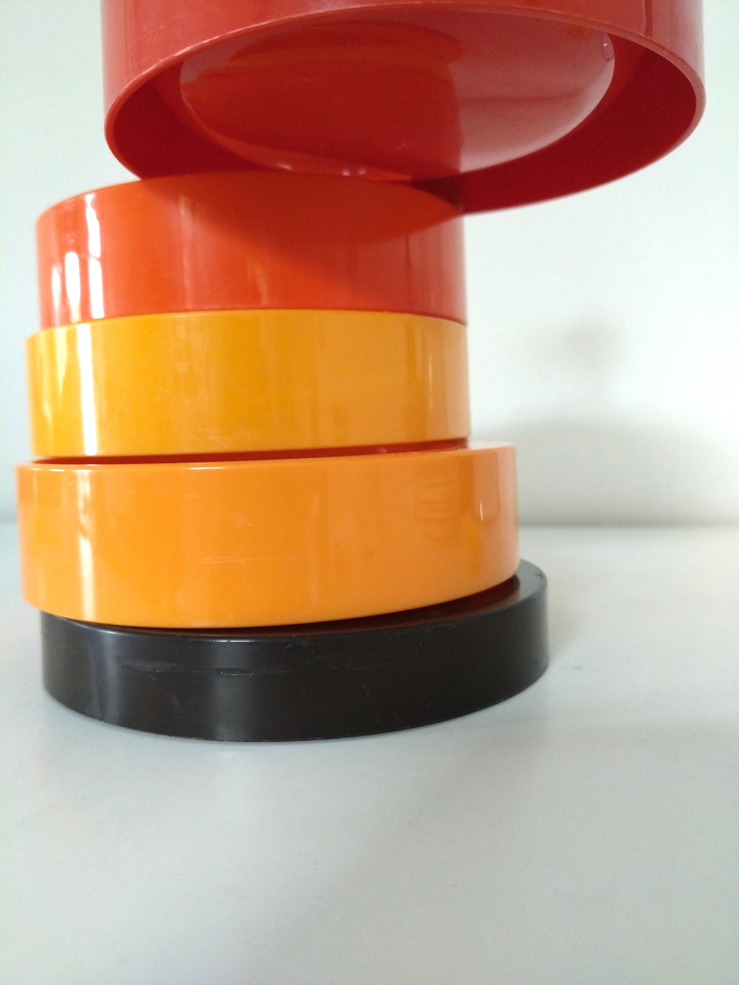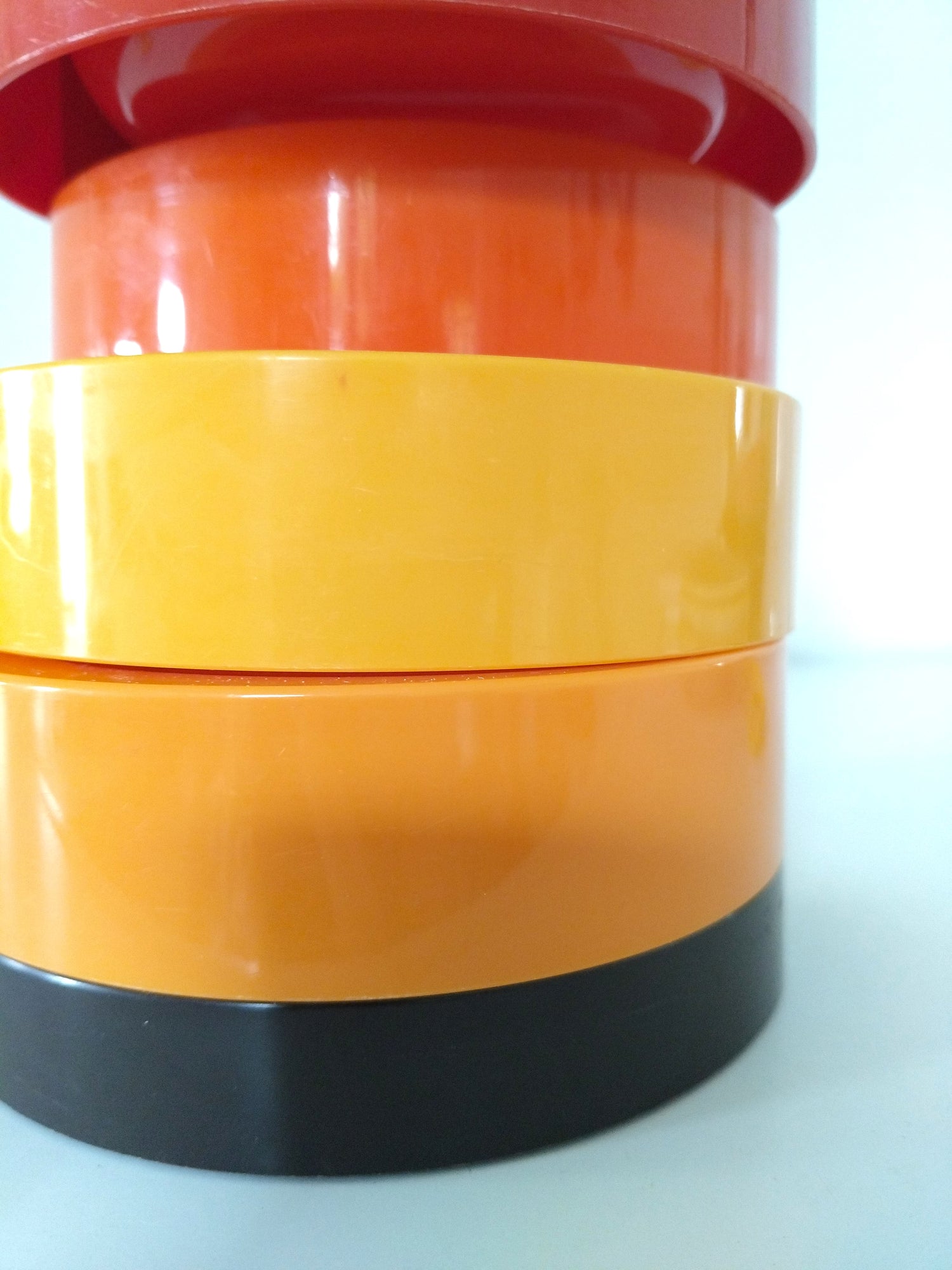 Plastique - 4 coupelles pivotantes et coulissantes - les marques les plus importantes : la boule rouge du dessus a été recollée (à la base, elle se visse) et cela n'a pas été fait très proprement (excès/ traces de colle mais j'ai lissé et coloré pour unifier un max, ça reste tout de même un peu visible). C'est très solide, très tenace, ça ne risque rien, pas d'inquiétude! Quelques marques sur la base. Il semblerait qu'il y ait un très fin cheveu sans danger et pas visible dans le compartiment jaune. Et enfin, le rouge, a des marques noirâtres qui semblent être dans le plastique depuis toujours. 20,5cm au plus haut 12,8cm de diamètre.