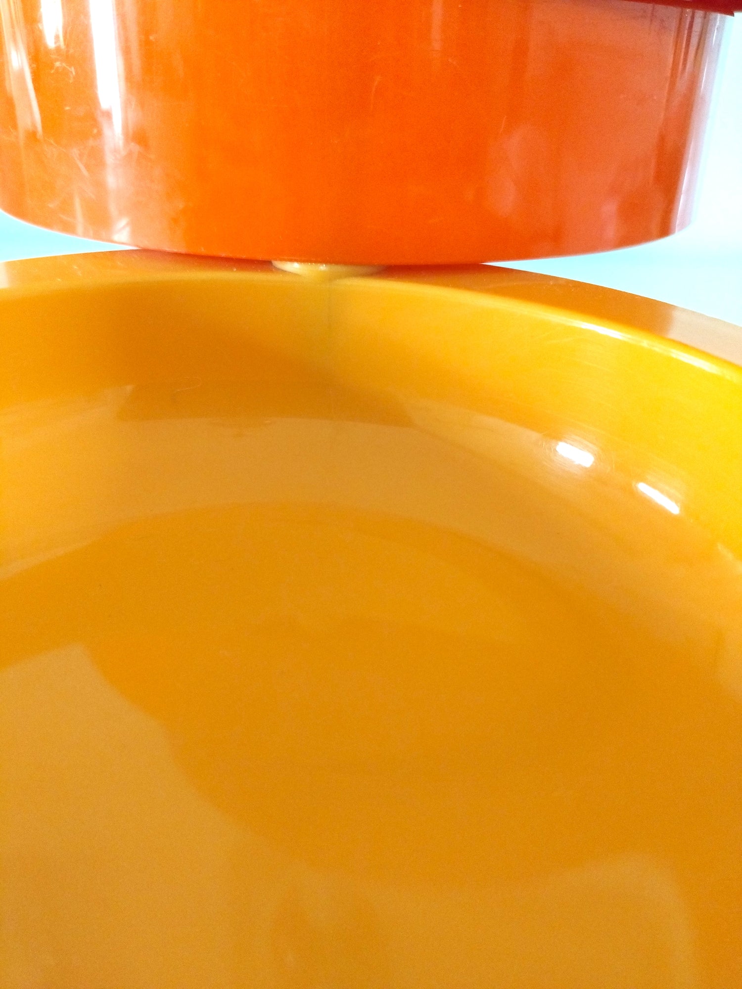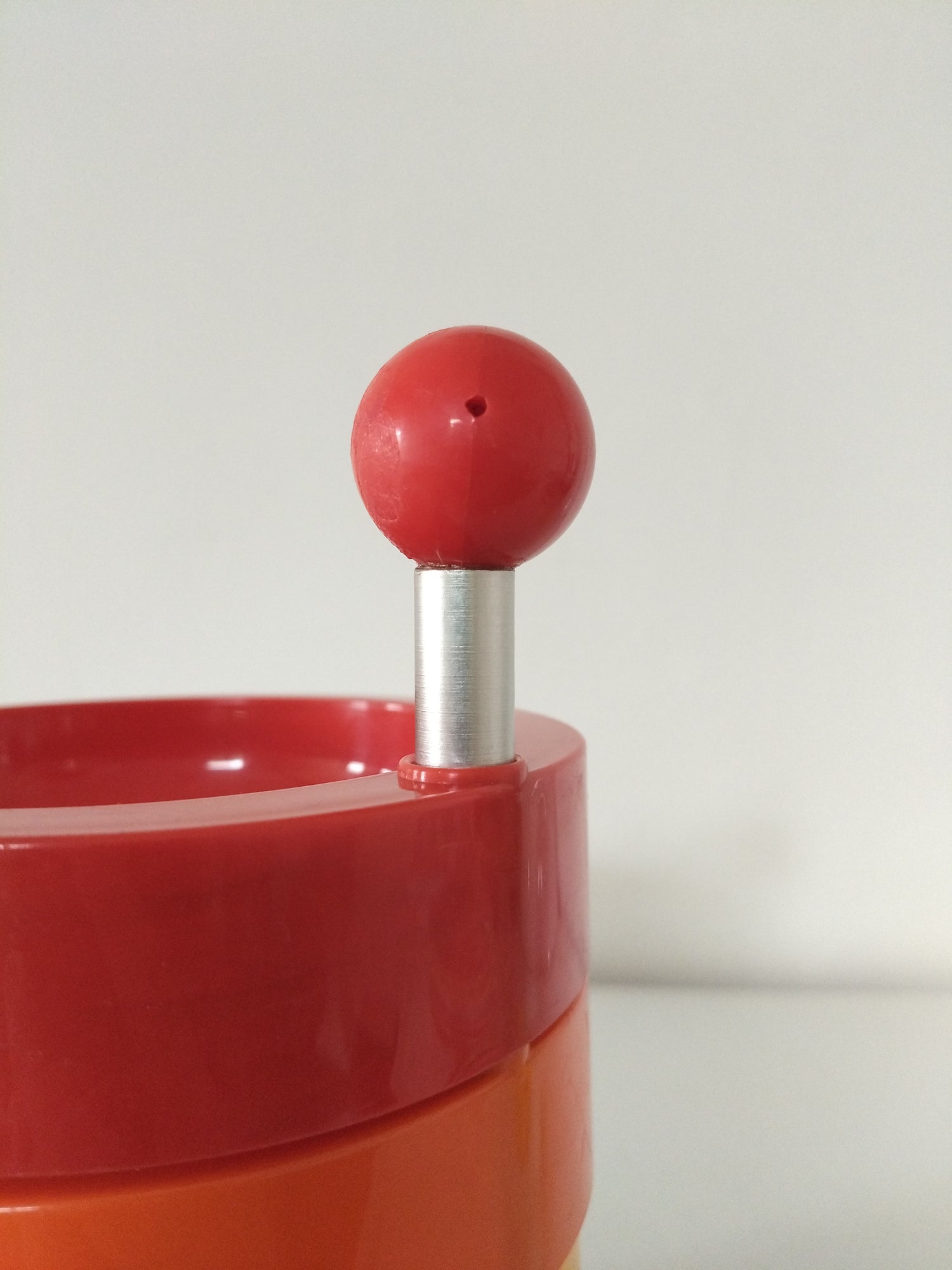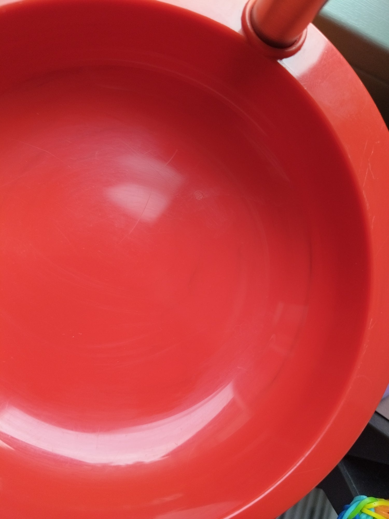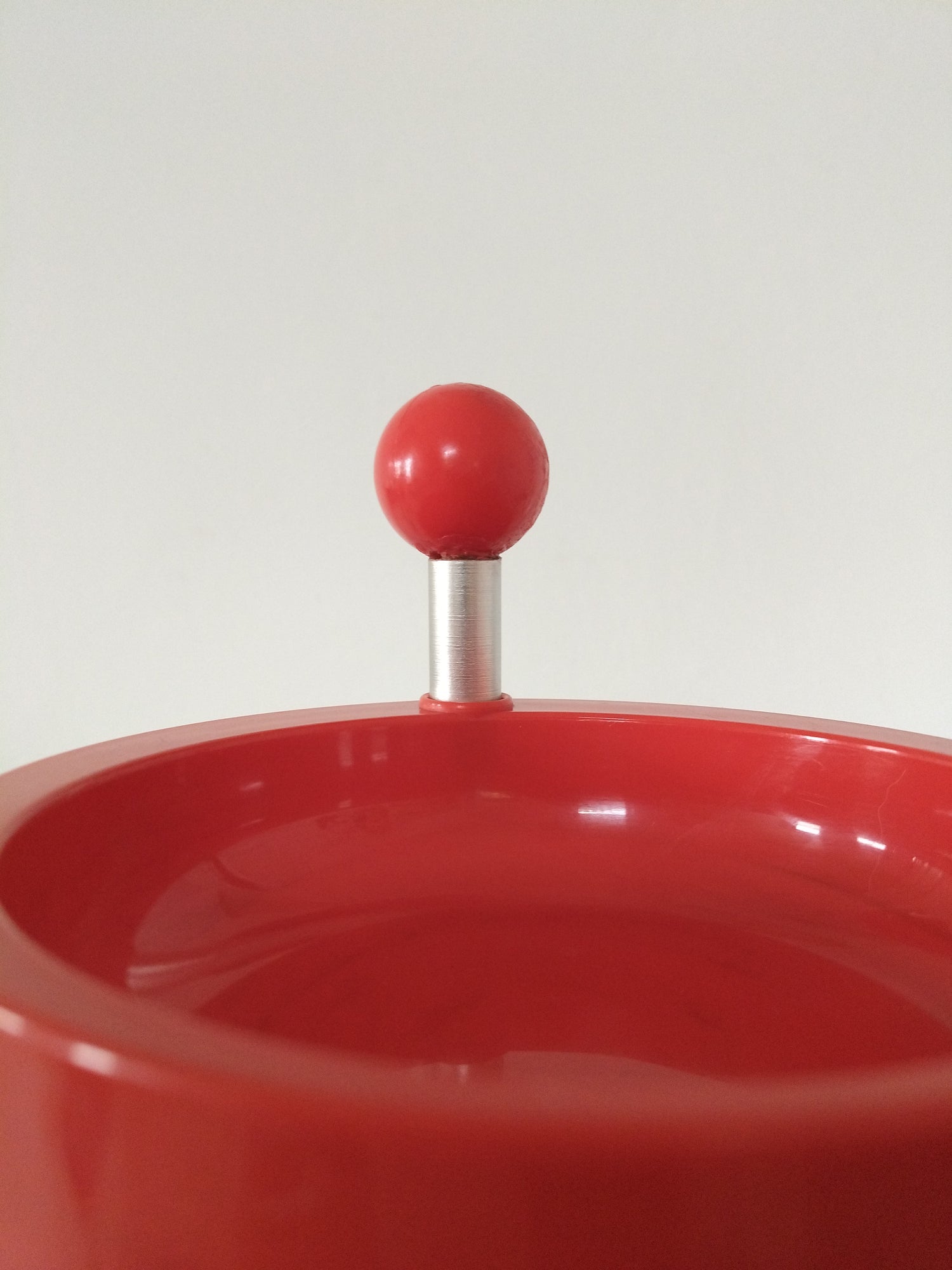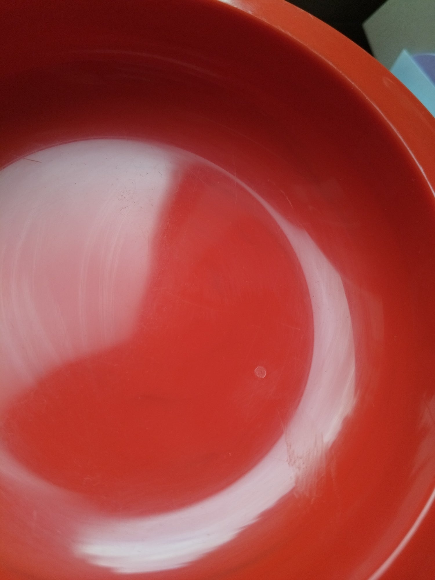 Plastique - 4 coupelles pivotantes et coulissantes - les marques les plus importantes : la boule rouge du dessus a été recollée (à la base, elle se visse) et cela n'a pas été fait très proprement (excès/ traces de colle mais j'ai lissé et coloré pour unifier un max, ça reste tout de même un peu visible). C'est très solide, très tenace, ça ne risque rien, pas d'inquiétude! Quelques marques sur la base. Il semblerait qu'il y ait un très fin cheveu sans danger et pas visible dans le compartiment jaune. Et enfin, le rouge, a des marques noirâtres qui semblent être dans le plastique depuis toujours. 20,5cm au plus haut 12,8cm de diamètre.