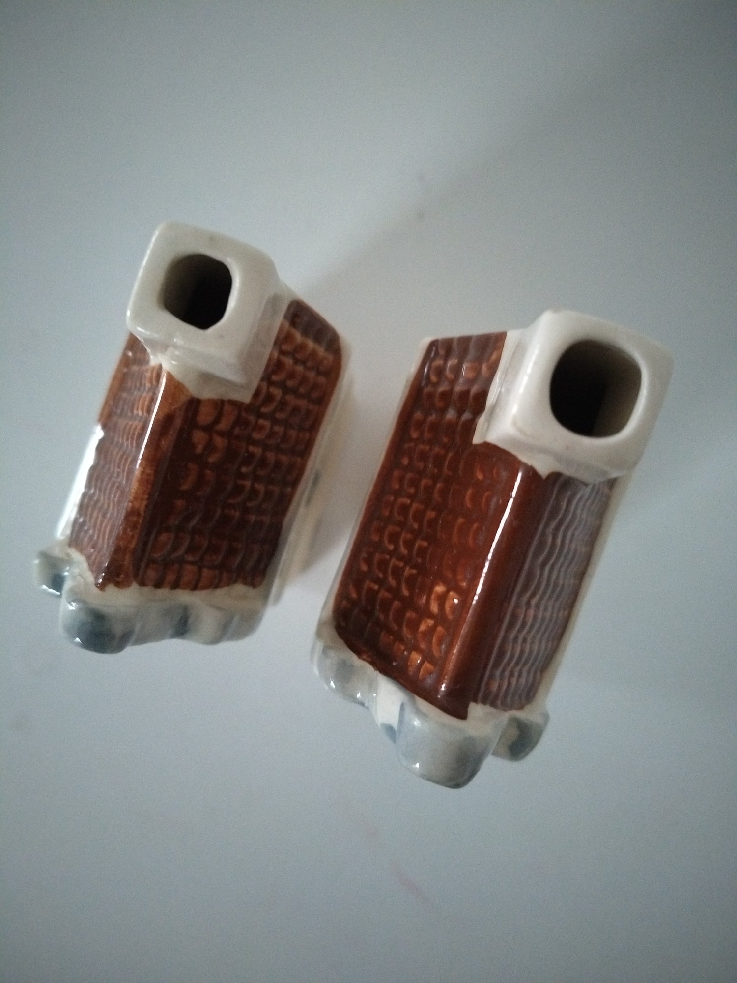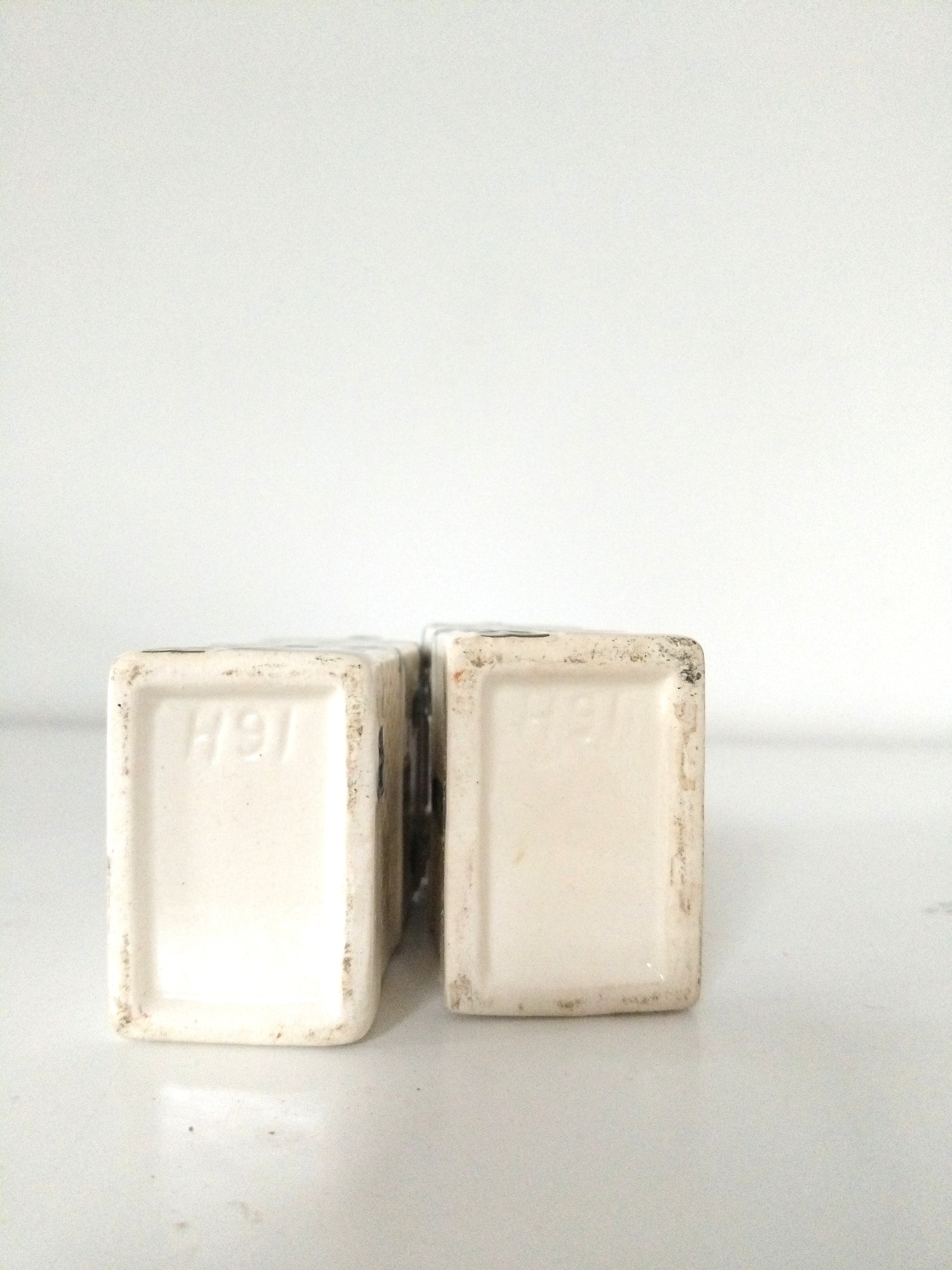 Porcelaine, vides, ce ne sont pas les KLM mais très similaires - une a une micro fissure sur l'arrière de la cheminée (sans aucune gravité et à peine perceptible) ainsi qu'un peu d'usure sur les coins, cf photos - 12,3x3,8 et 11,8x 3,5cm (pourtant bien le même modèle)