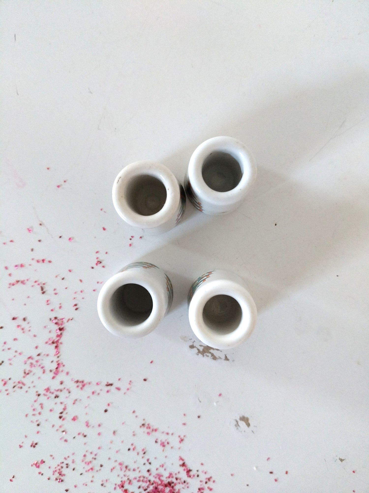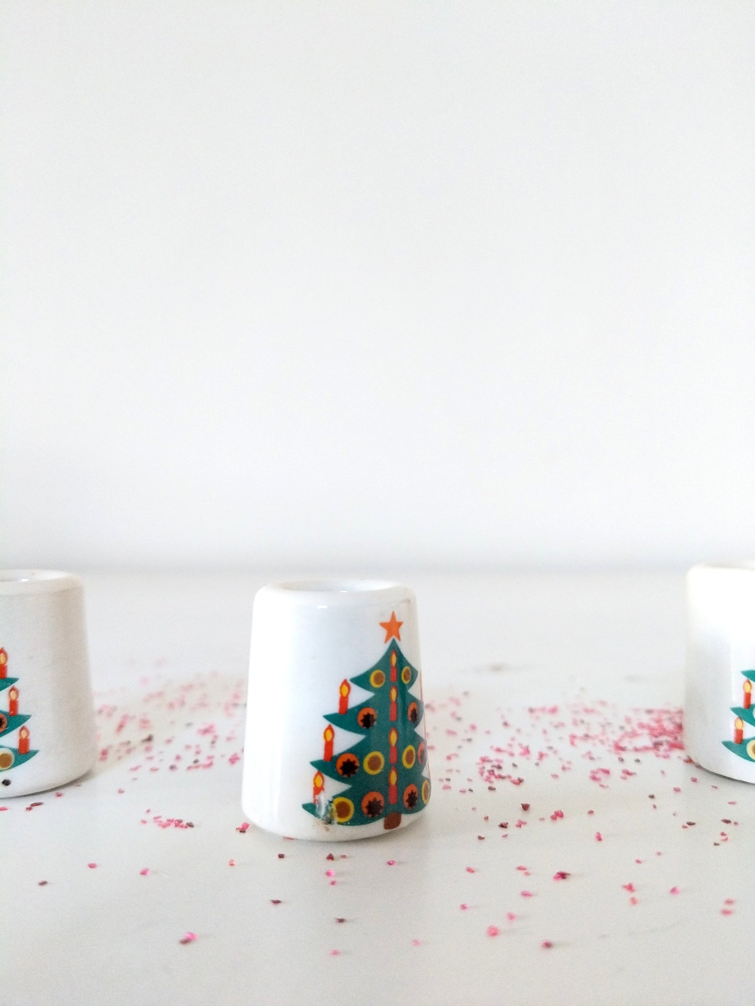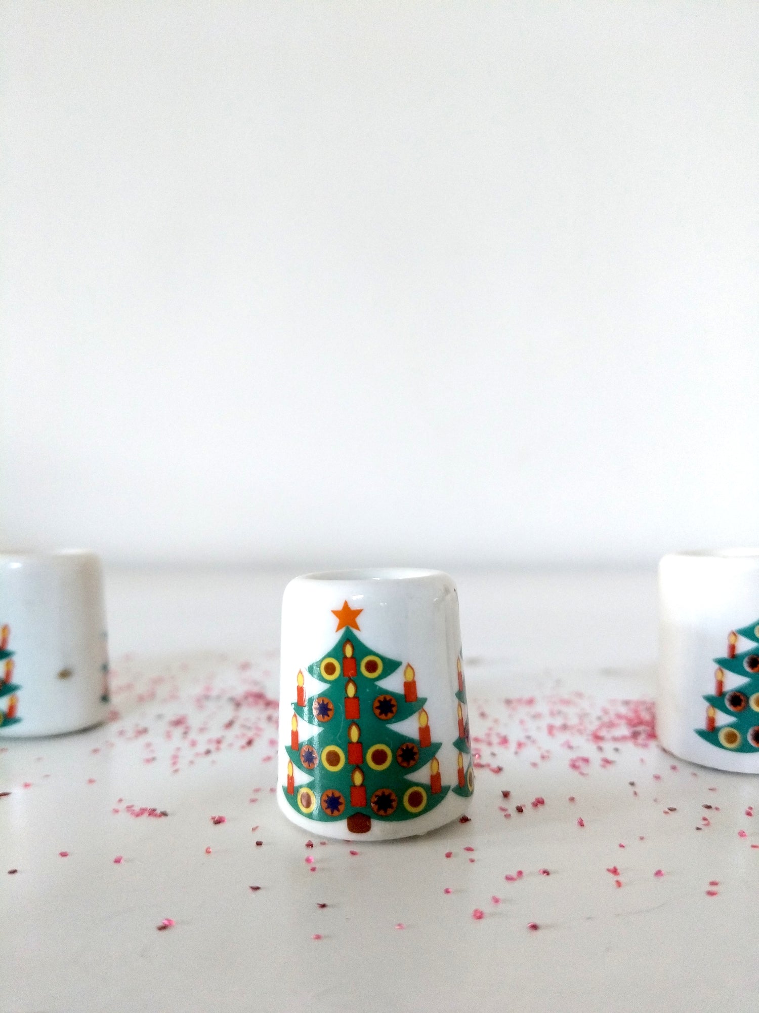 Porcelaine - petites marques dans les décors/ imperfections dans la porcelaine et un a deux micro éclats sur la base. Deux contiennent 4 sapins dans le décor et sont marqués Germany, les deux autres ont deux sapins et pas de marquage - 3cm de hauteur.