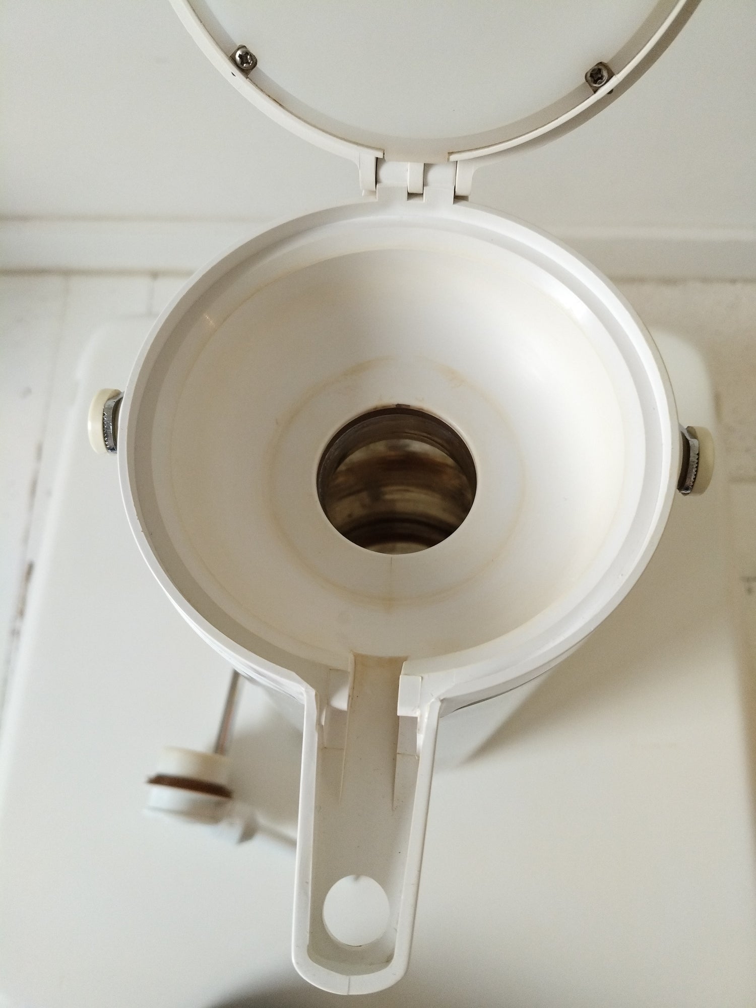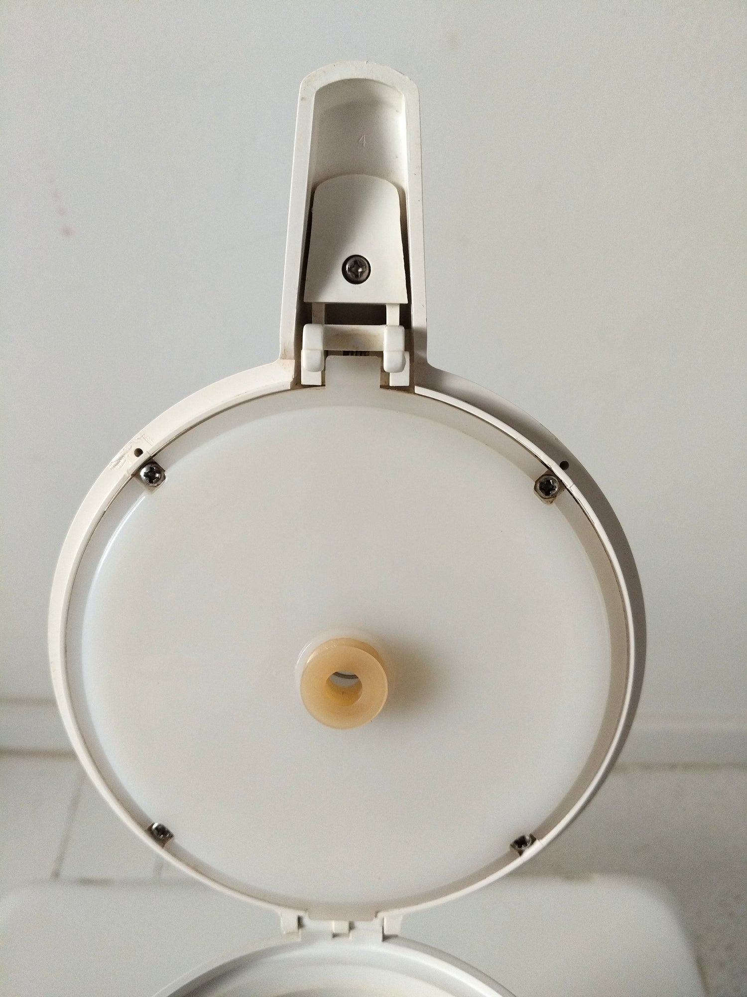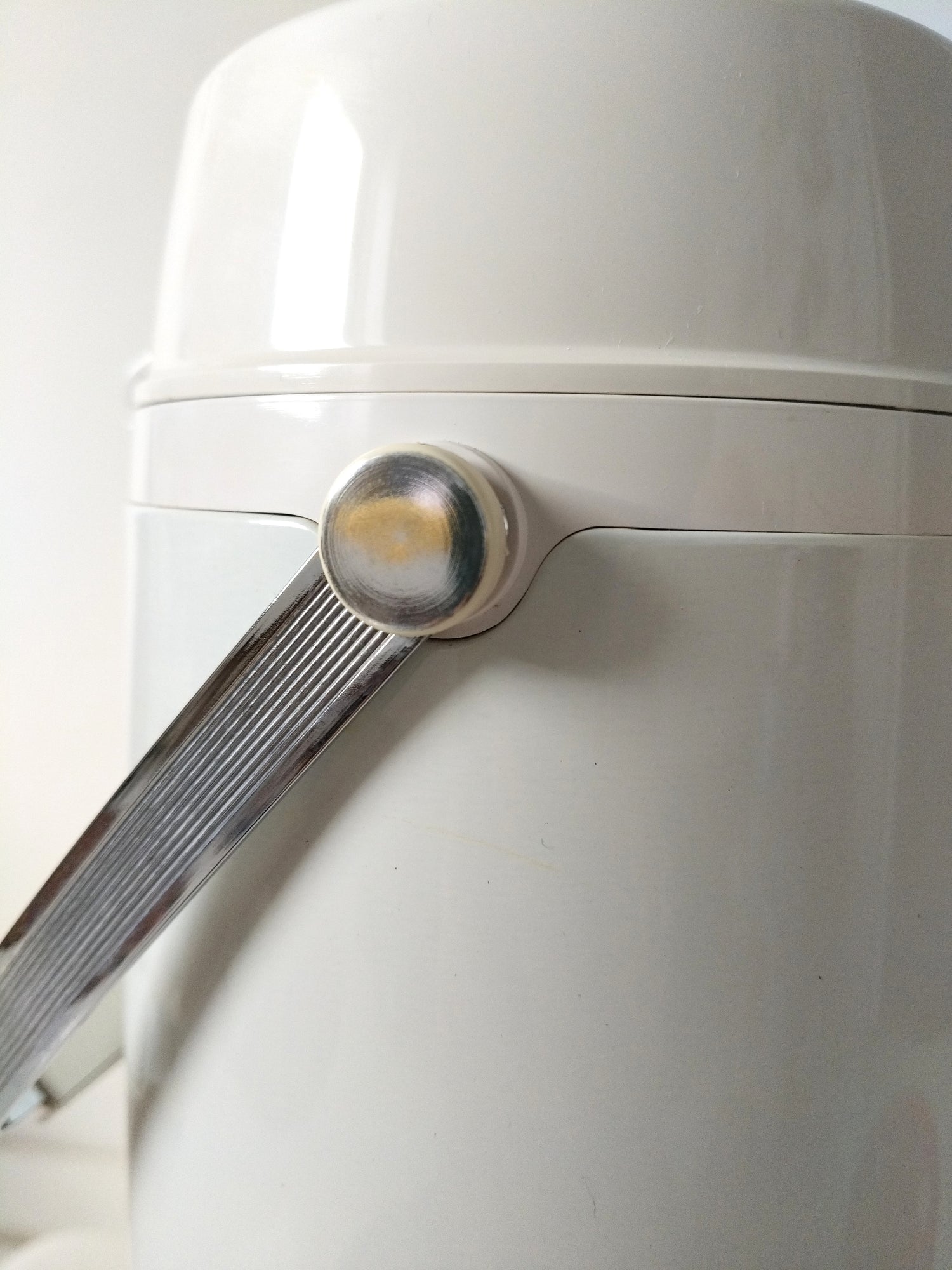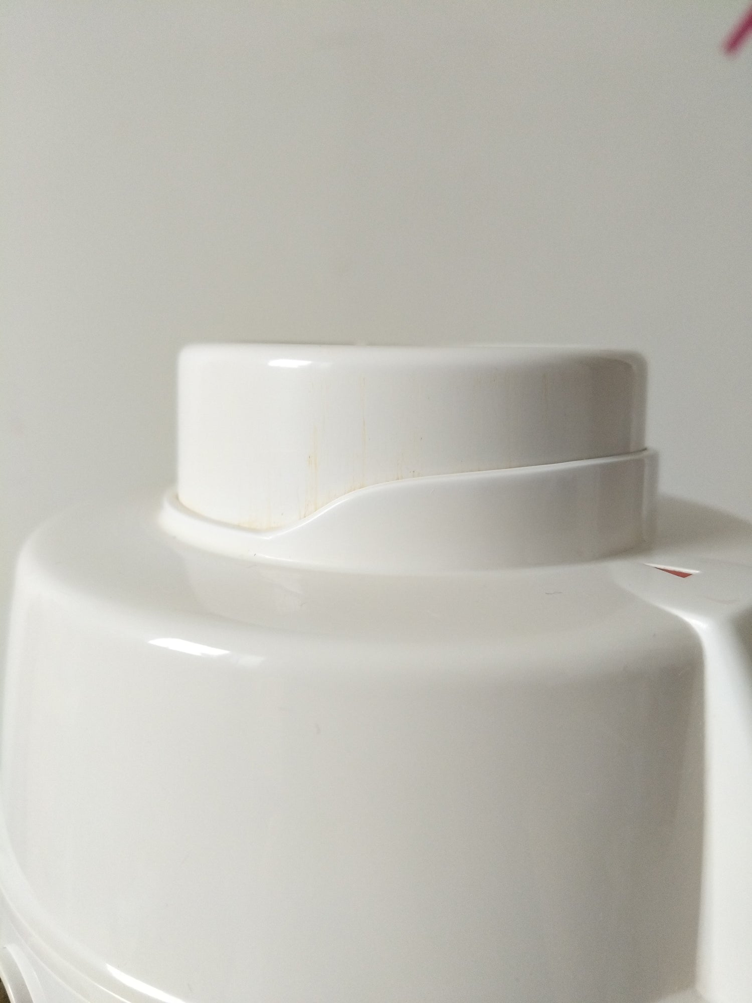 Plastique et métal - grande contenance de 2,5l avec base pivotante - très bel état extérieur, avec quelques très petites marques d'usage. Le décor est superbe et intact. Quant au reste, il s'agit surtout de colorations de caféine ça et là, cf photos. Soigneusement nettoyé, parfait état de marche.