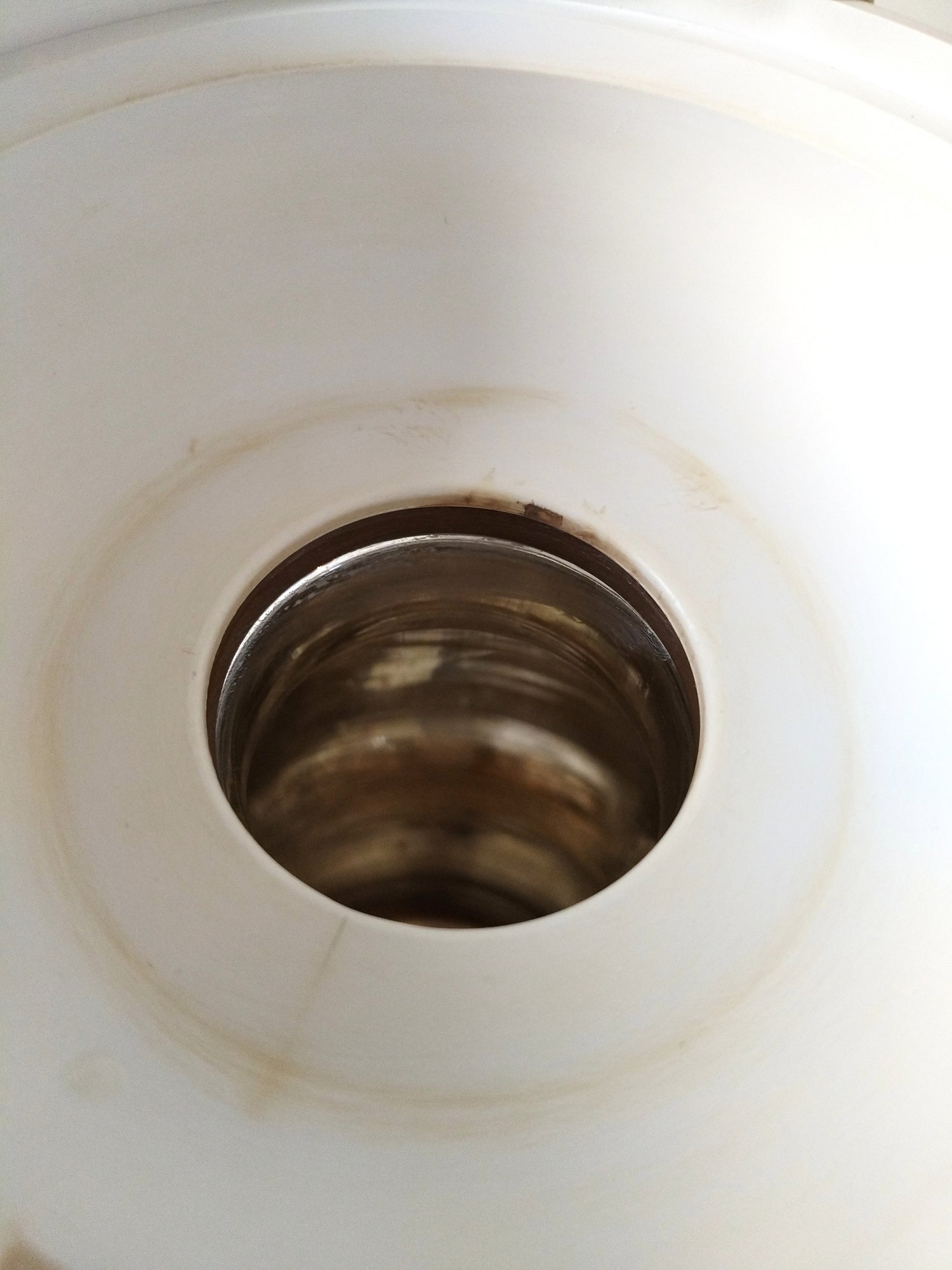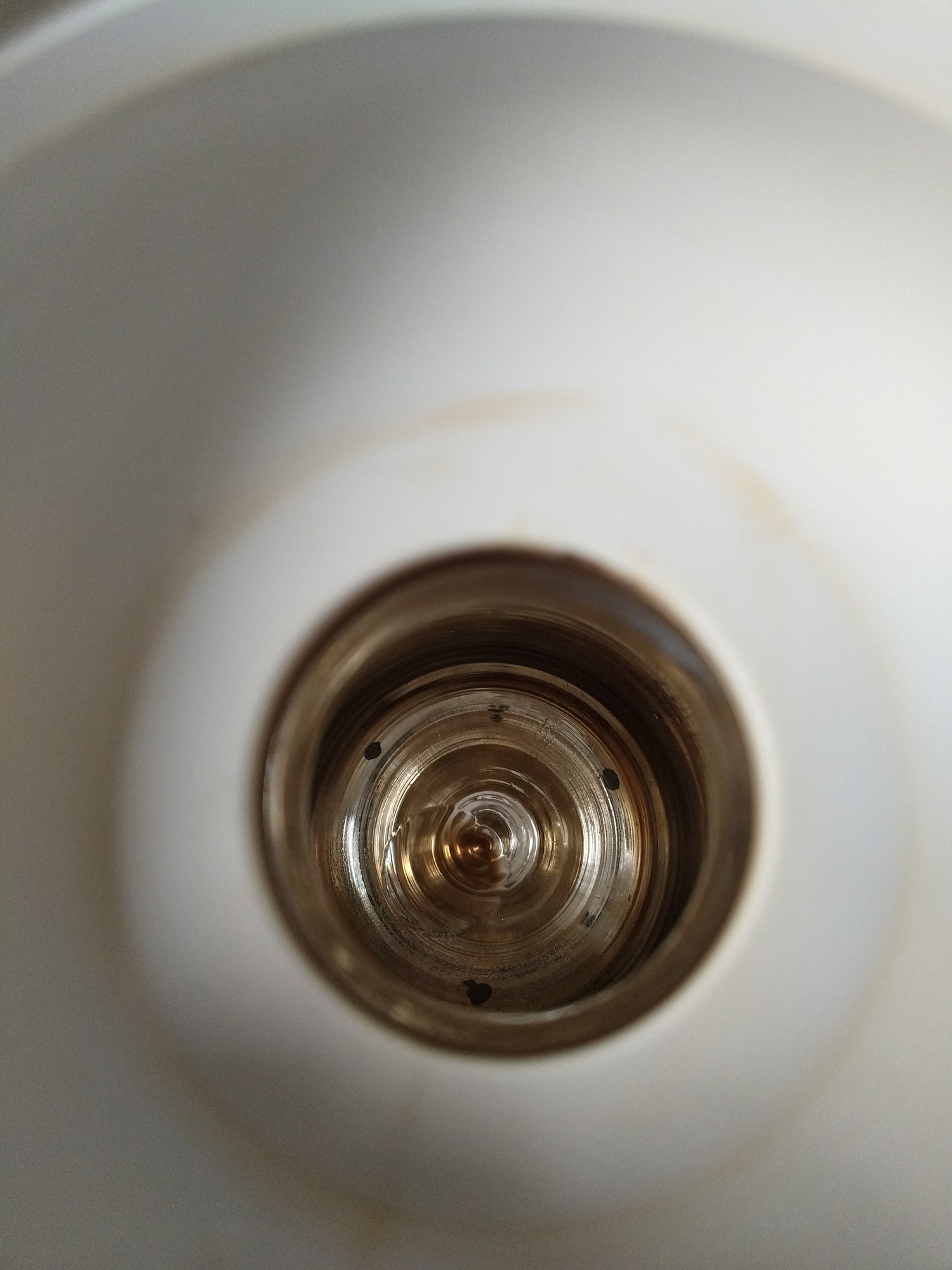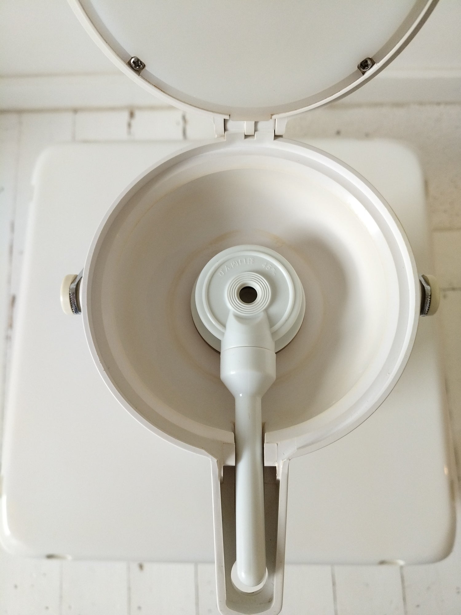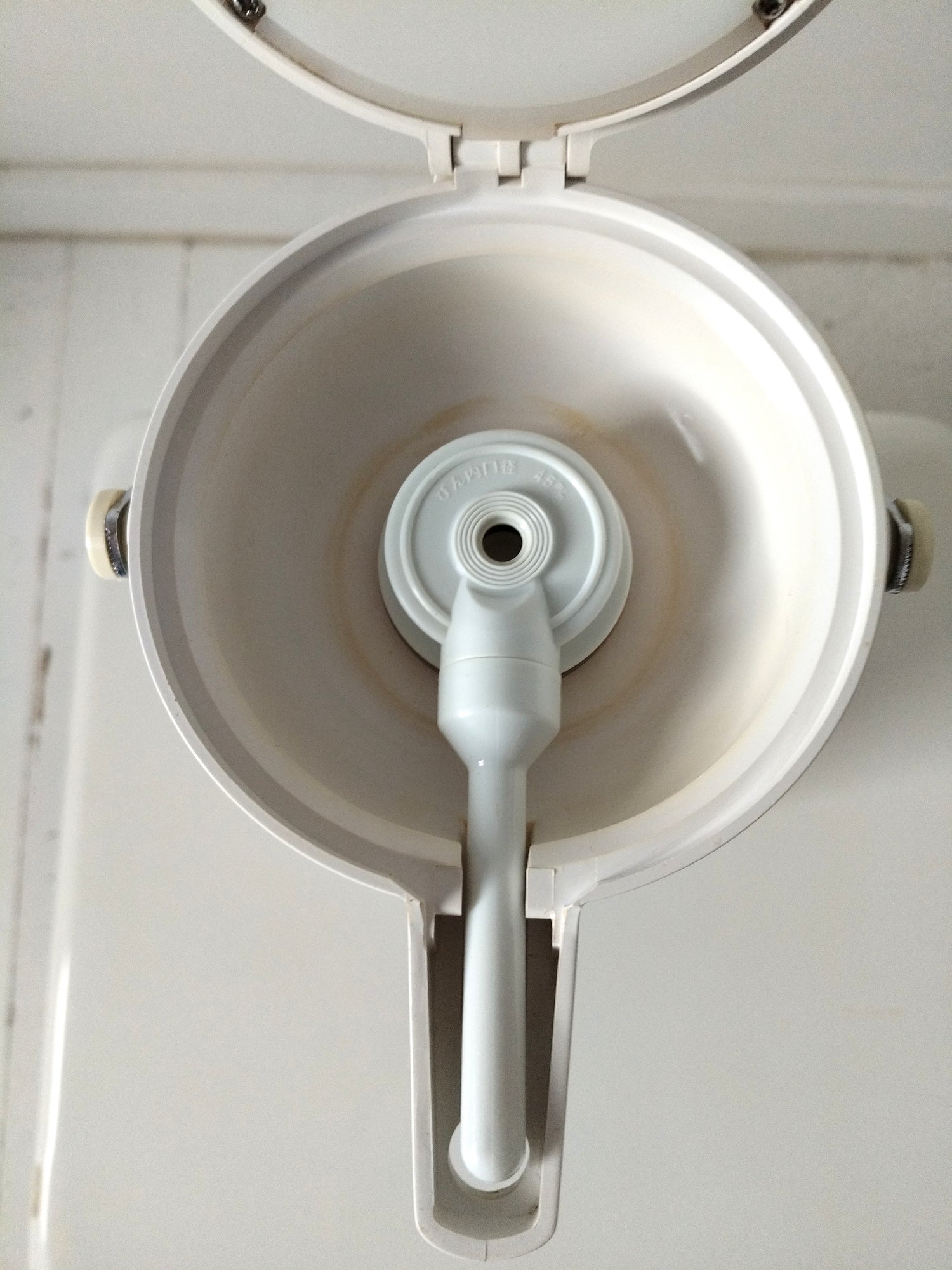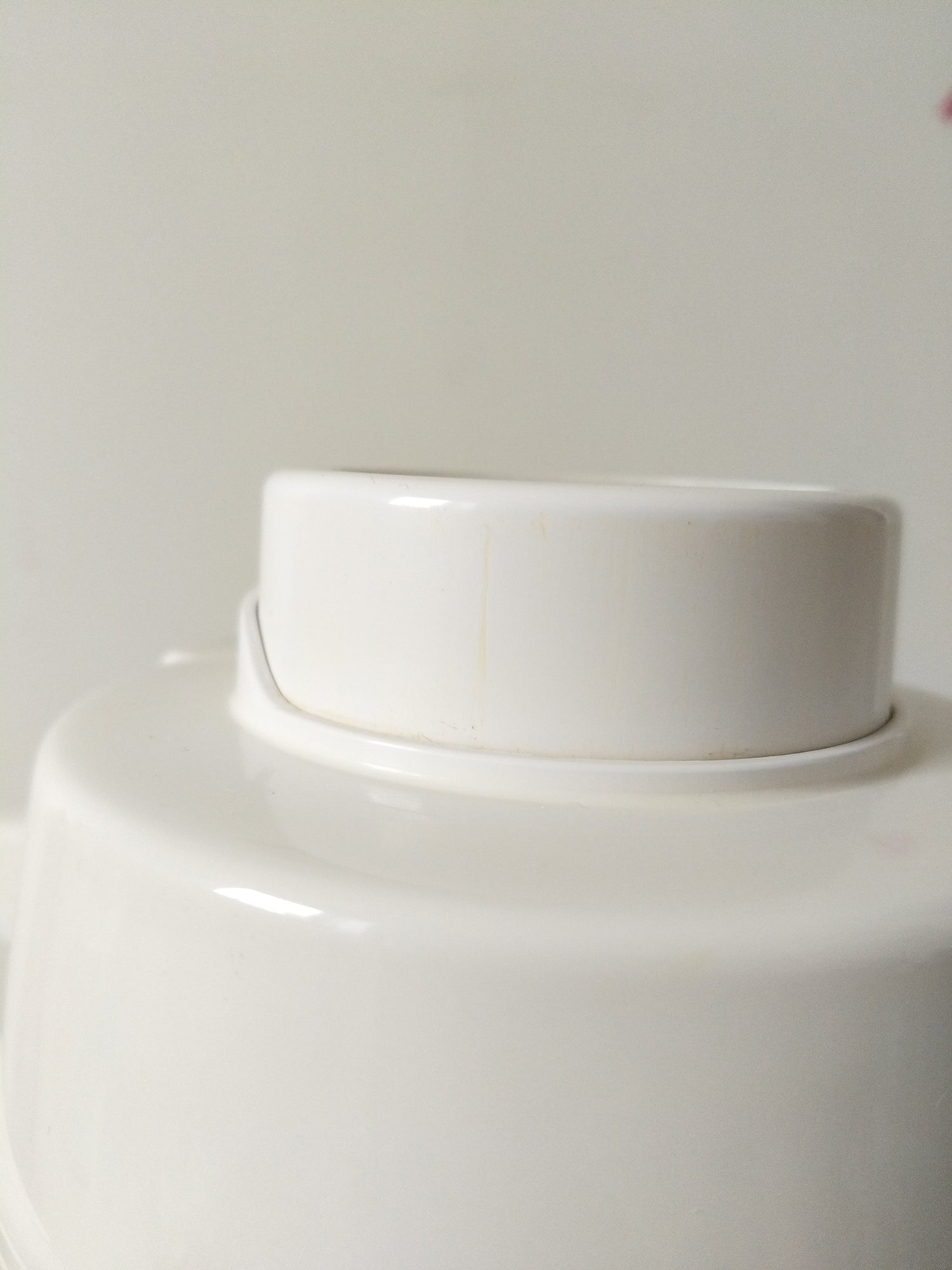 Plastique et métal - grande contenance de 2,5l avec base pivotante - très bel état extérieur, avec quelques très petites marques d'usage. Le décor est superbe et intact. Quant au reste, il s'agit surtout de colorations de caféine ça et là, cf photos. Soigneusement nettoyé, parfait état de marche.