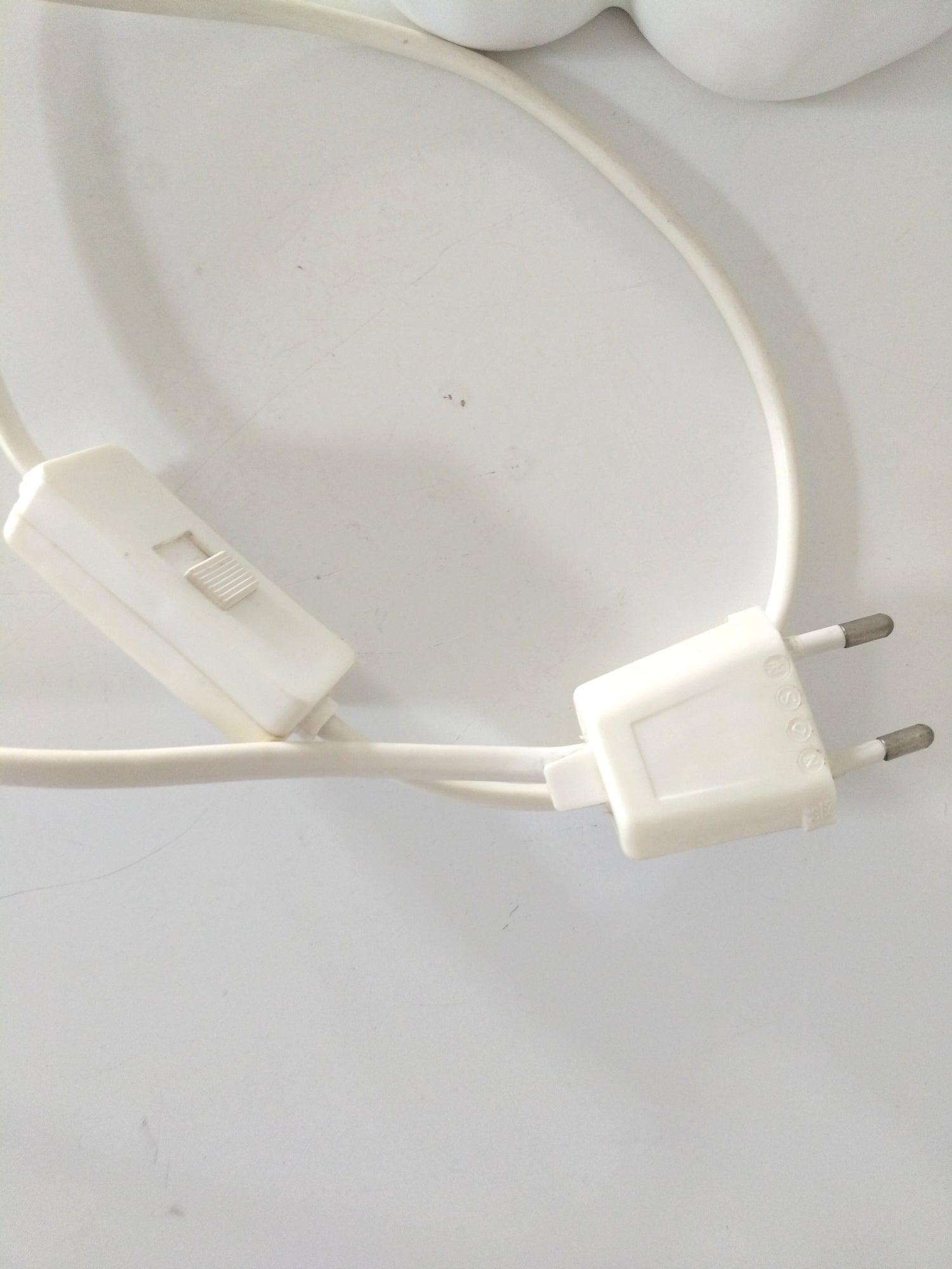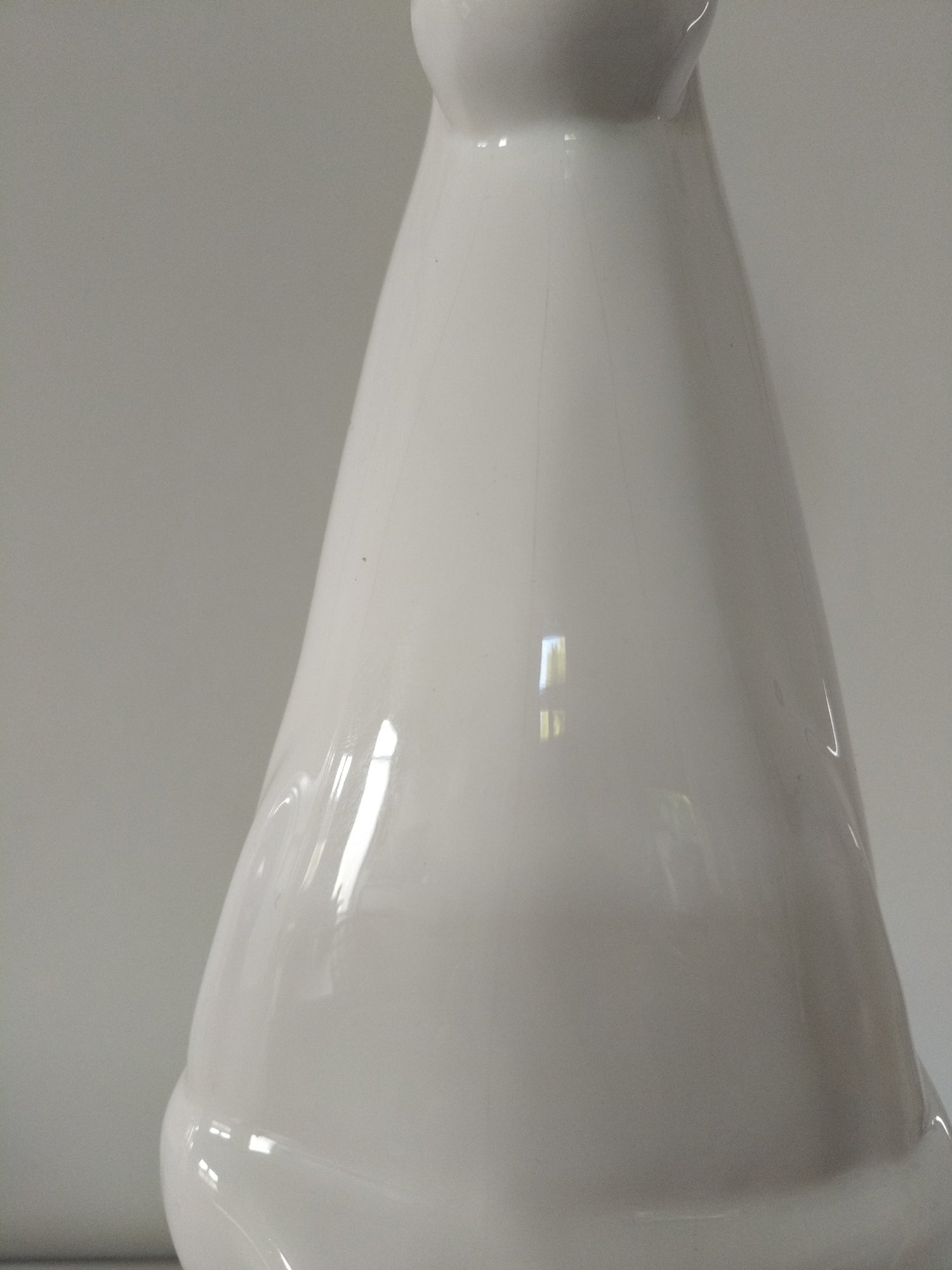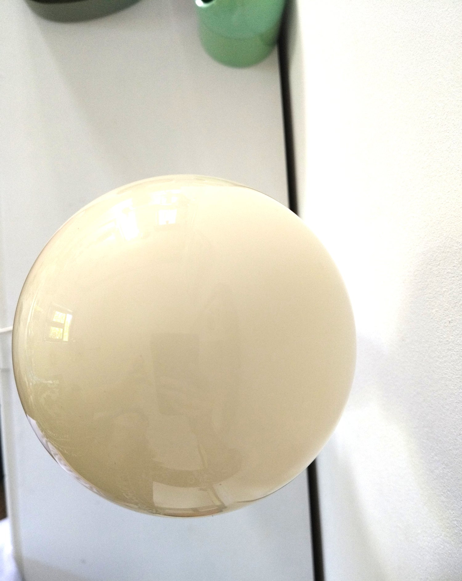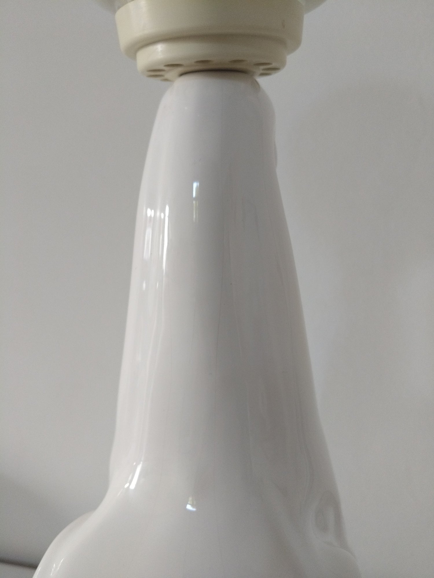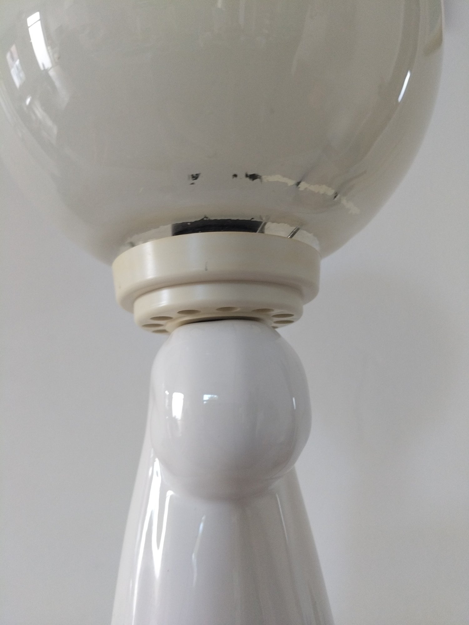 Céramique, globe en verre - fines craquelures dans la céramique, manques de de blanc sur le bas (intérieur) du globe (pas sur tout le tour et il est mobile donc possibilité de réduire la visibilité selon position de la lampe), petites marques sur la petite pièce en plastique et probablement coloration (homogène) liée au à l'âge, le globe peut-être aussi? Ou blanc différent d'origine - 54cm de hauteur globe inclus, le globe fait +- 13cm de diamètre et la base fait +- 15,5cm au plus large.