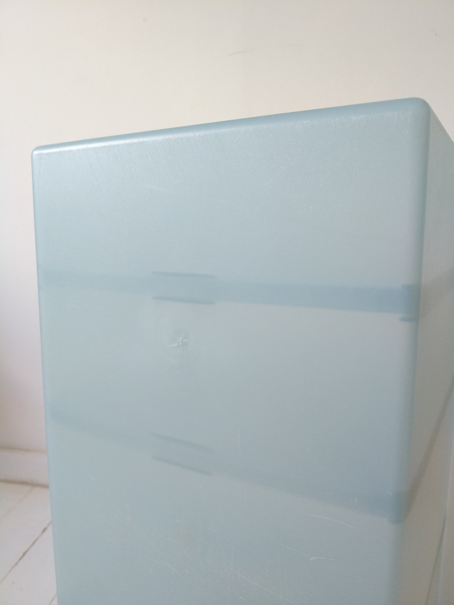 Tout plastique, planches amovibles - très bel état, quelques rayures superficielles, un petit point nous sur une planche (dans la plastique, fort probablement là depuis toujours) dos plus marqué (frottements) et petites fragilités sur une des barres (celle du dessus) de soutien de la dernière planche, cf photos. Aucun manque, aucun risque, aucun impact sur sa tenue et son utilisation et très discret de par la localisation! - 35,7cm de largeur 67cm de hauteur et 32cm de profondeur.