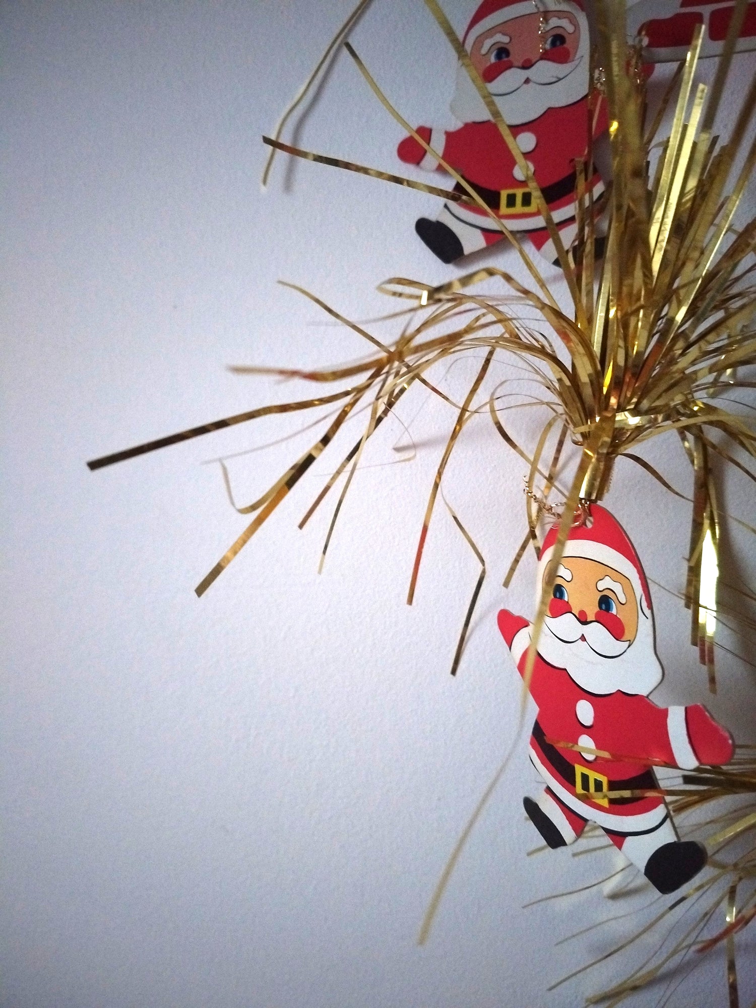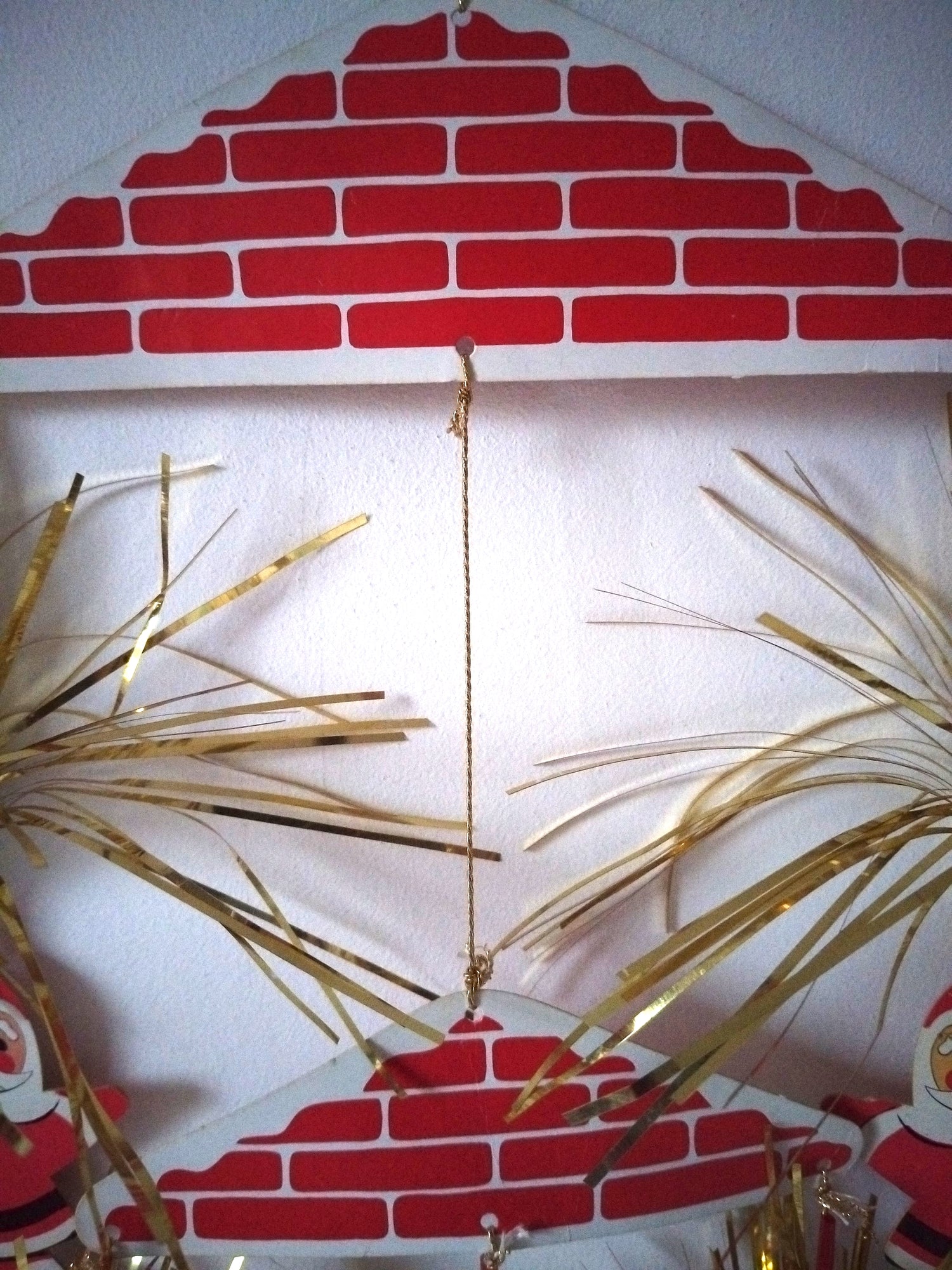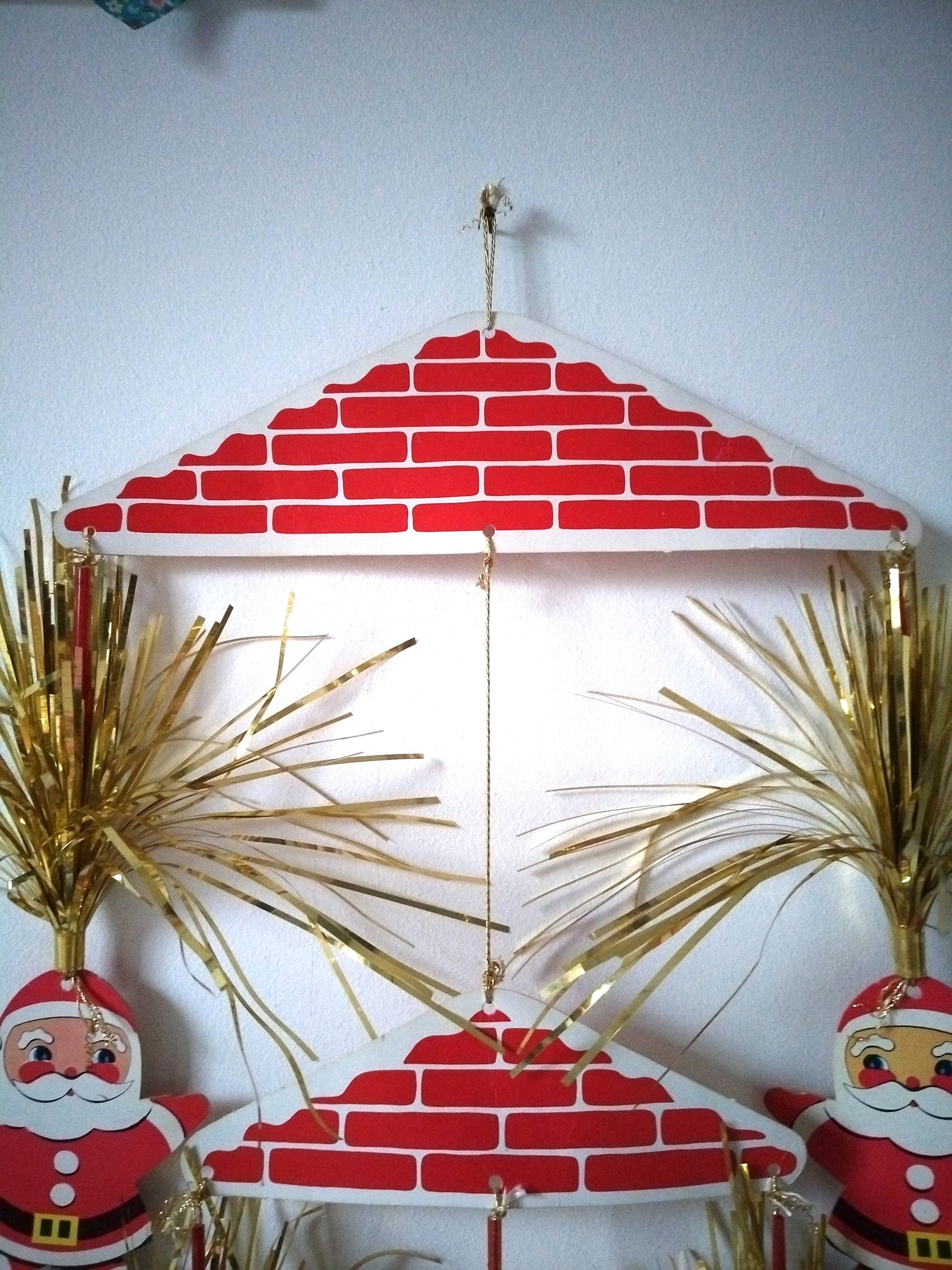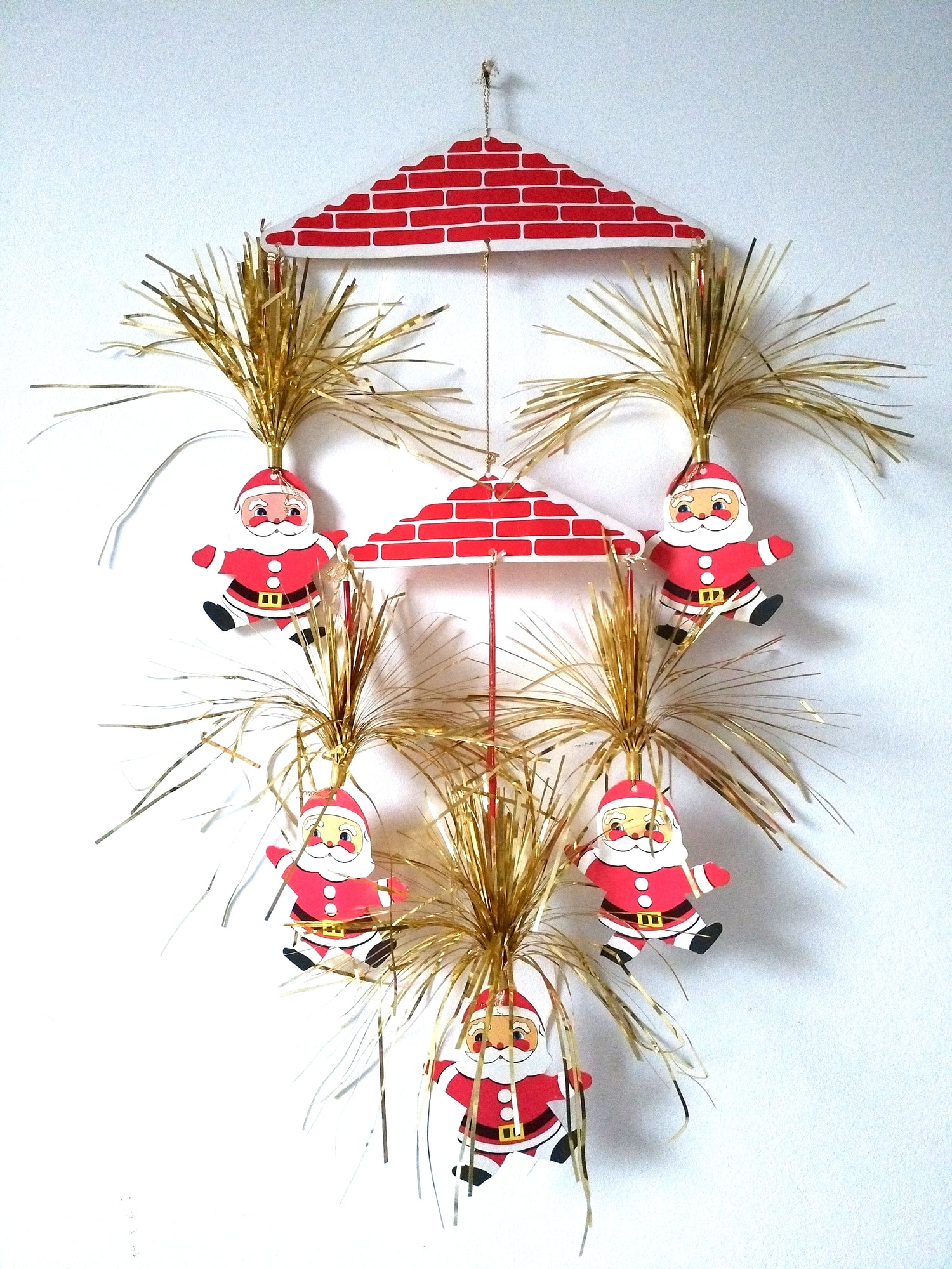 Carton fin - légères souillures/ marques du temps dont plusieurs franges froissées (surtout d'un père Noël), cf photos. Je vais essayer de les aplatir avant l'envoi. 53cm de longueur totale
