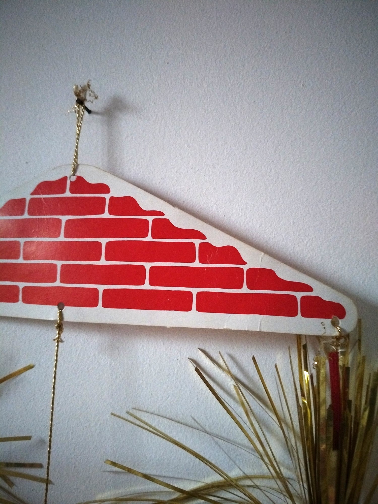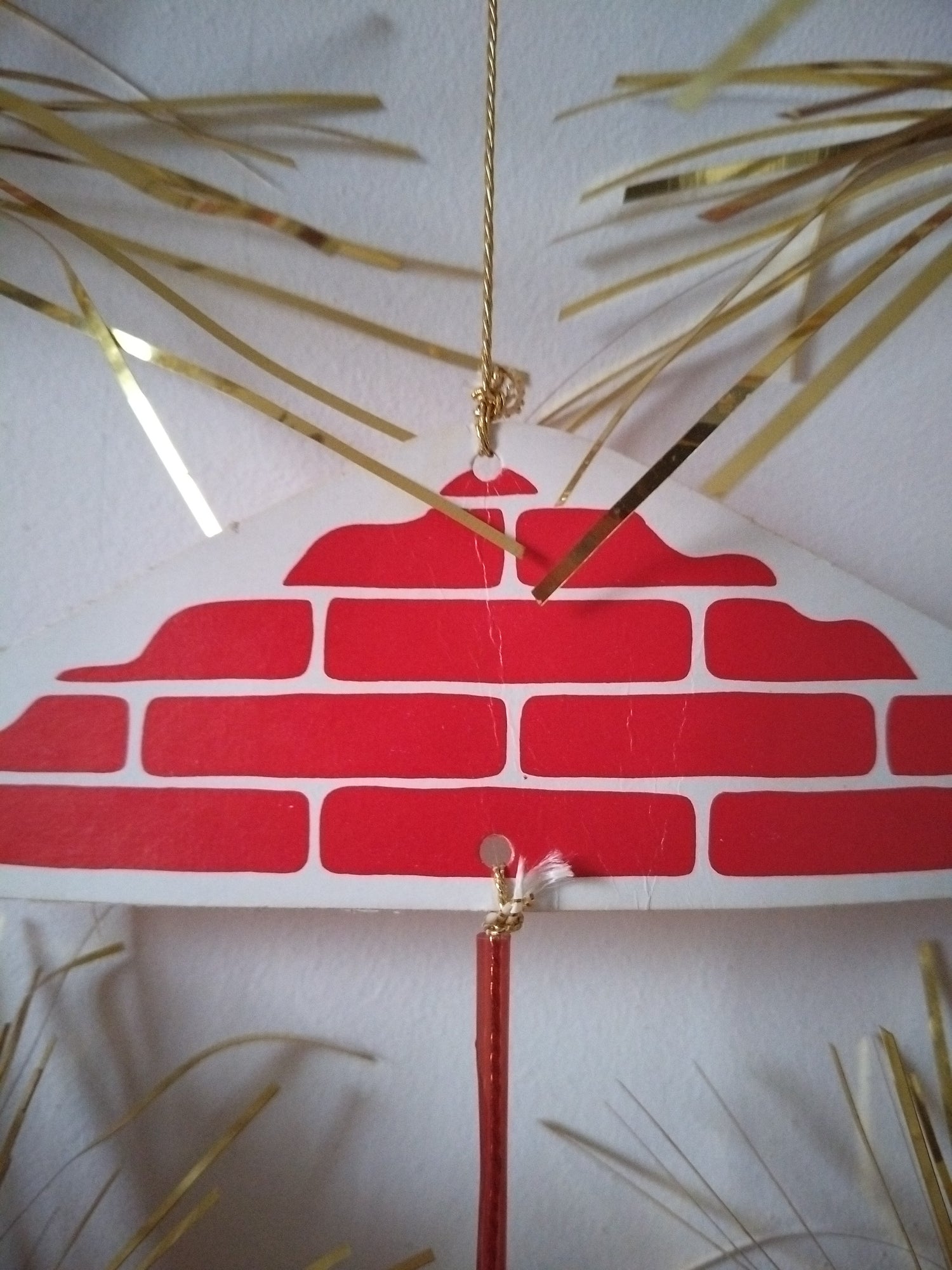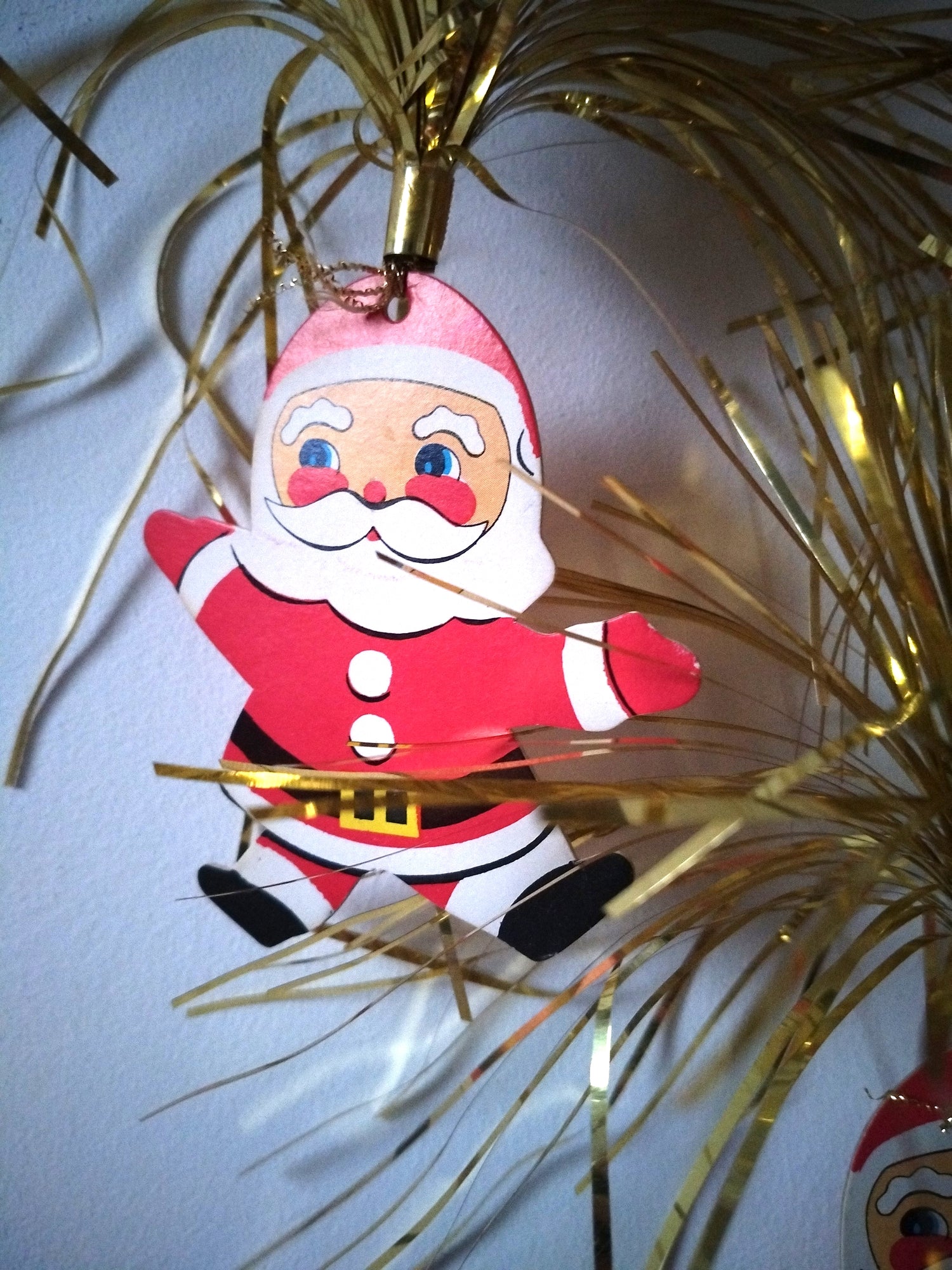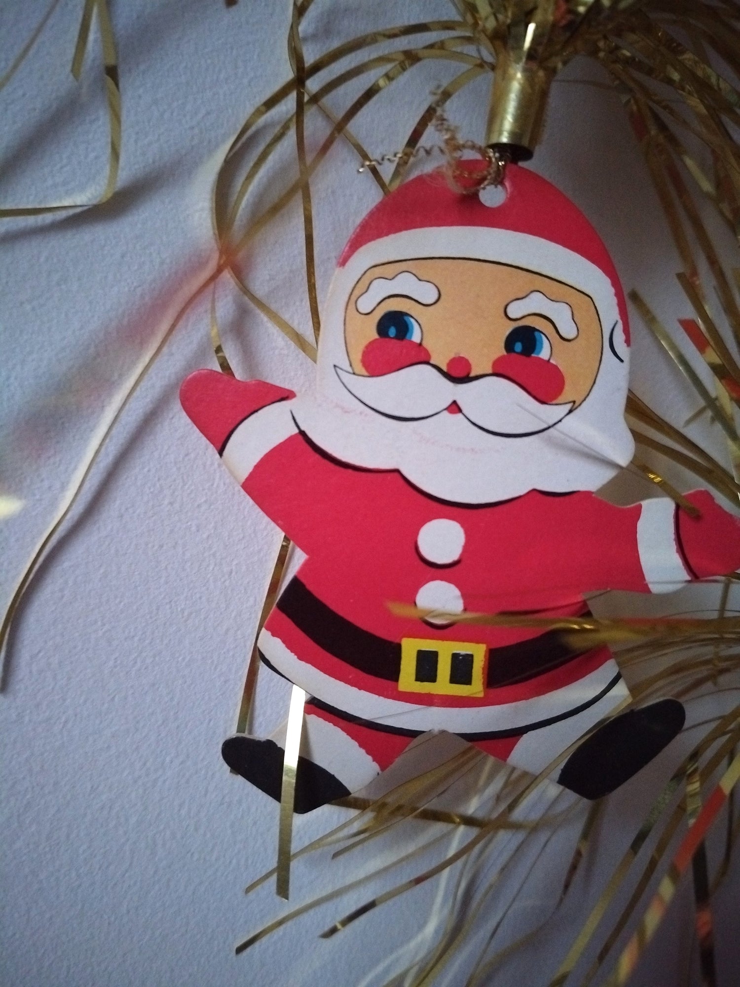 Carton fin - légères souillures/ marques du temps dont plusieurs franges froissées (surtout d'un père Noël), cf photos. Je vais essayer de les aplatir avant l'envoi. 53cm de longueur totale