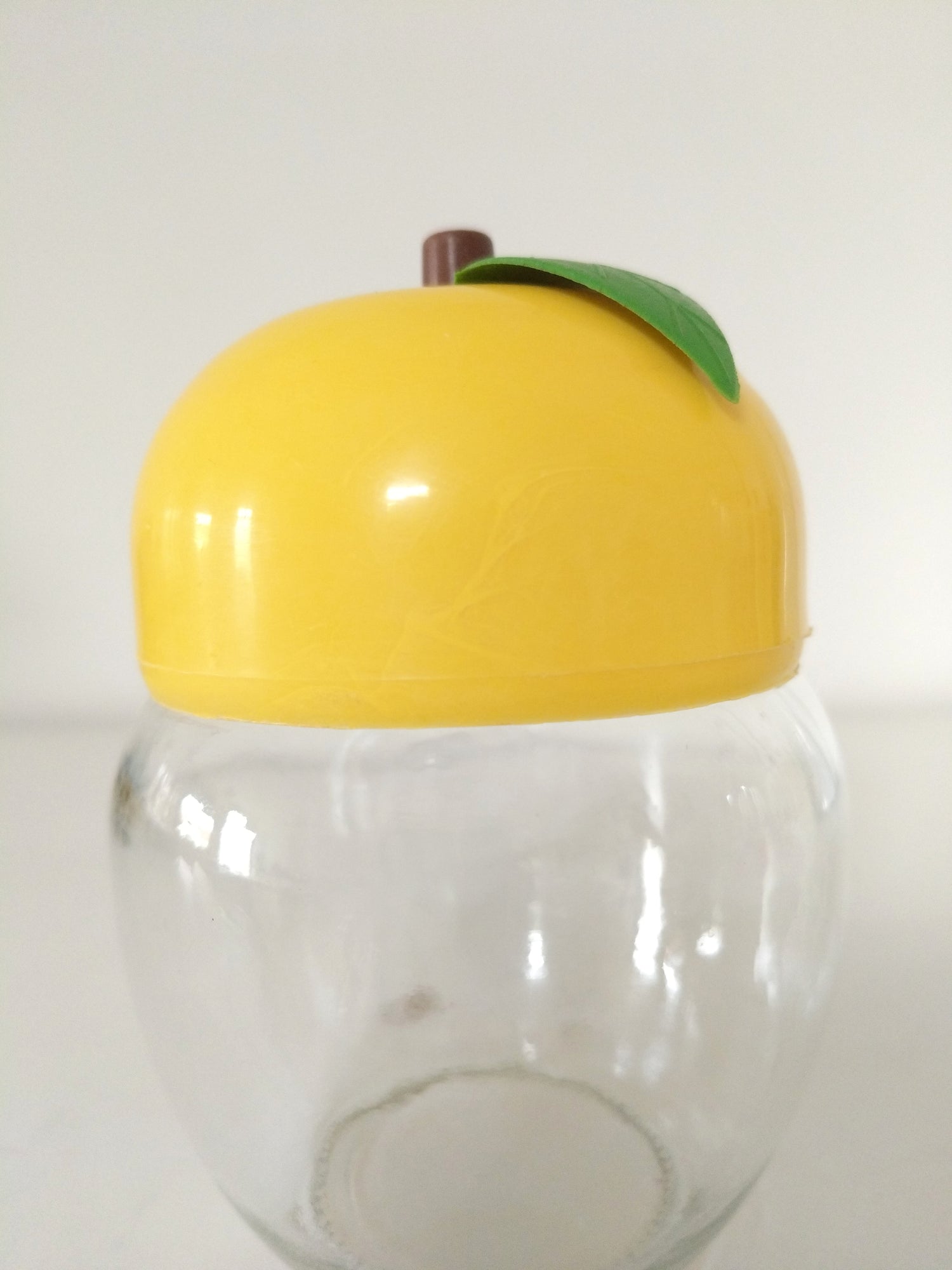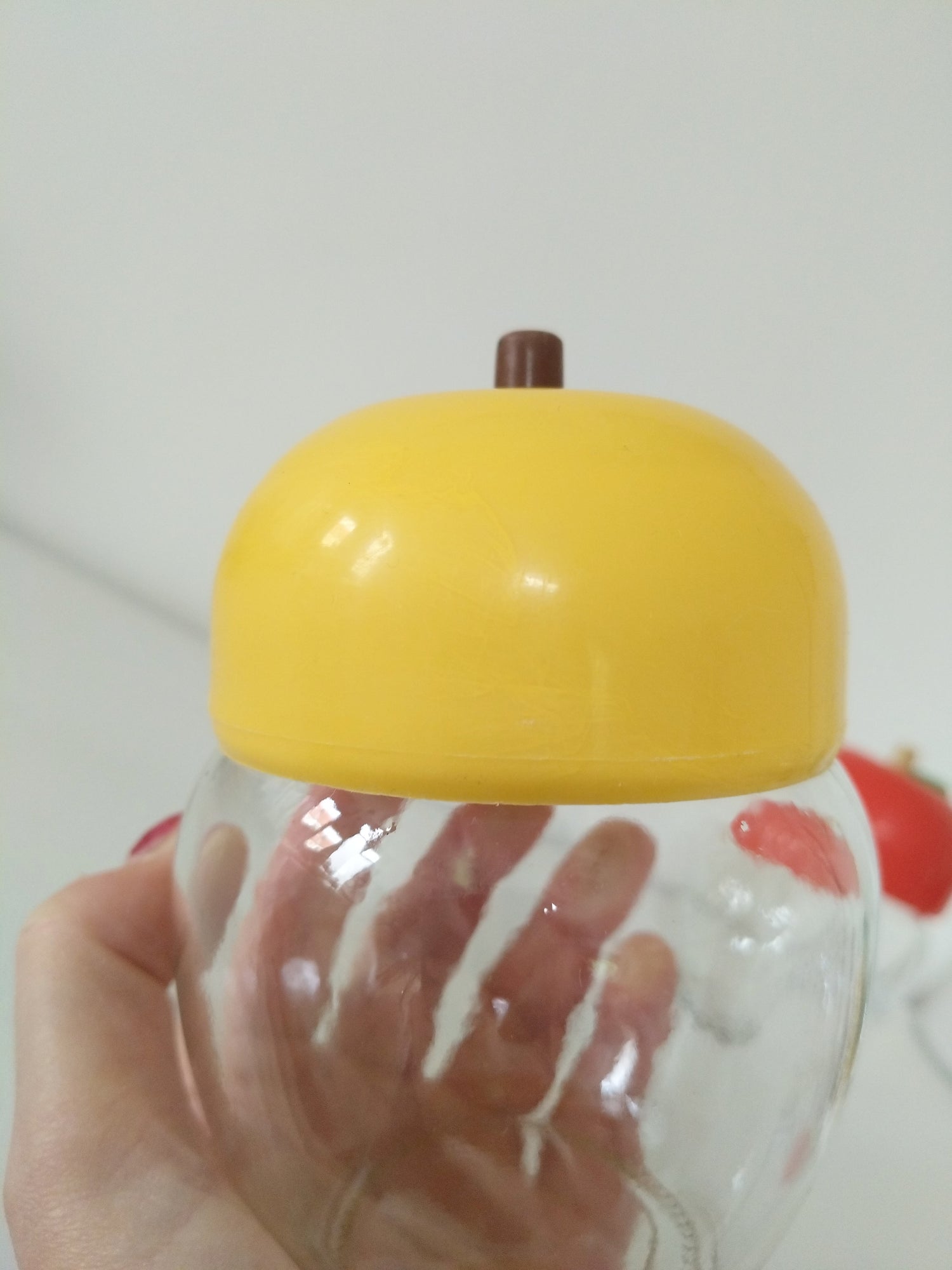 Verre et plastique - très bel état d'epoque, très petites marques d'usage + micro imperfection commune sur le couvercle + sur le jaune, quelques nuances dans la couleur, cf photos - 11,5cm de hauteur sans la queue et +- 8,5cm de diamètre (au plus large)