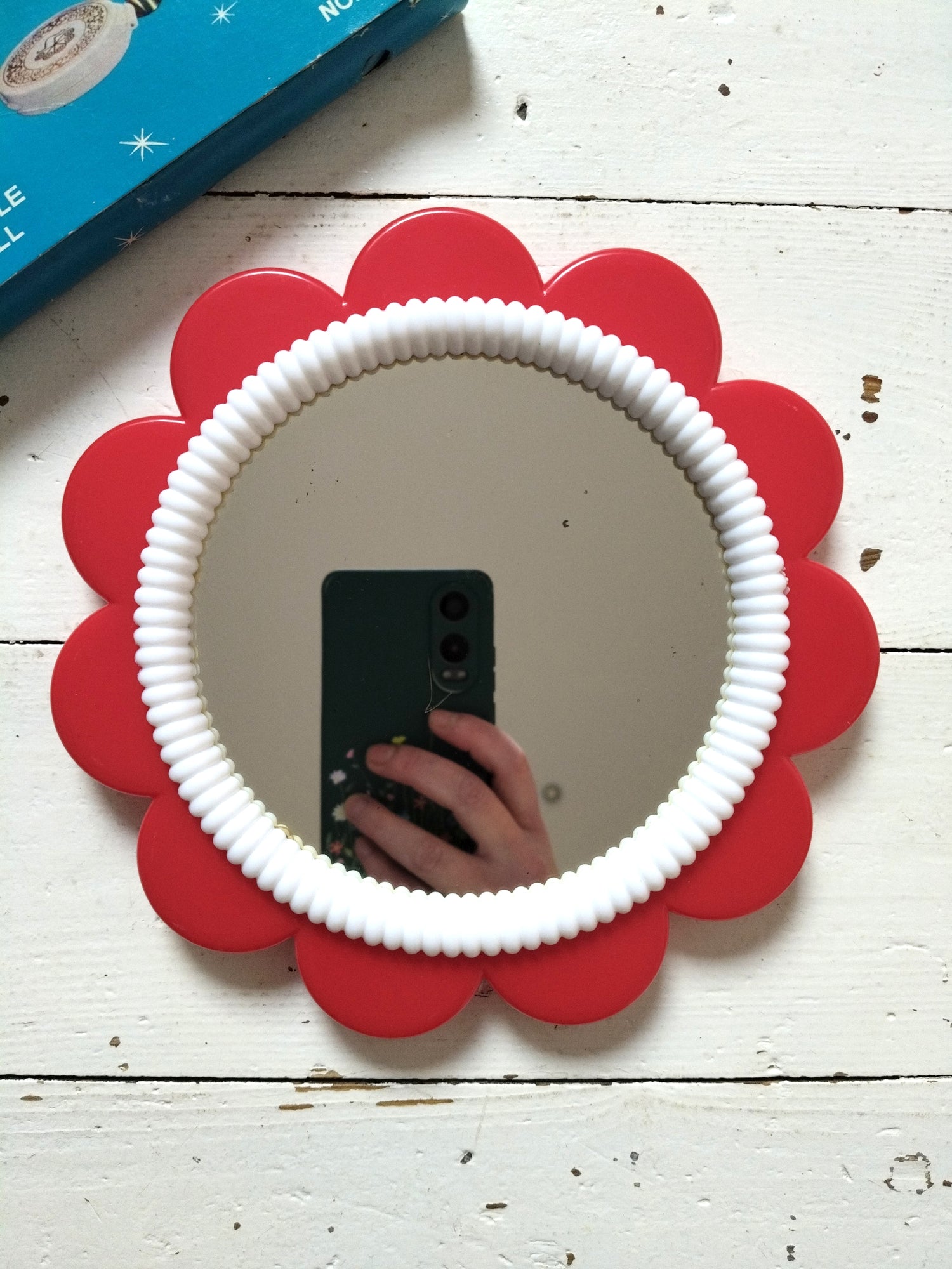 Plastique rouge et blanc et miroir en verre - neuf dans sa boîte d'origine, quelques petites marques sur le miroir et l'une ou l'autre micro sur le plastique - à fixer au mur ou à poser - petit format : 18,5cm de diamètre total.