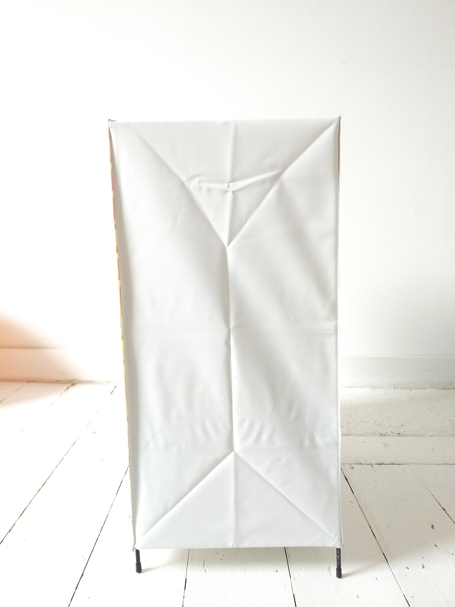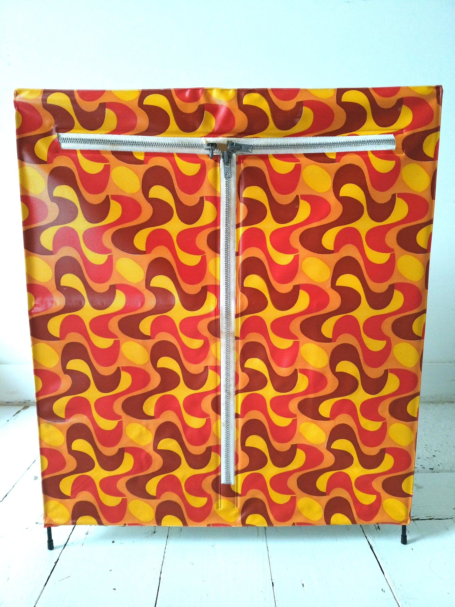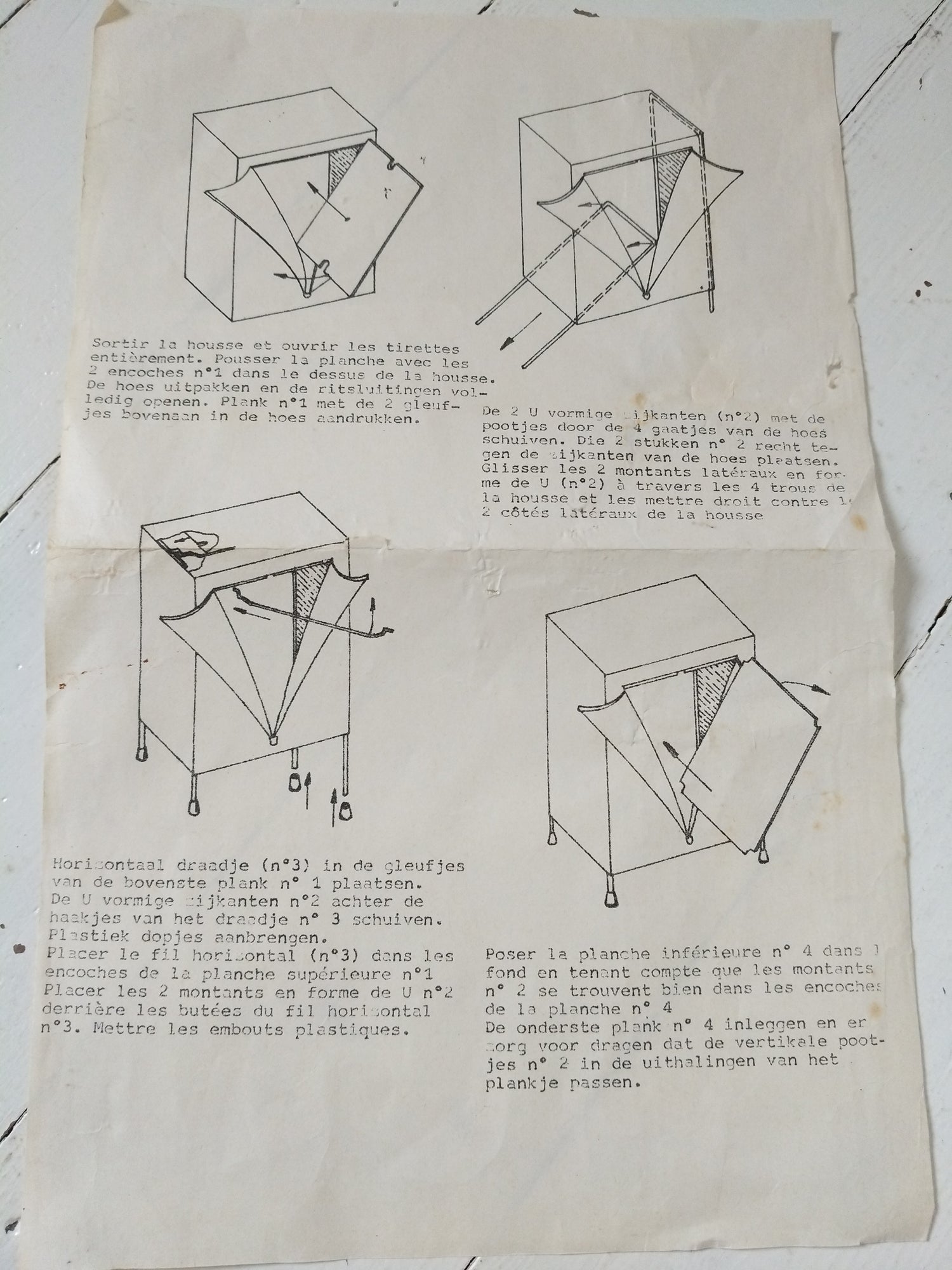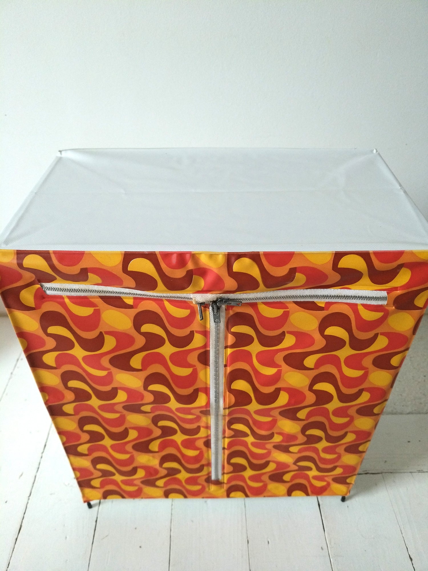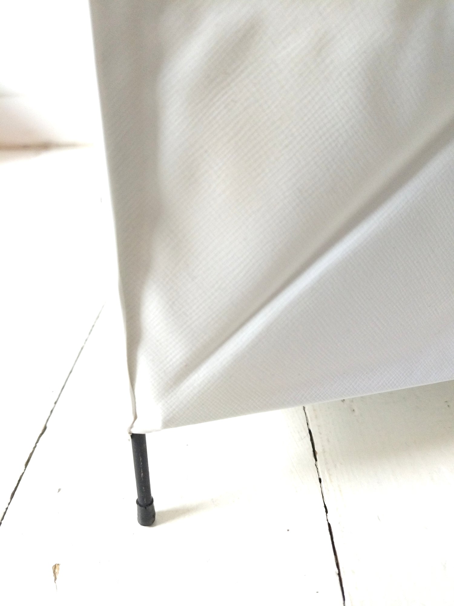 Structure métallique et bois, habillage plastifié - neuf et était emballé. Malgré tout, quelques petites marques de stockage et/ou fabrication, cf photos (dont : coton de la fermeture souillée, micro rupture solidifiée (gauche, bord tirette), 2 embouts de pieds fissurés mais ok pour les placer et ok placés). - 36,5 x 20cm pour 43,5cm de hauteur.