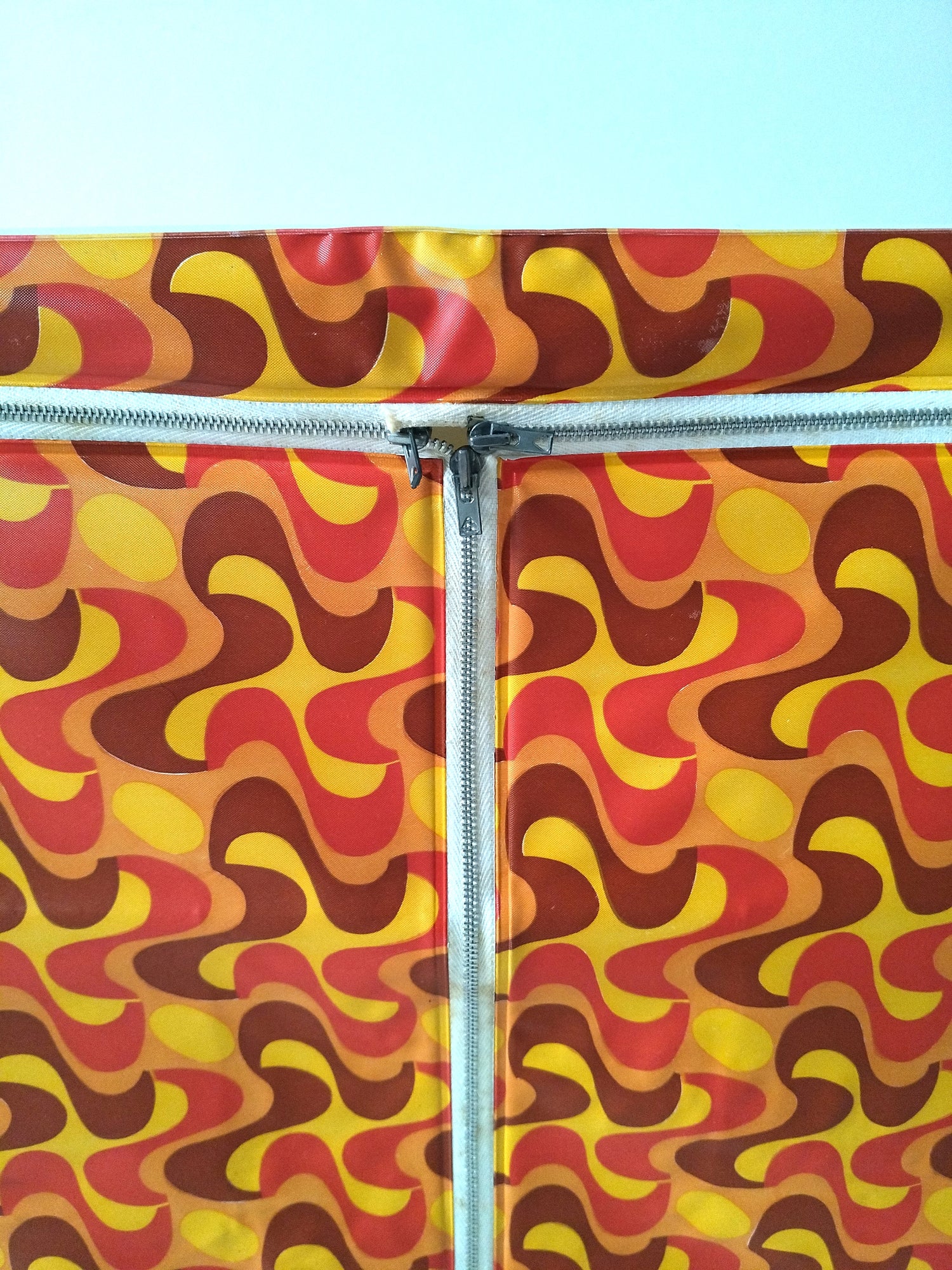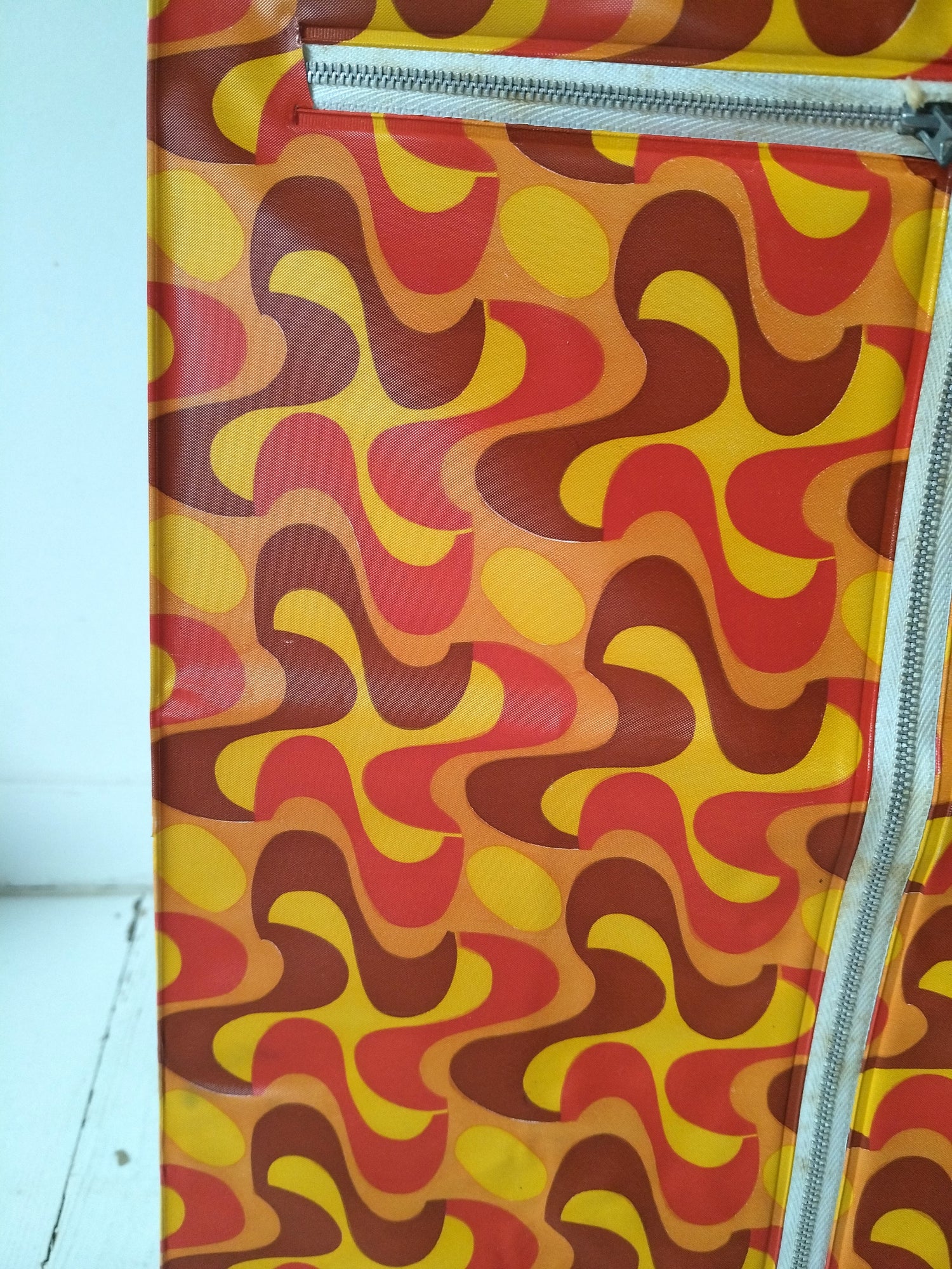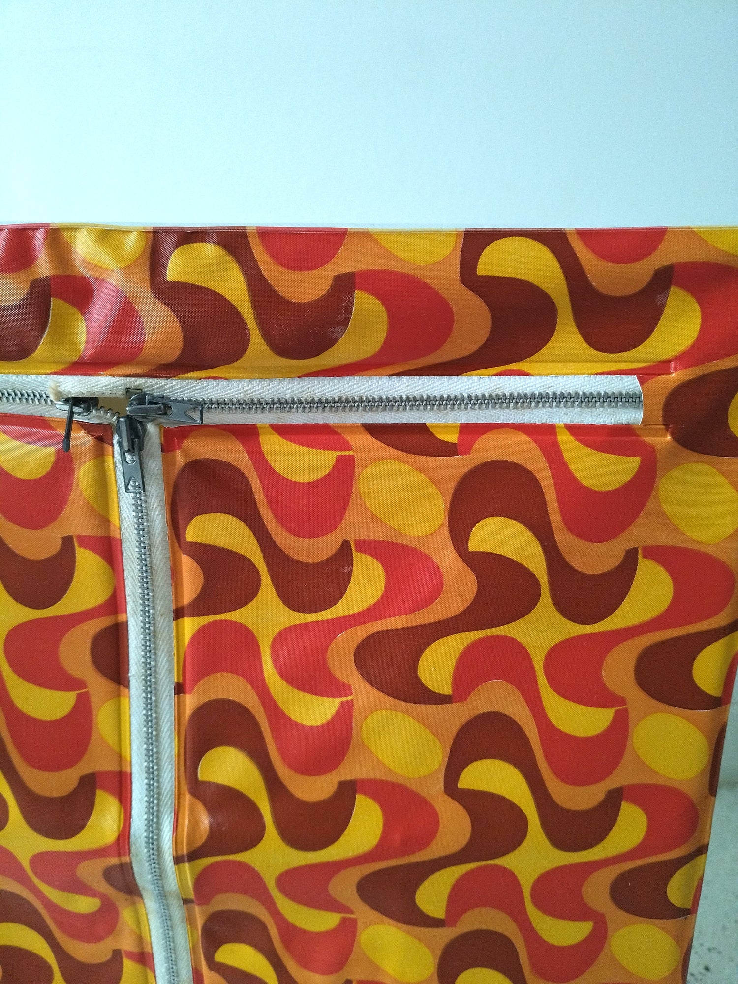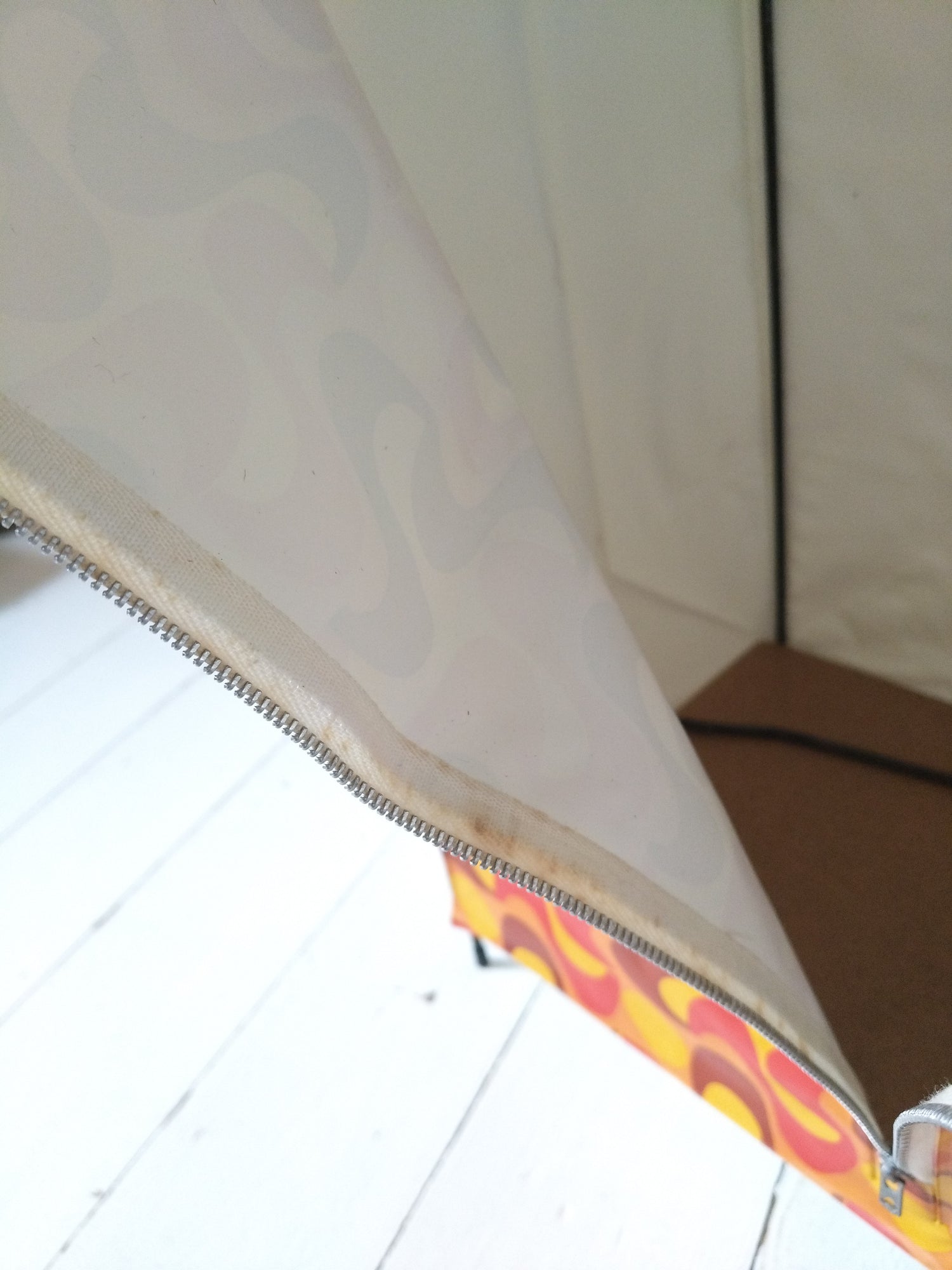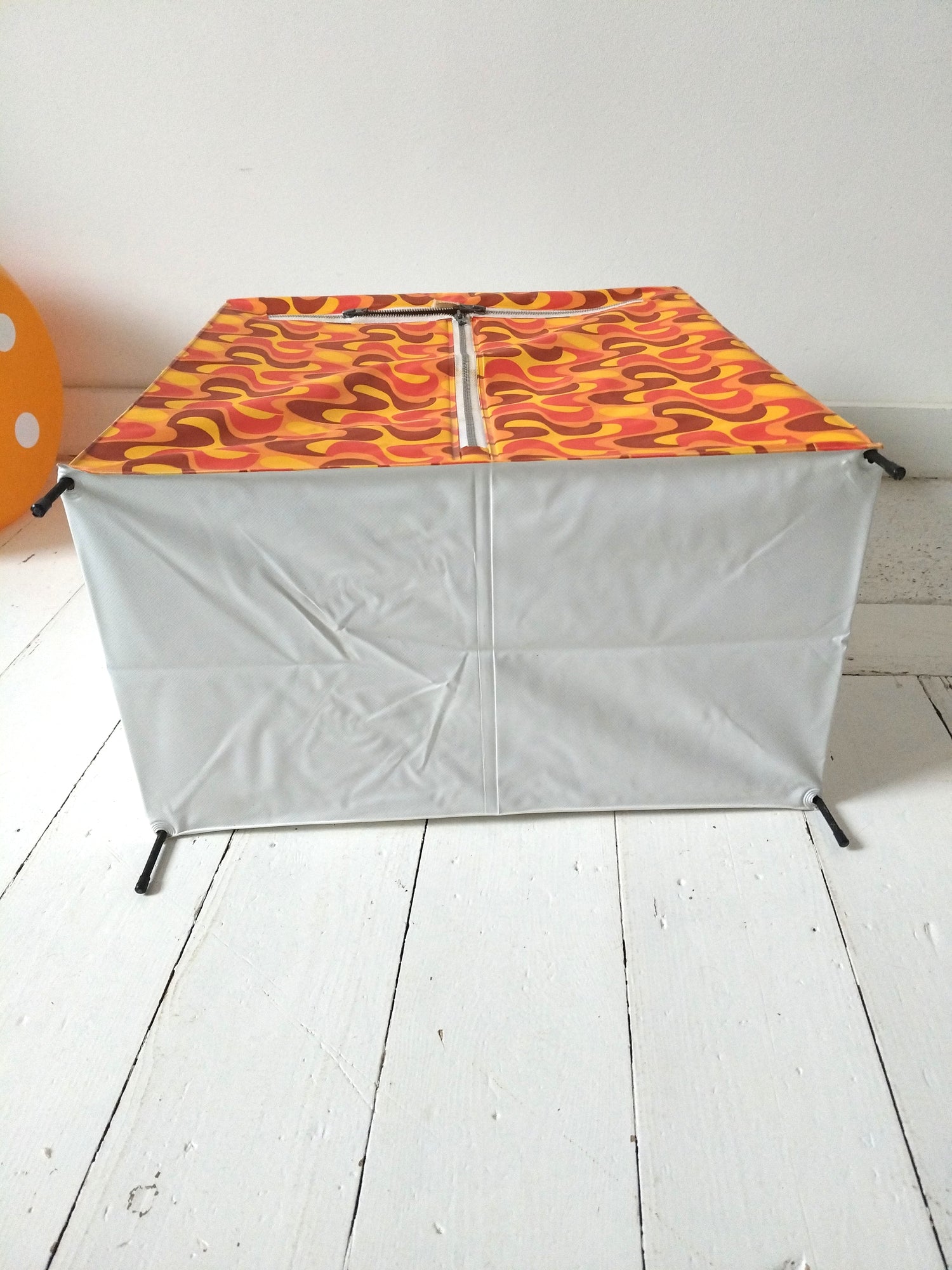 Structure métallique et bois, habillage plastifié - neuf et était emballé. Malgré tout, quelques petites marques de stockage et/ou fabrication, cf photos (dont : coton de la fermeture souillée, micro rupture solidifiée (gauche, bord tirette), 2 embouts de pieds fissurés mais ok pour les placer et ok placés). - 36,5 x 20cm pour 43,5cm de hauteur.