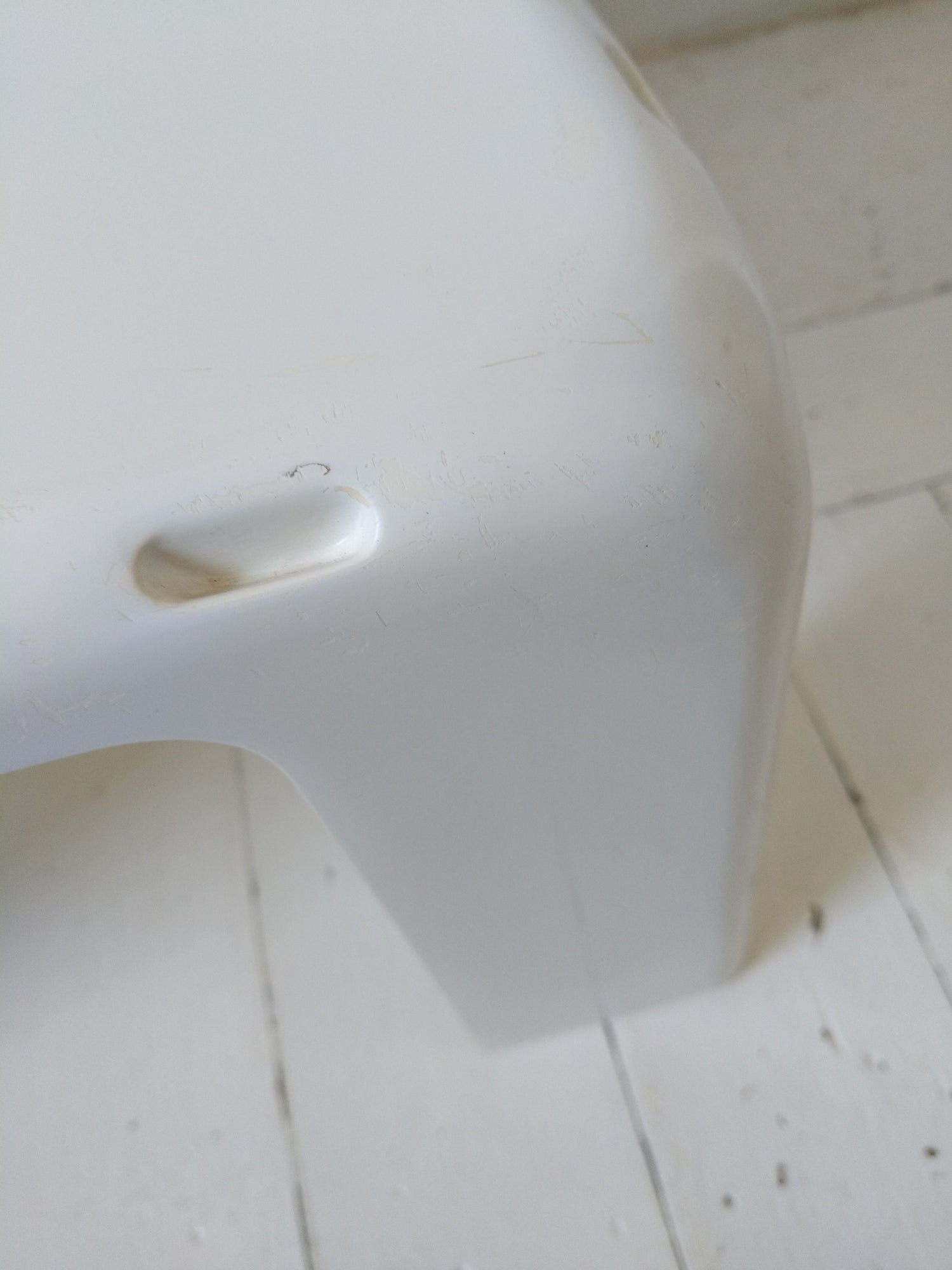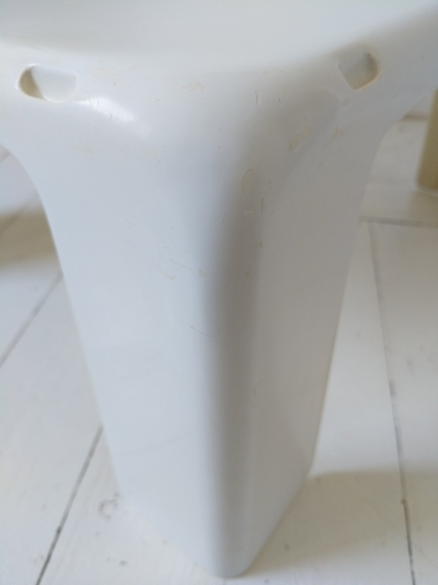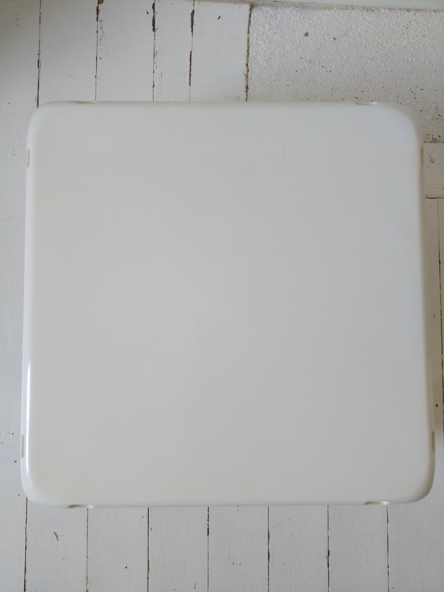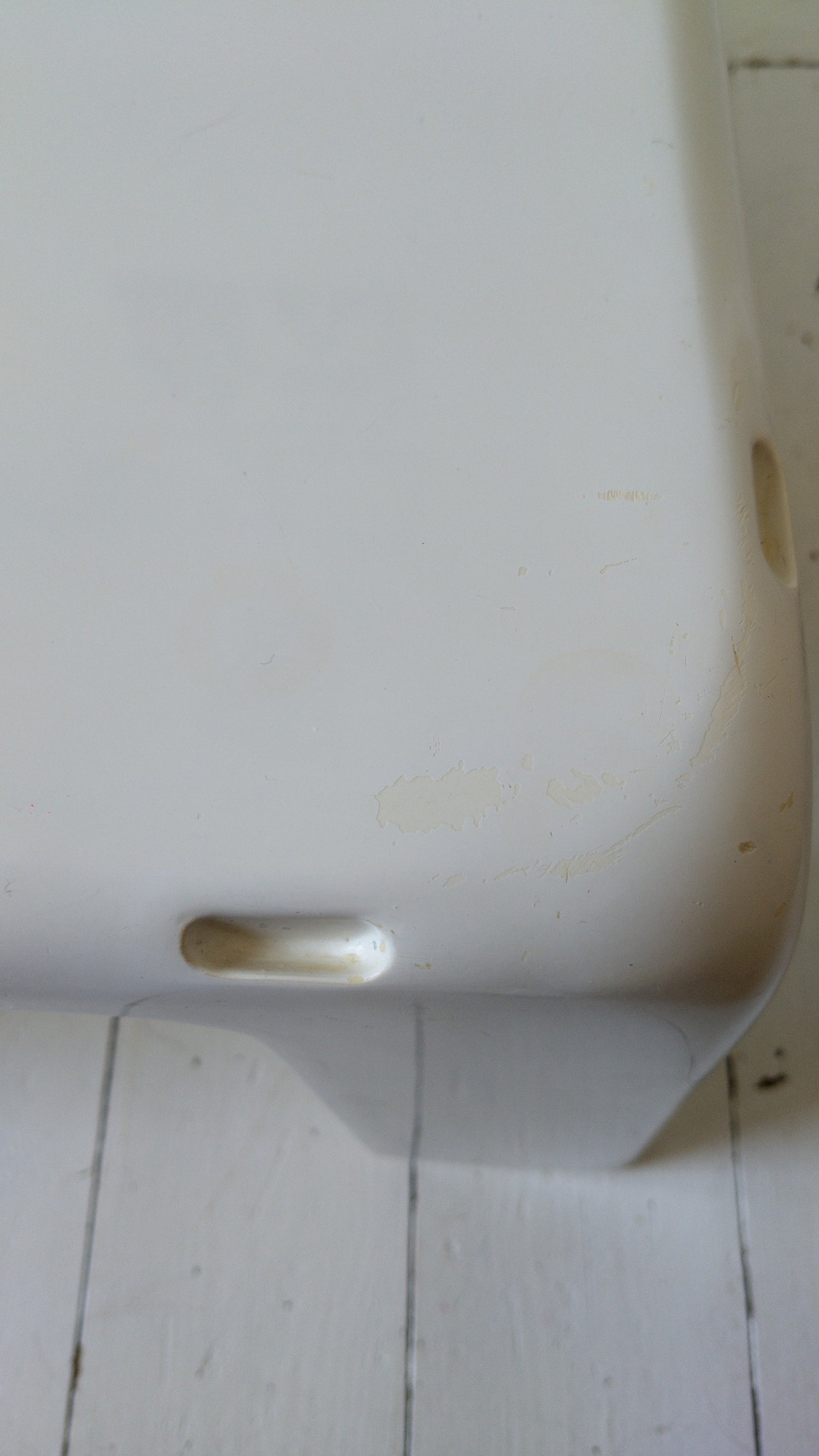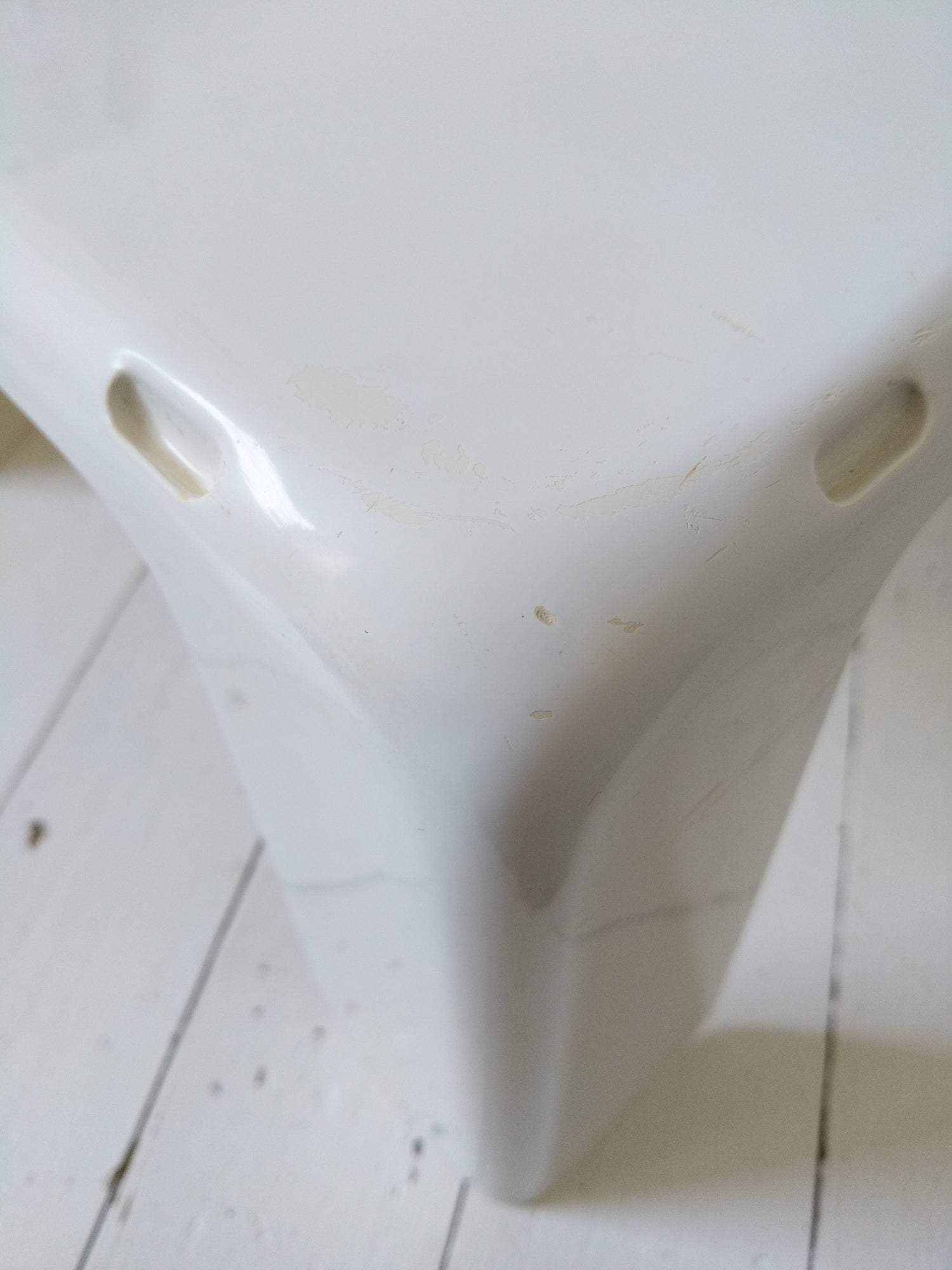 Fibre de verre - j'y ai passé beaucoup de temps et j'ai récupéré bon nombre de marques, même des brûlures! Il reste tout de même beaucoup de marques d'usage irréversibles dont micro fissure sur la base d'un pied (plus visible sur l'intérieur), cf photos. Encore très belle malgré cela, belle brillance, blanc bien blanc et en vrai, il faut déjà être bien près pour constater ses multiples signes du temps! Format 1 (c'est un petit format mais le plus grand des quatre produits) : 49,5cm de côté, 25cm de hauteur