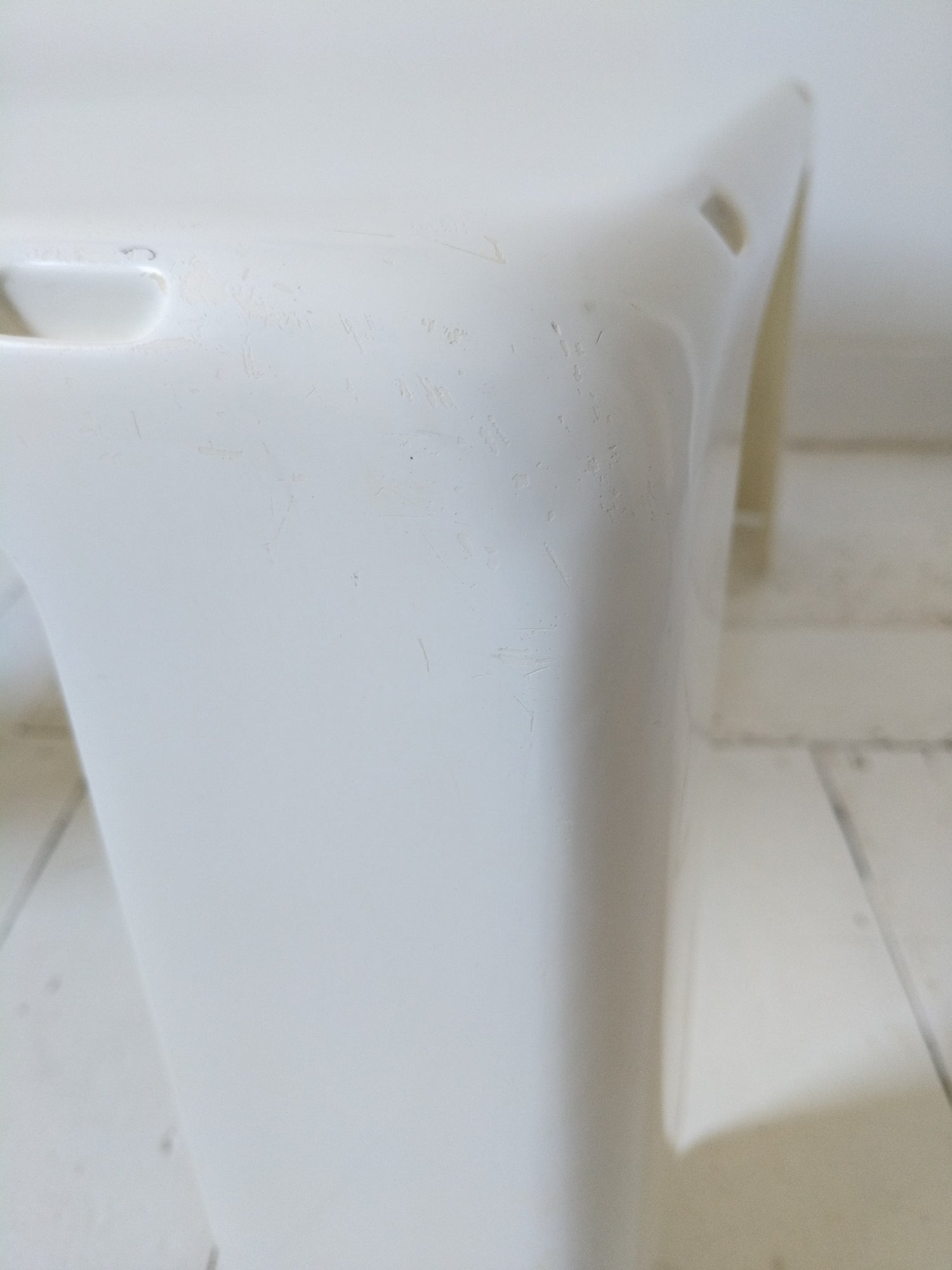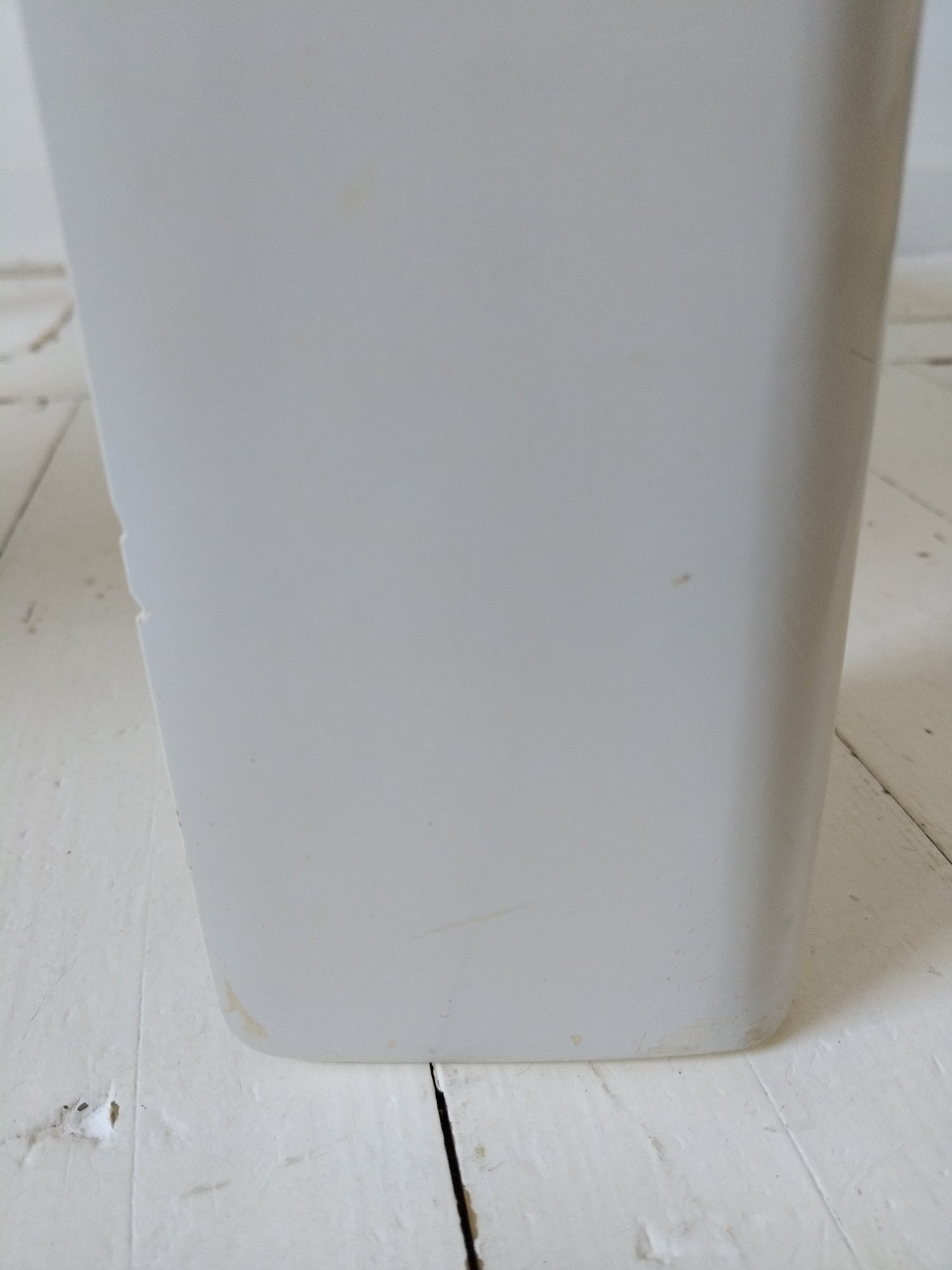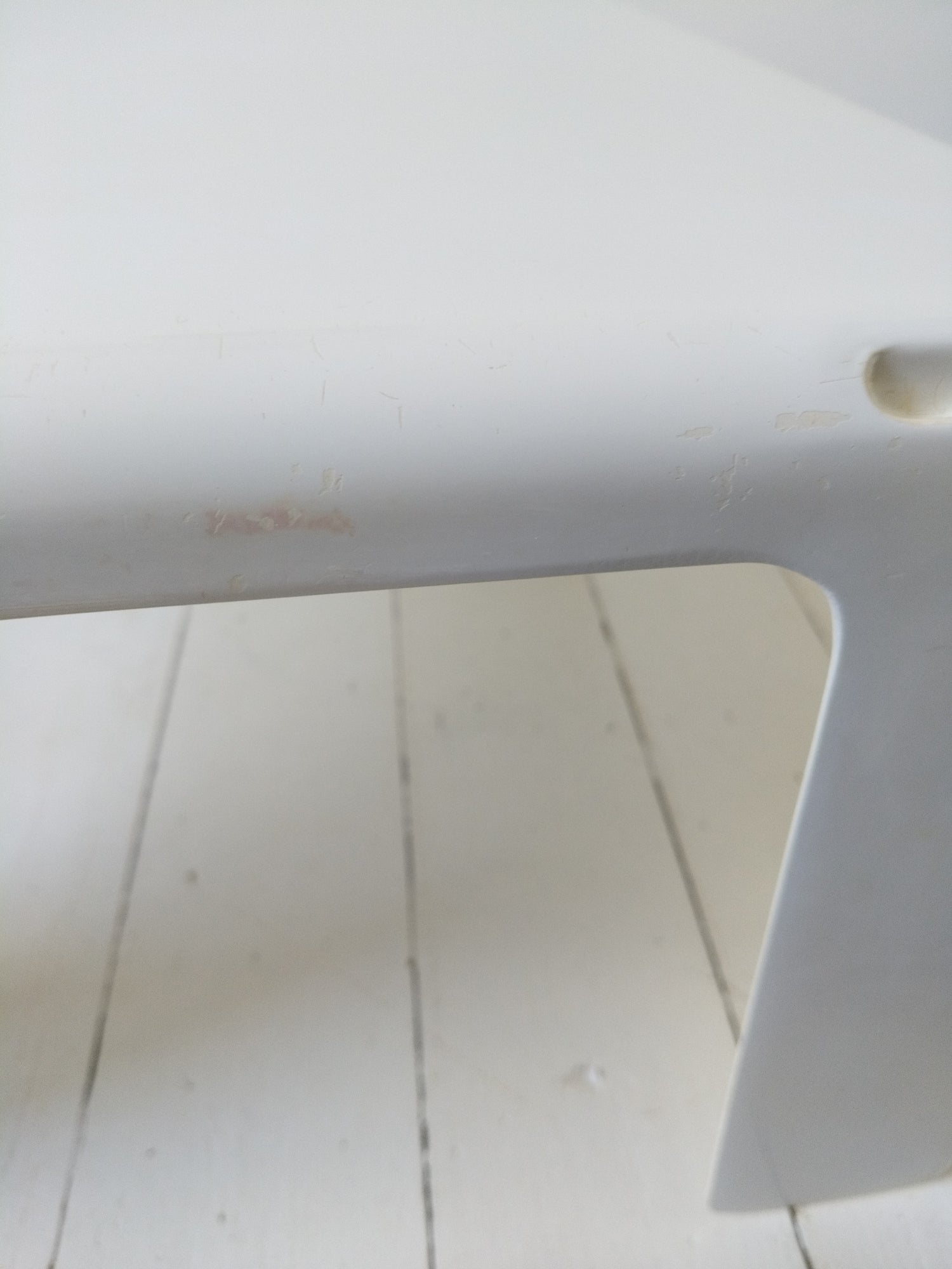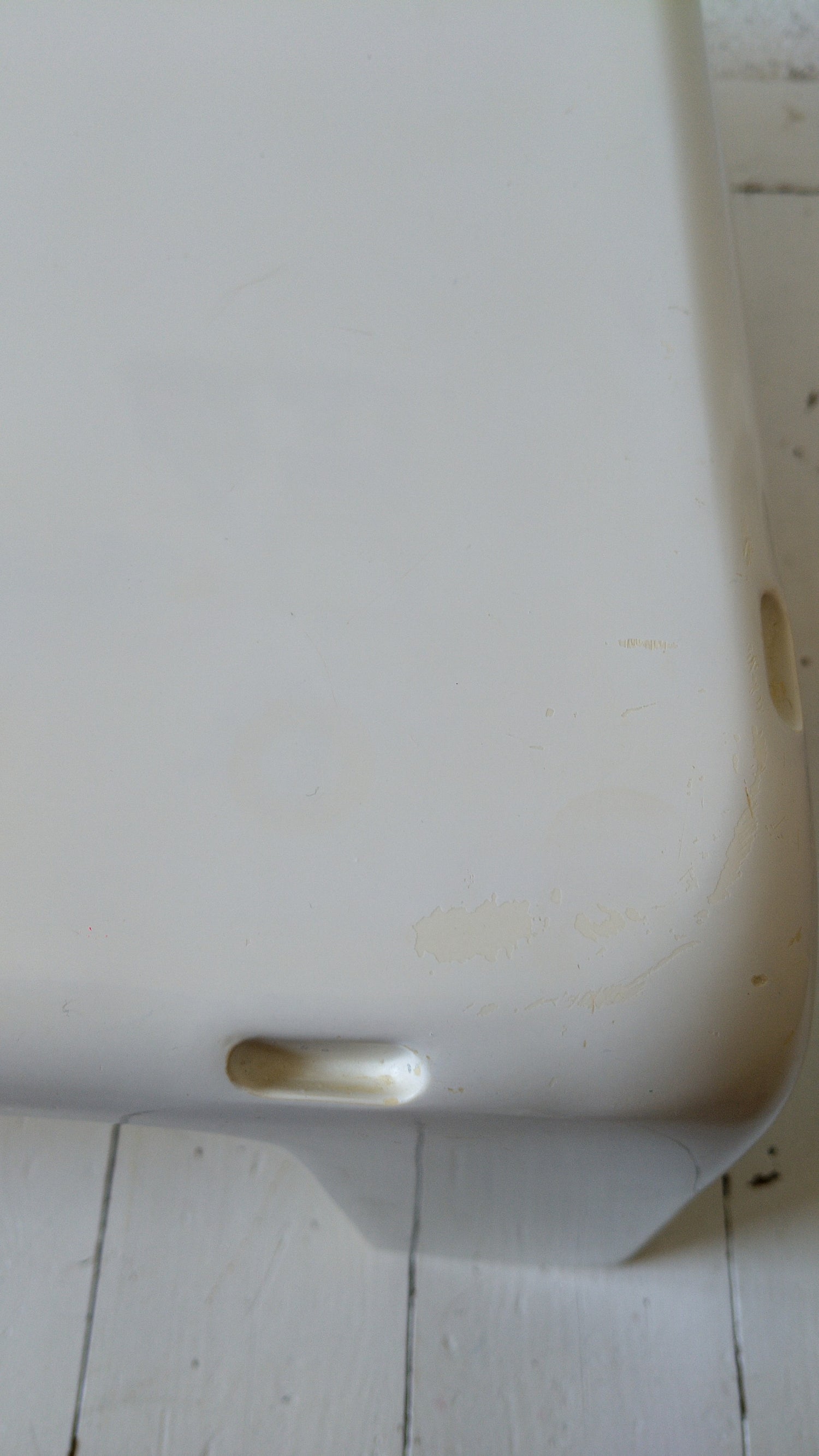 Fibre de verre - j'y ai passé beaucoup de temps et j'ai récupéré bon nombre de marques, même des brûlures! Il reste tout de même beaucoup de marques d'usage irréversibles dont micro fissure sur la base d'un pied (plus visible sur l'intérieur), cf photos. Encore très belle malgré cela, belle brillance, blanc bien blanc et en vrai, il faut déjà être bien près pour constater ses multiples signes du temps! Format 1 (c'est un petit format mais le plus grand des quatre produits) : 49,5cm de côté, 25cm de hauteur