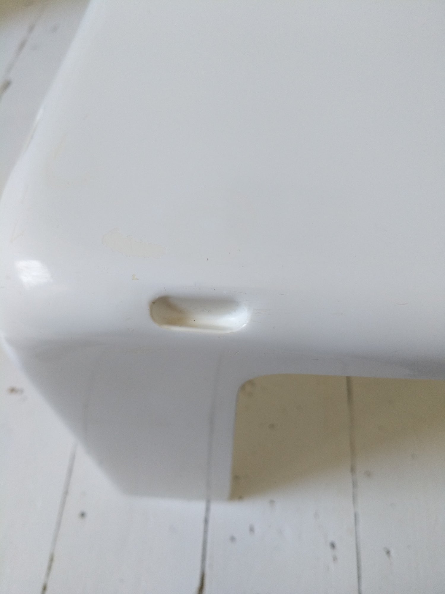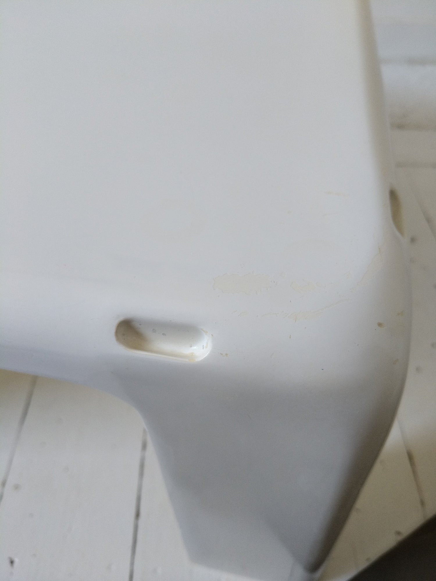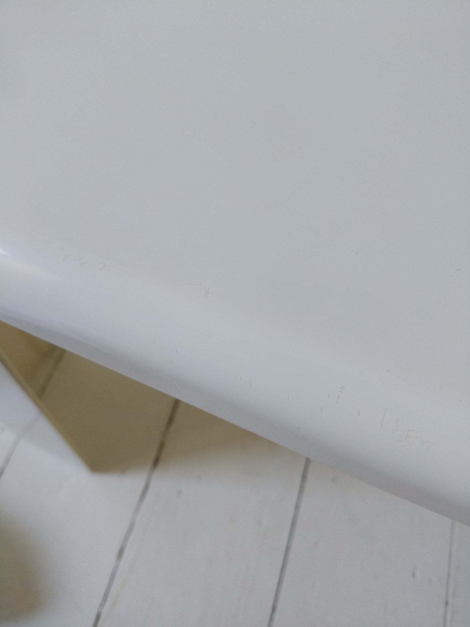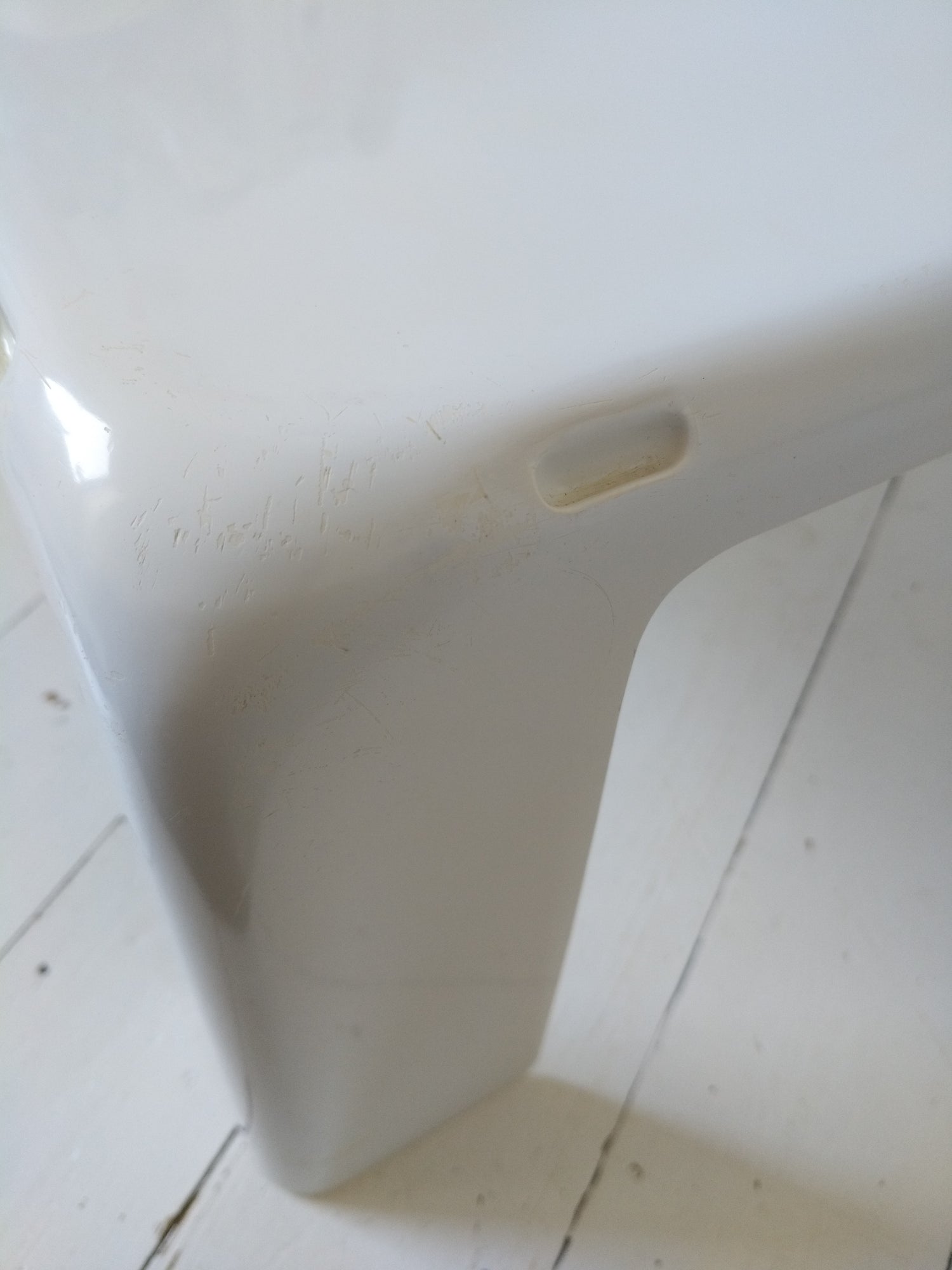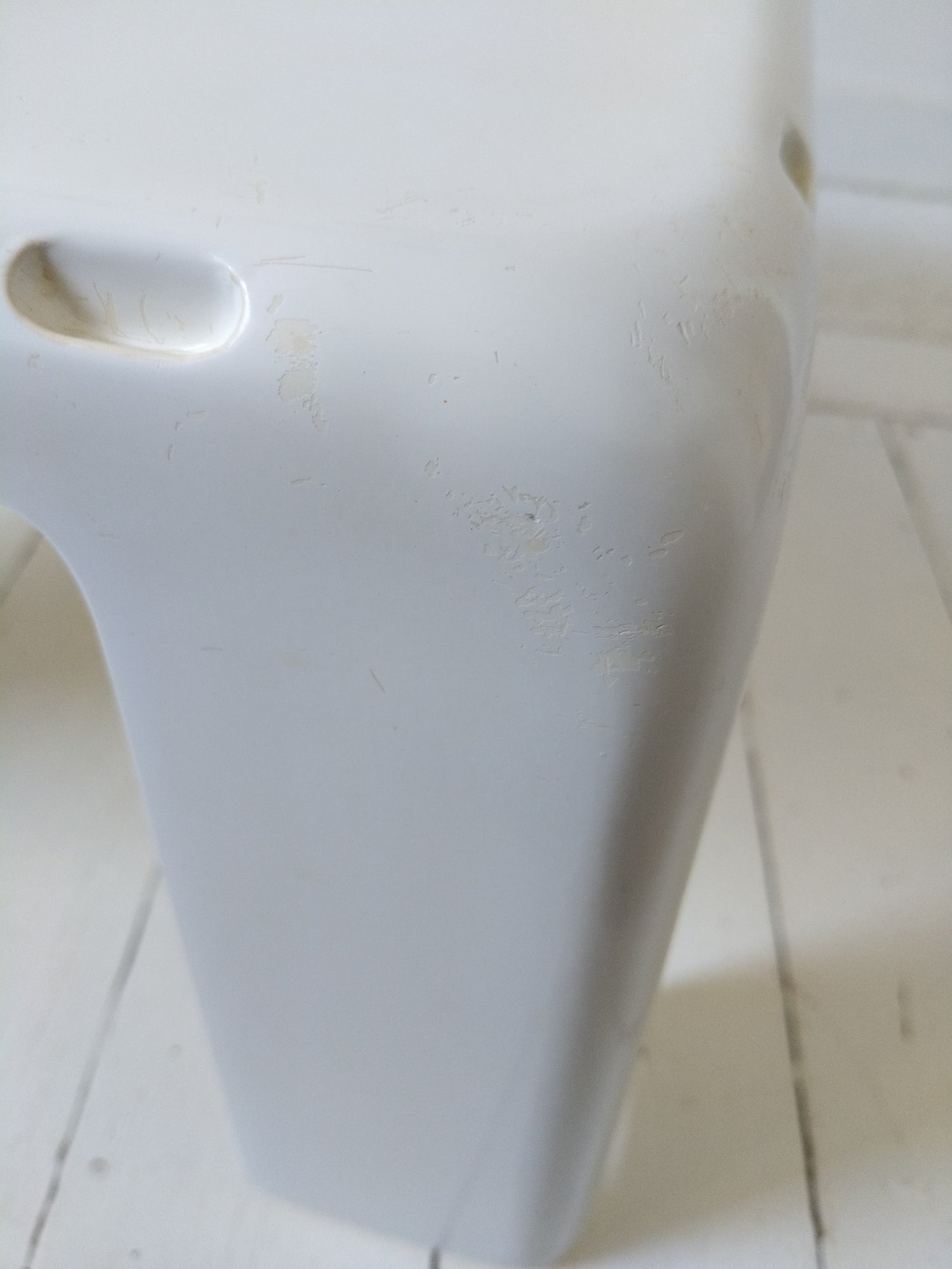 Fibre de verre - j'y ai passé beaucoup de temps et j'ai récupéré bon nombre de marques, même des brûlures! Il reste tout de même beaucoup de marques d'usage irréversibles dont micro fissure sur la base d'un pied (plus visible sur l'intérieur), cf photos. Encore très belle malgré cela, belle brillance, blanc bien blanc et en vrai, il faut déjà être bien près pour constater ses multiples signes du temps! Format 1 (c'est un petit format mais le plus grand des quatre produits) : 49,5cm de côté, 25cm de hauteur