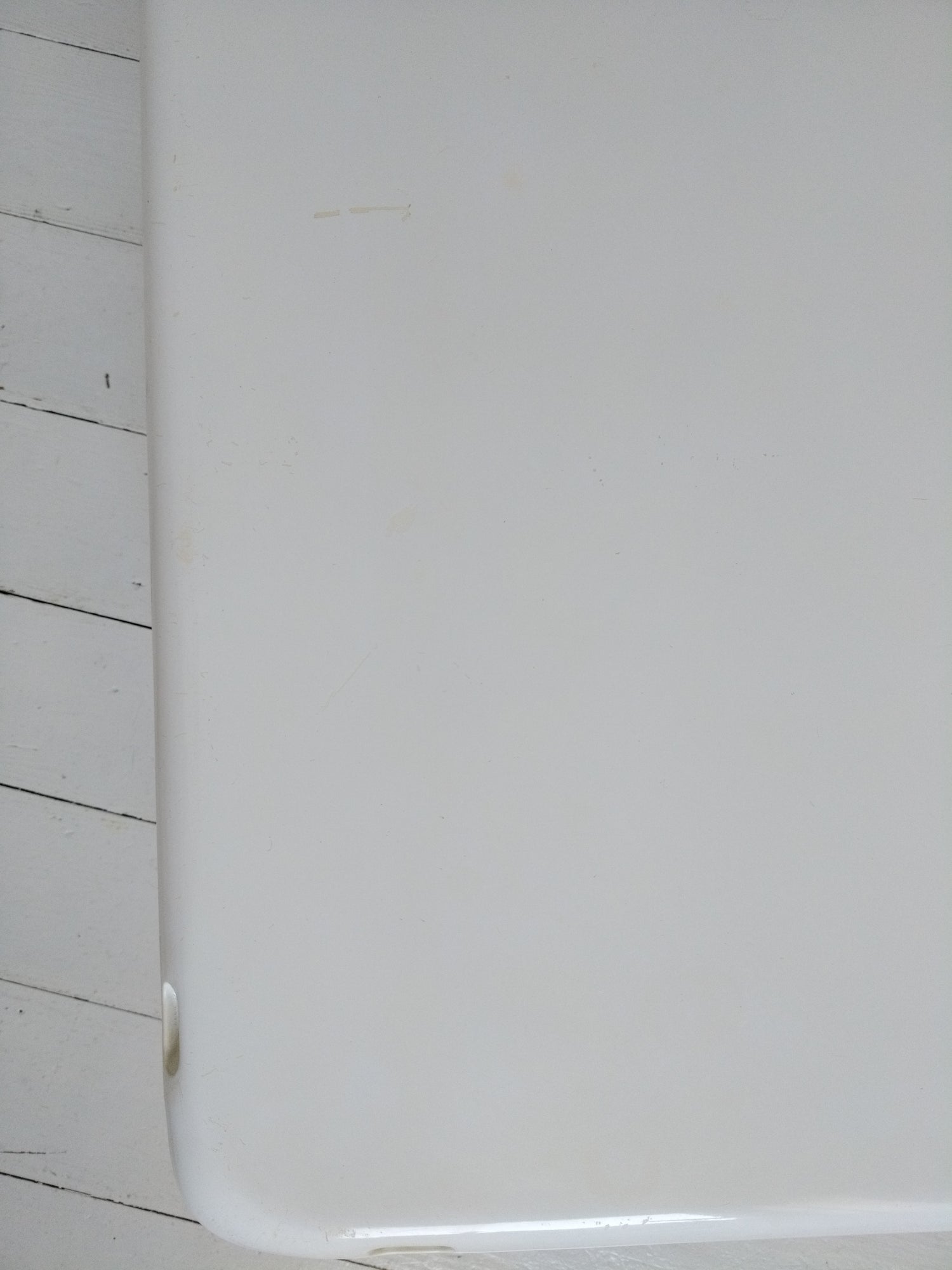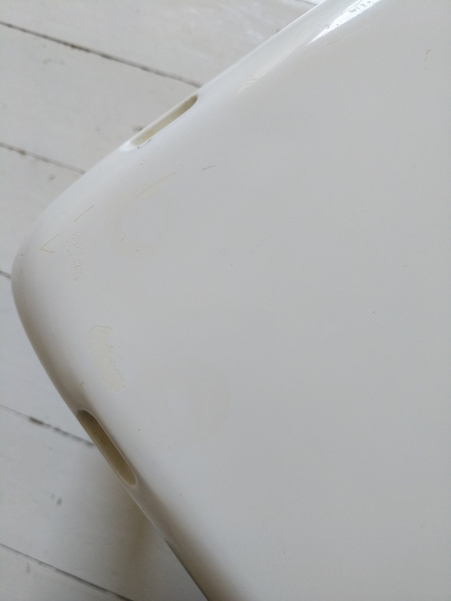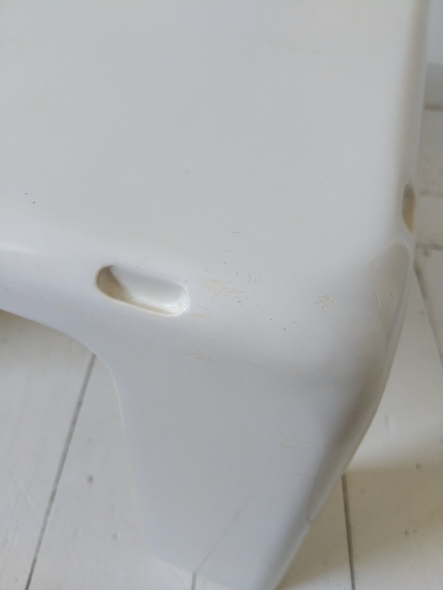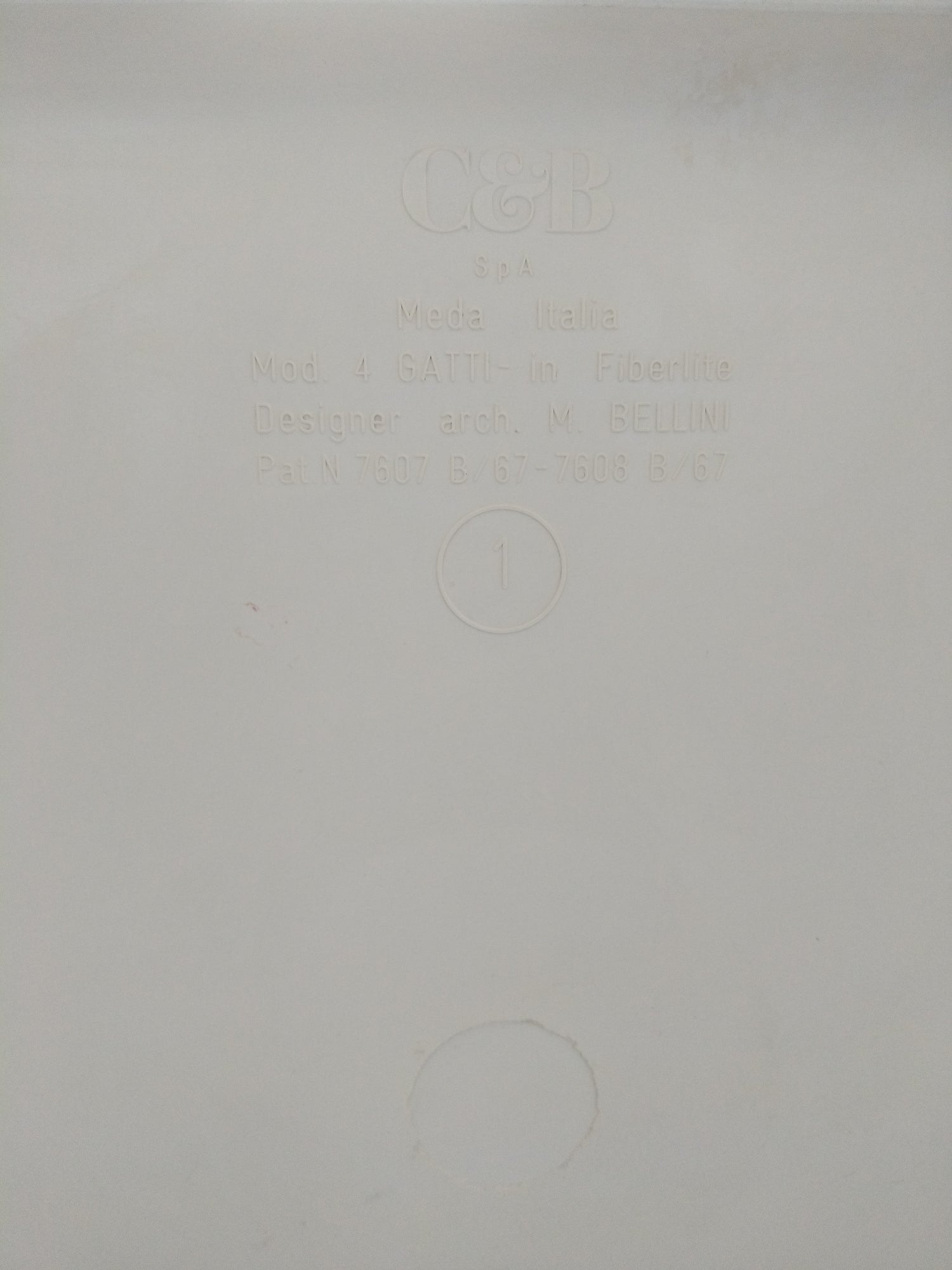 Fibre de verre - j'y ai passé beaucoup de temps et j'ai récupéré bon nombre de marques, même des brûlures! Il reste tout de même beaucoup de marques d'usage irréversibles dont micro fissure sur la base d'un pied (plus visible sur l'intérieur), cf photos. Encore très belle malgré cela, belle brillance, blanc bien blanc et en vrai, il faut déjà être bien près pour constater ses multiples signes du temps! Format 1 (c'est un petit format mais le plus grand des quatre produits) : 49,5cm de côté, 25cm de hauteur