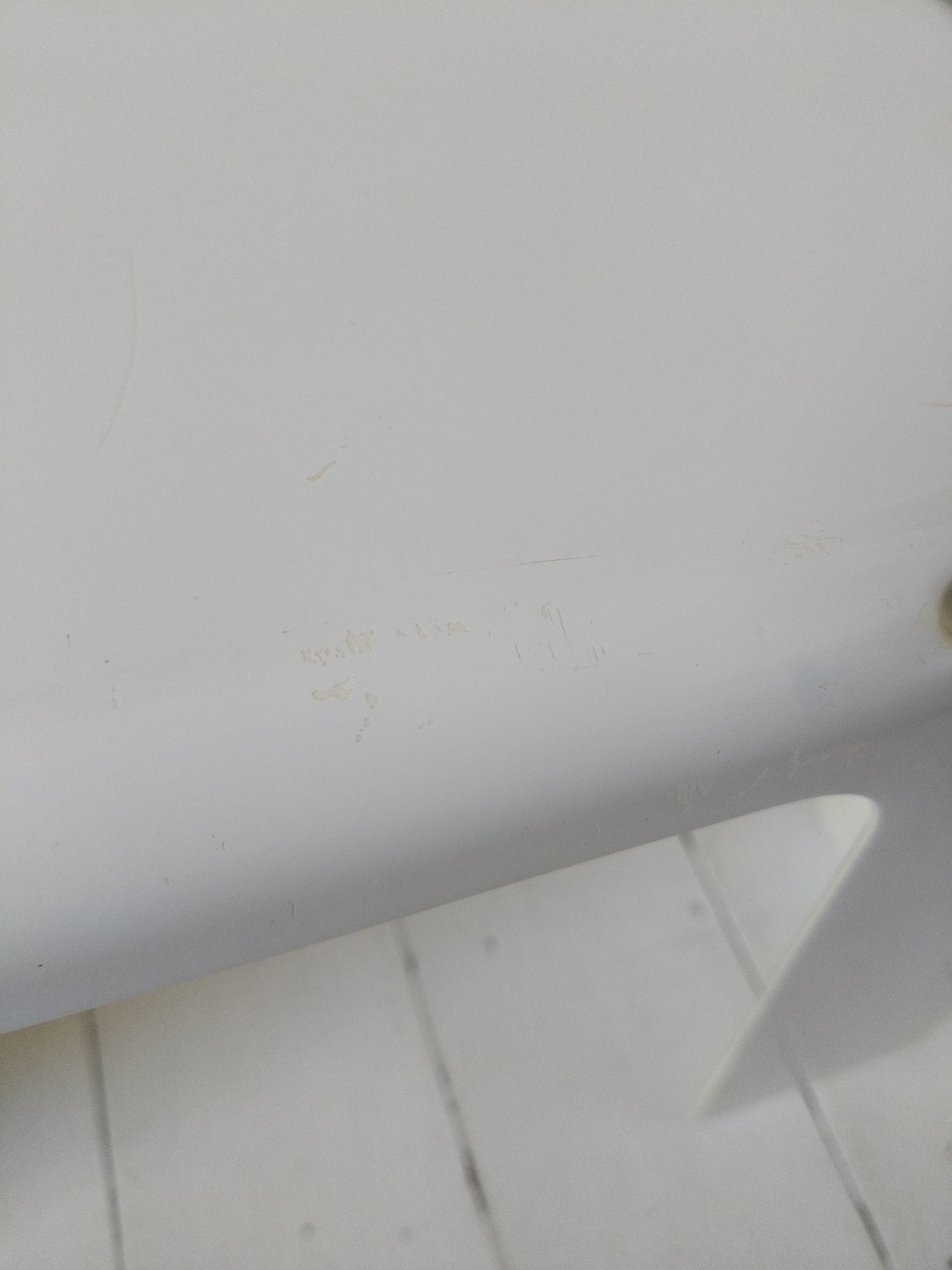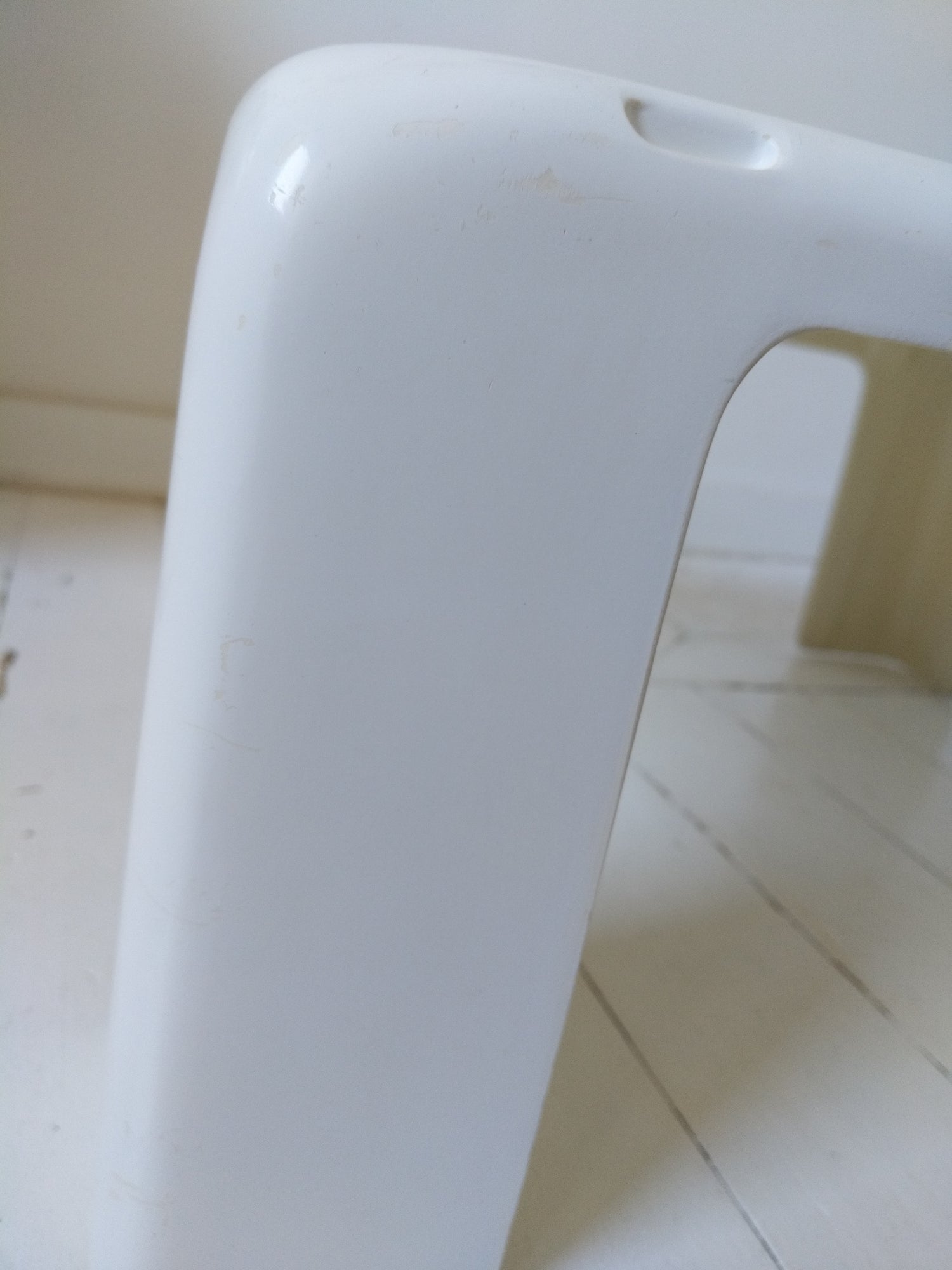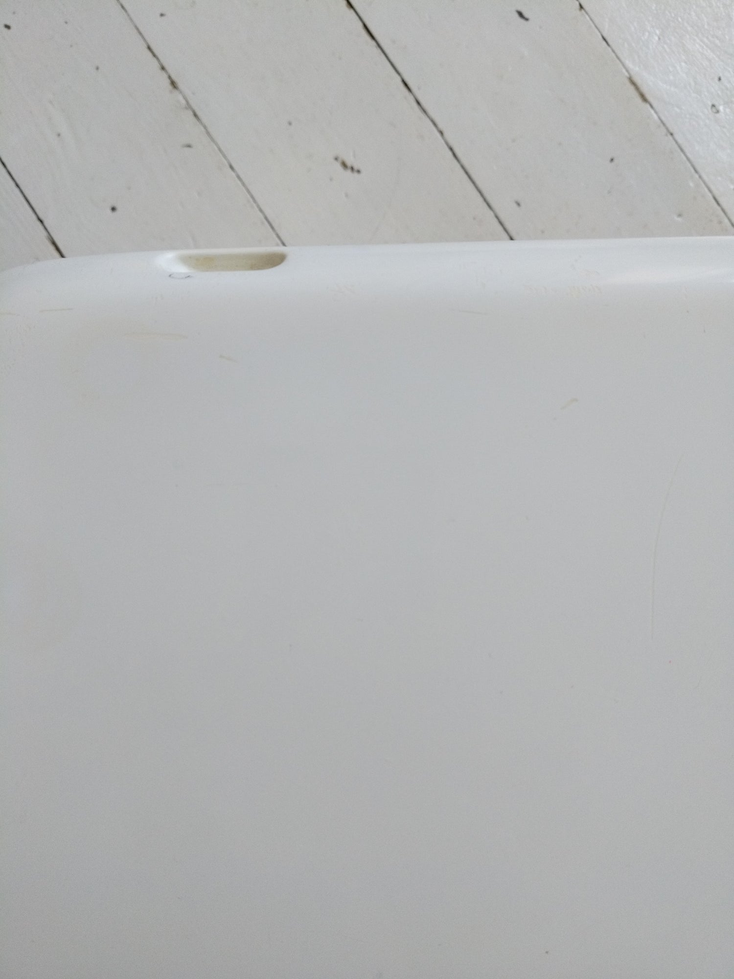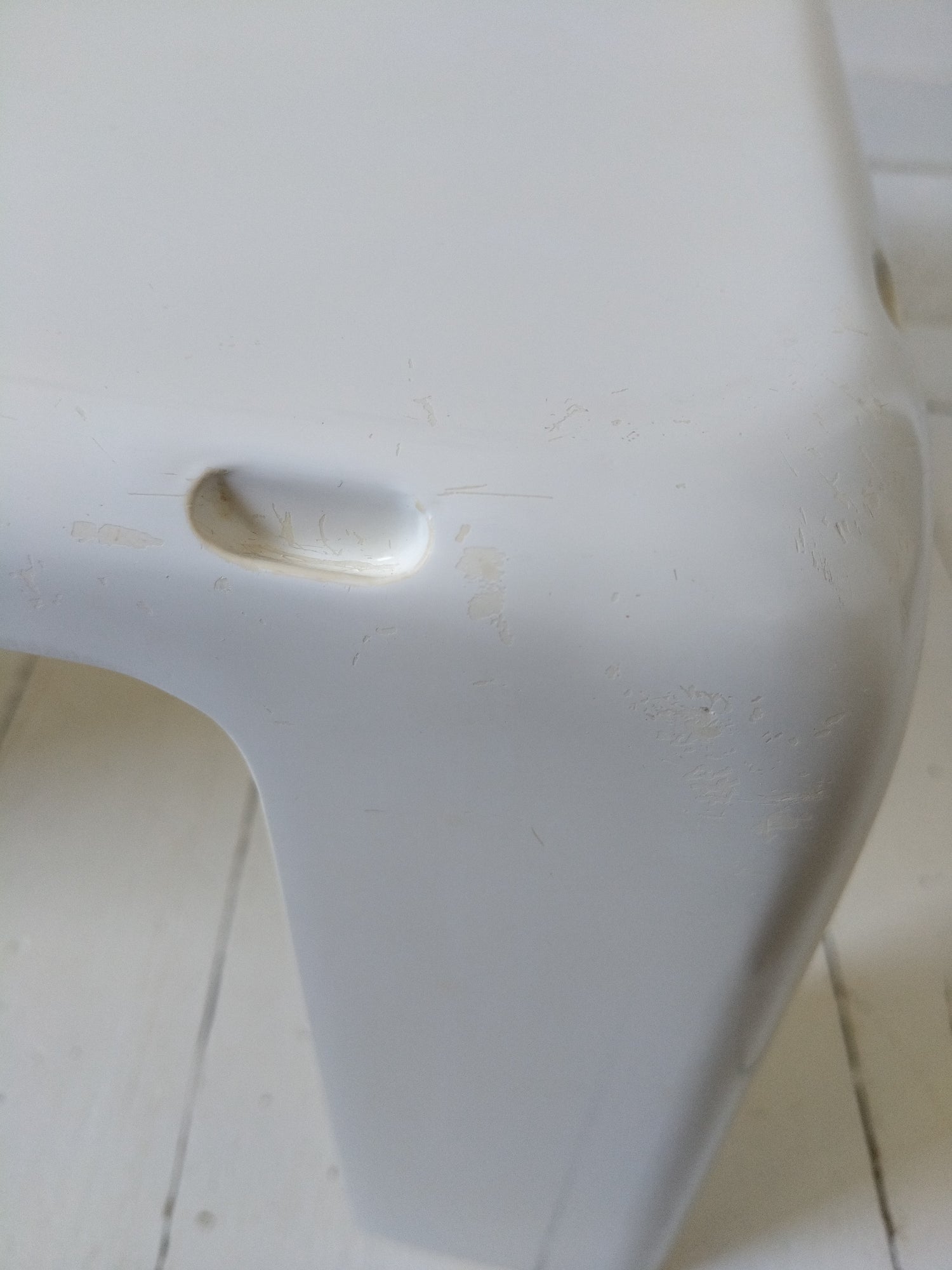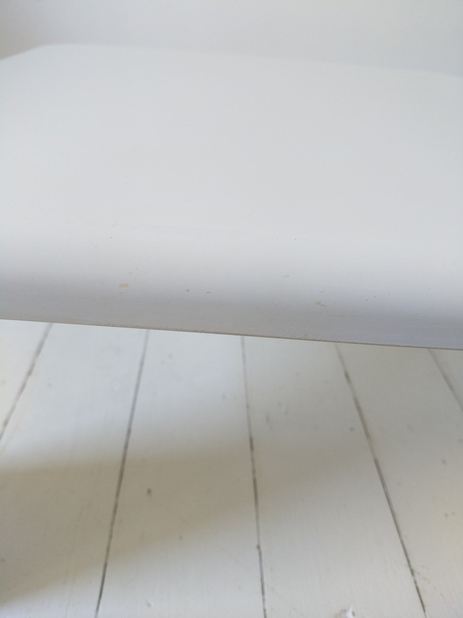 Fibre de verre - j'y ai passé beaucoup de temps et j'ai récupéré bon nombre de marques, même des brûlures! Il reste tout de même beaucoup de marques d'usage irréversibles dont micro fissure sur la base d'un pied (plus visible sur l'intérieur), cf photos. Encore très belle malgré cela, belle brillance, blanc bien blanc et en vrai, il faut déjà être bien près pour constater ses multiples signes du temps! Format 1 (c'est un petit format mais le plus grand des quatre produits) : 49,5cm de côté, 25cm de hauteur