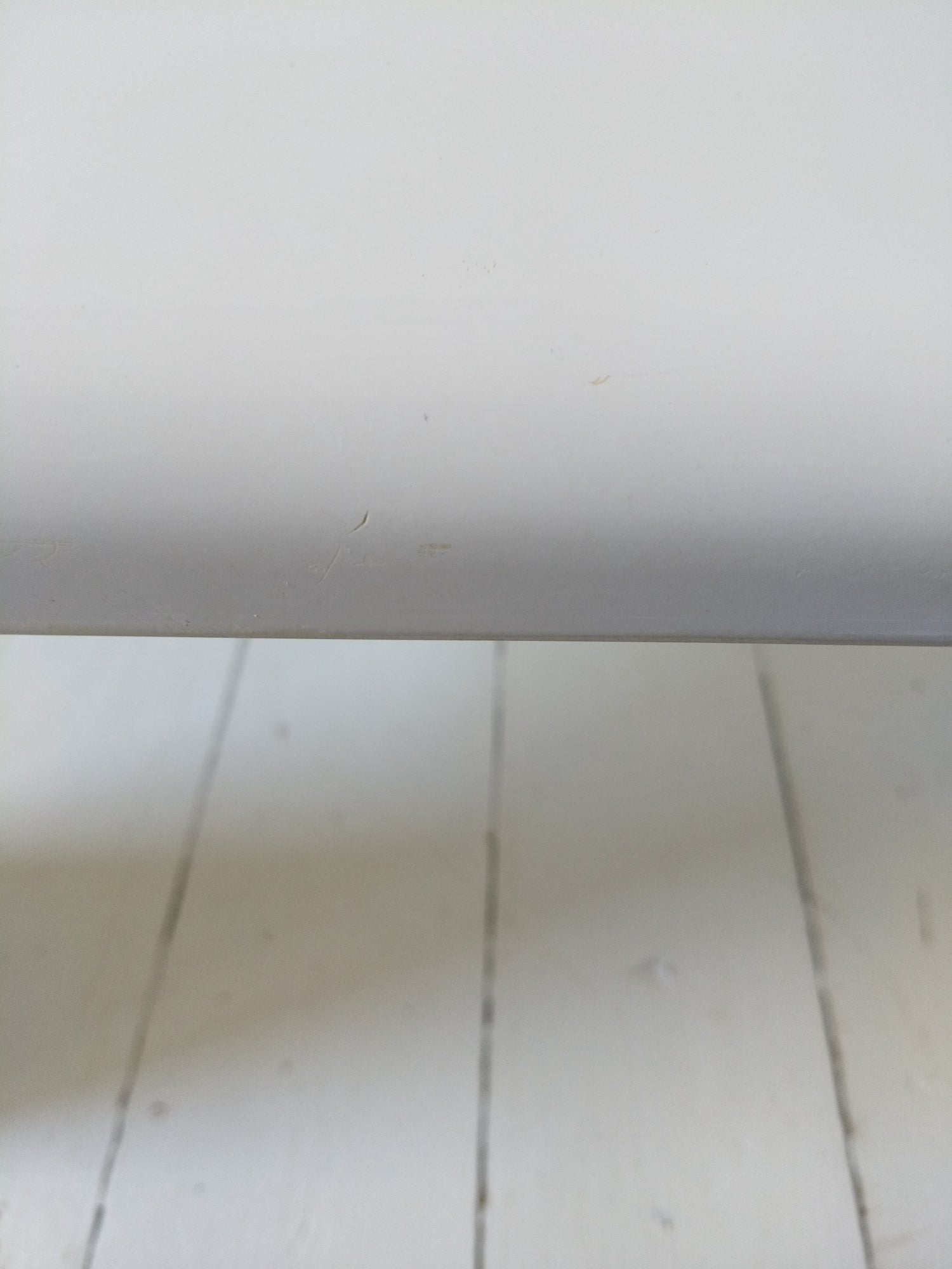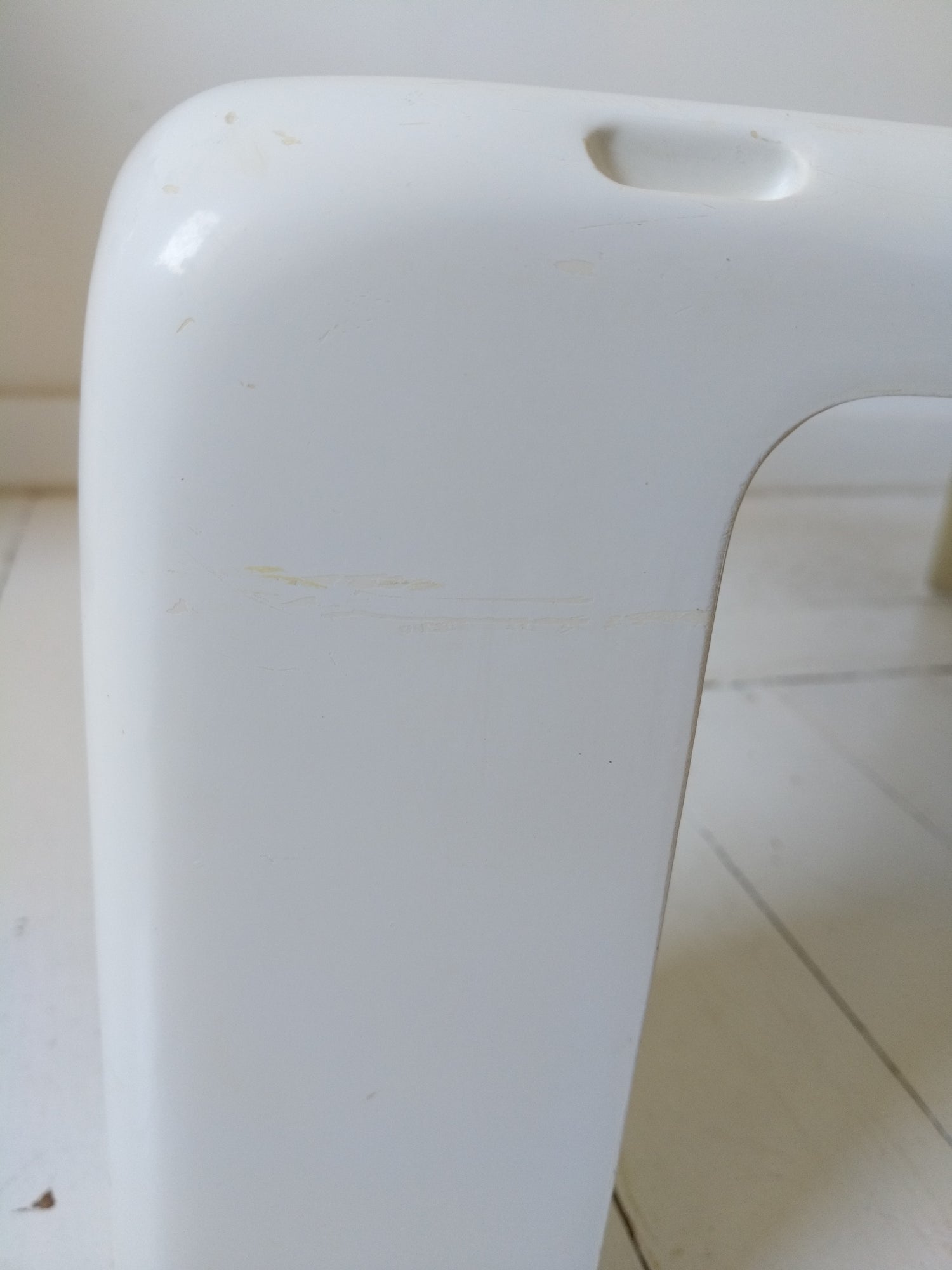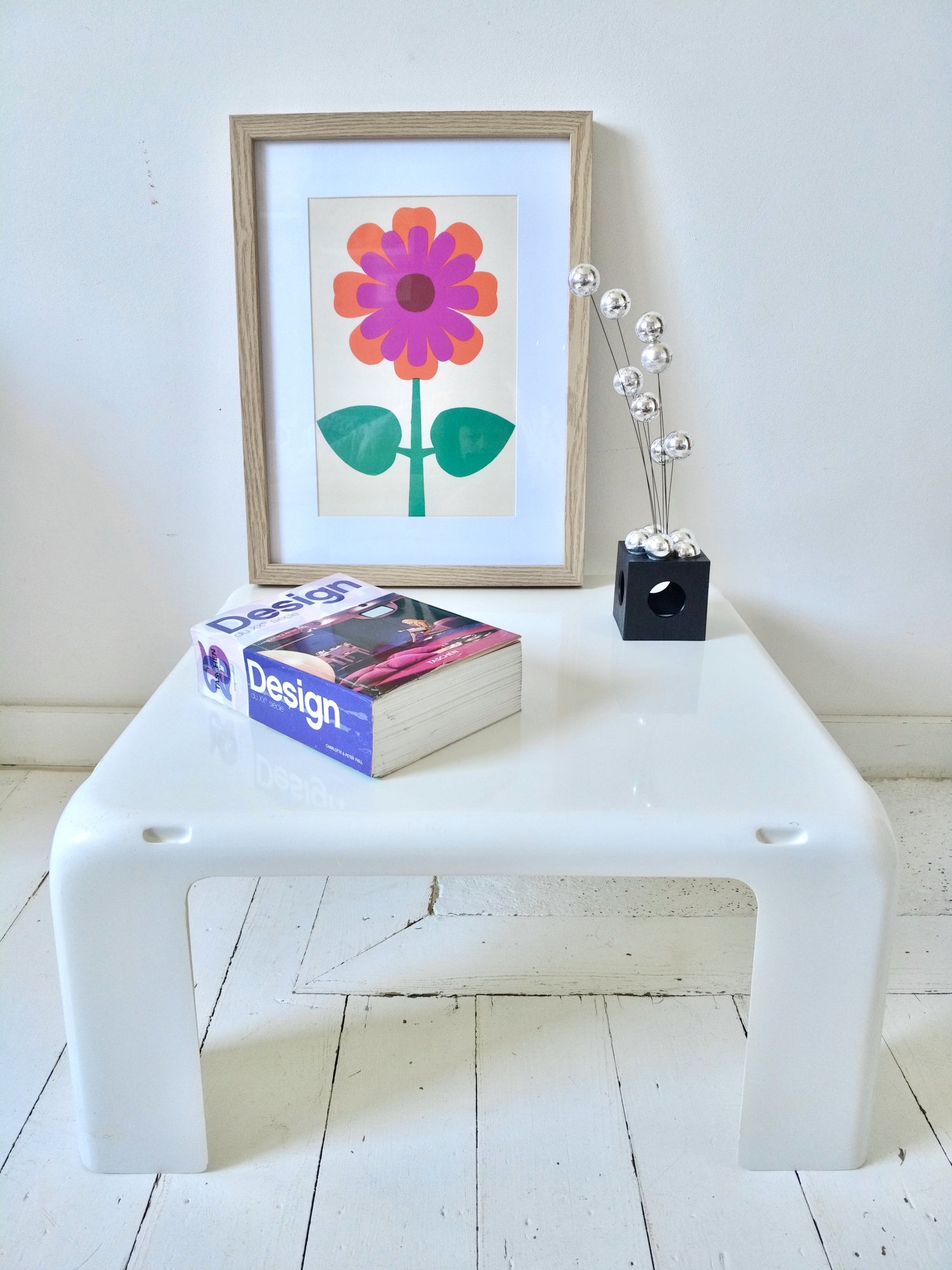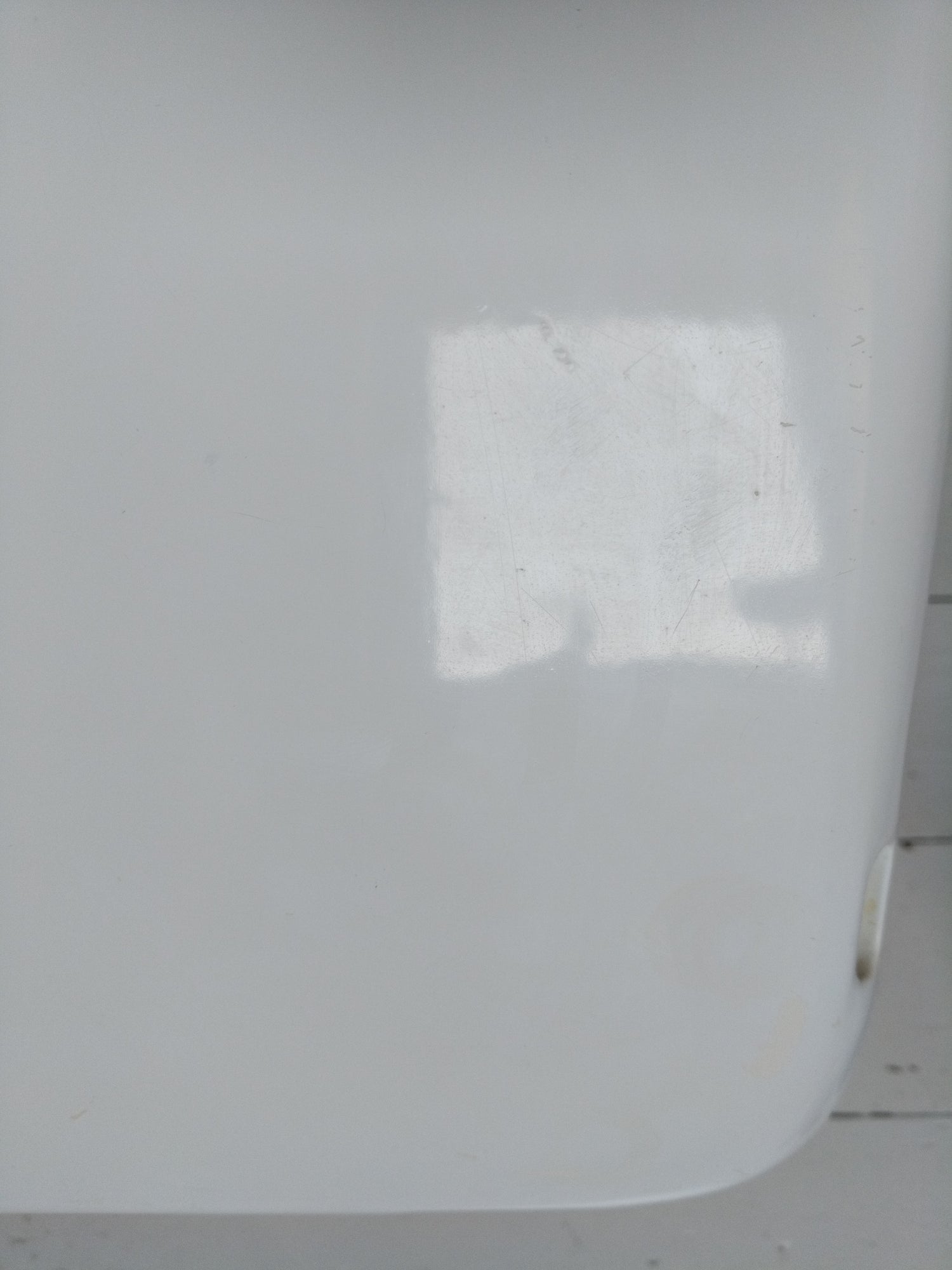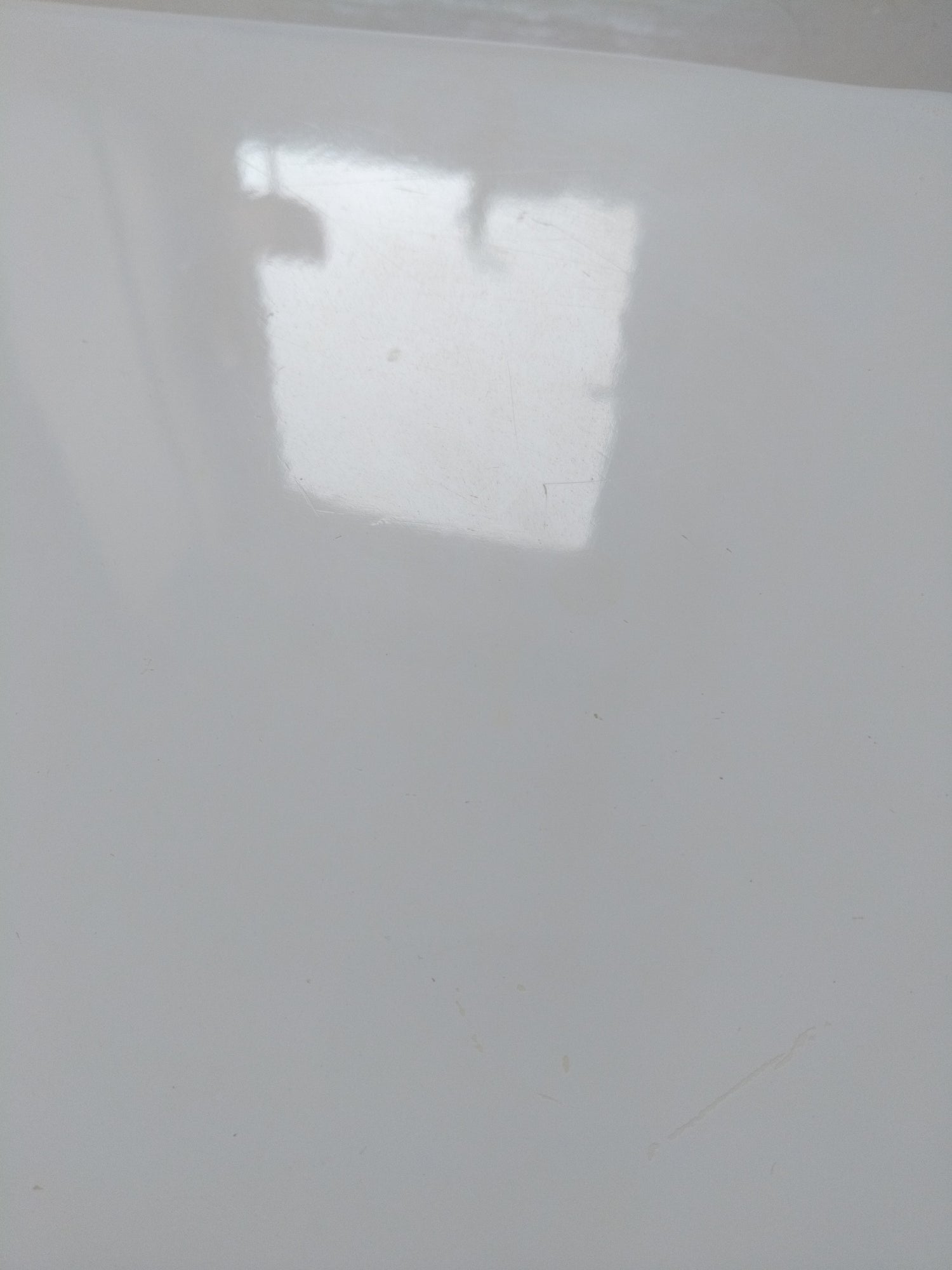 Fibre de verre - j'y ai passé beaucoup de temps et j'ai récupéré bon nombre de marques, même des brûlures! Il reste tout de même beaucoup de marques d'usage irréversibles dont micro fissure sur la base d'un pied (plus visible sur l'intérieur), cf photos. Encore très belle malgré cela, belle brillance, blanc bien blanc et en vrai, il faut déjà être bien près pour constater ses multiples signes du temps! Format 1 (c'est un petit format mais le plus grand des quatre produits) : 49,5cm de côté, 25cm de hauteur