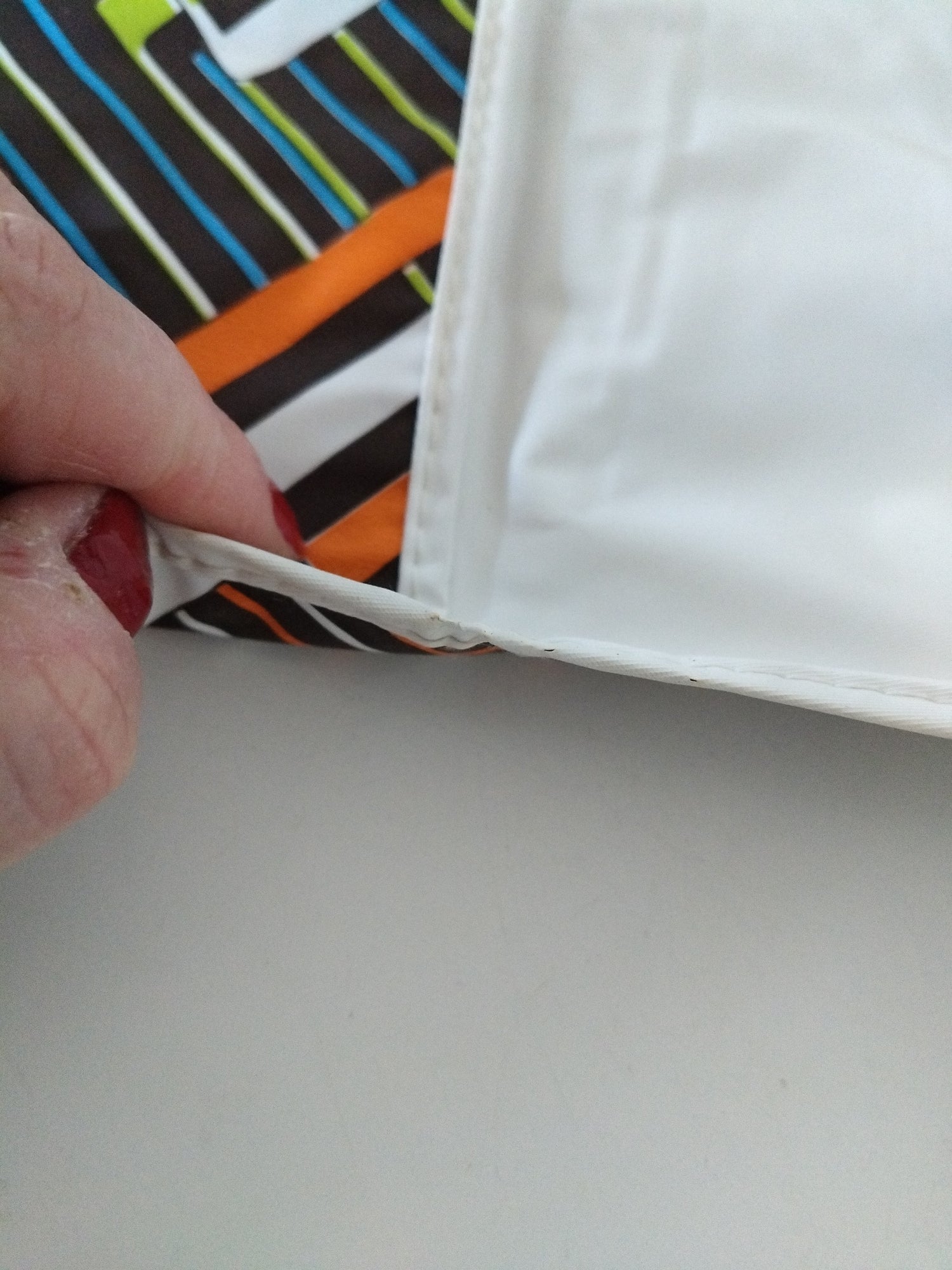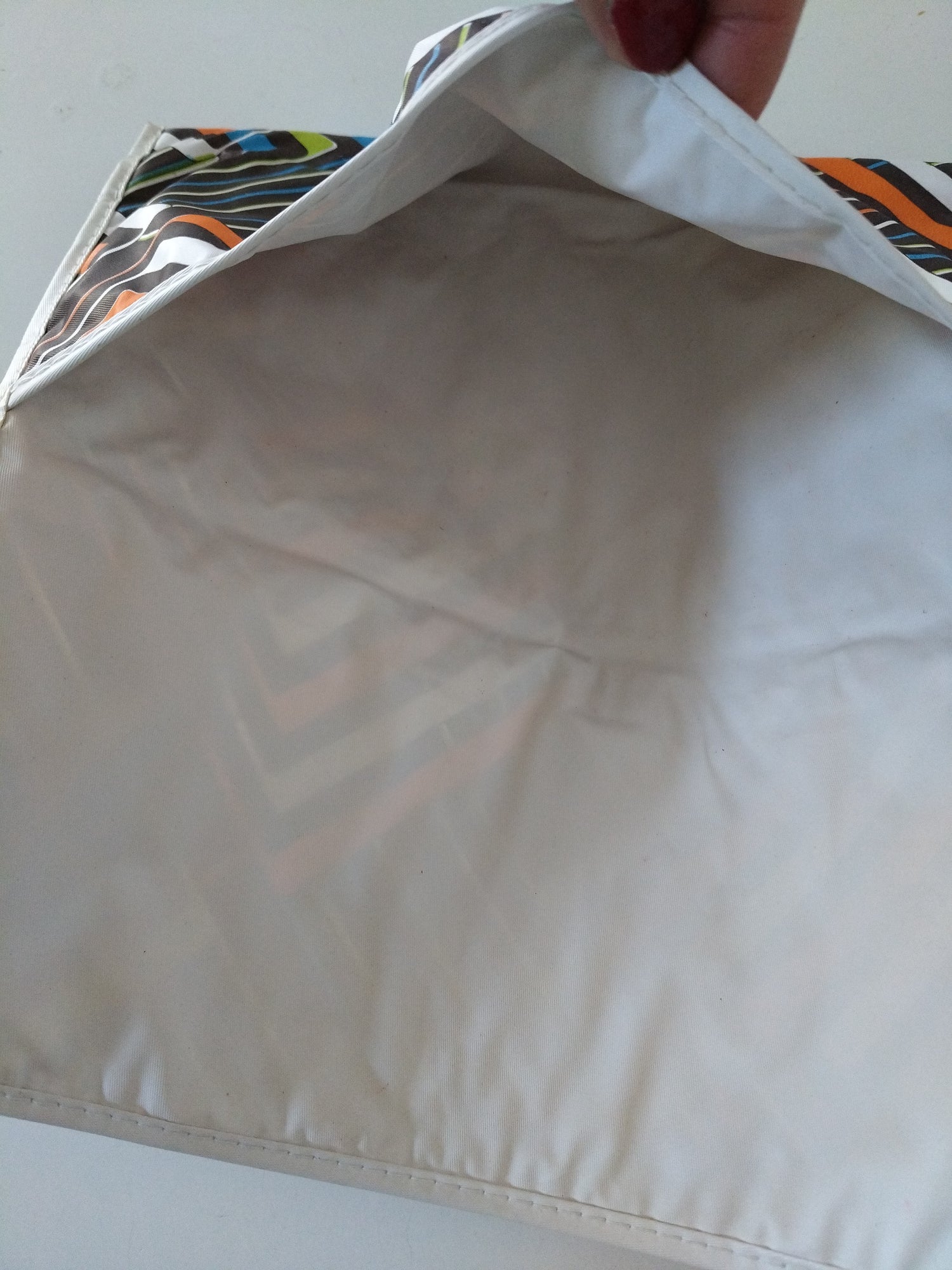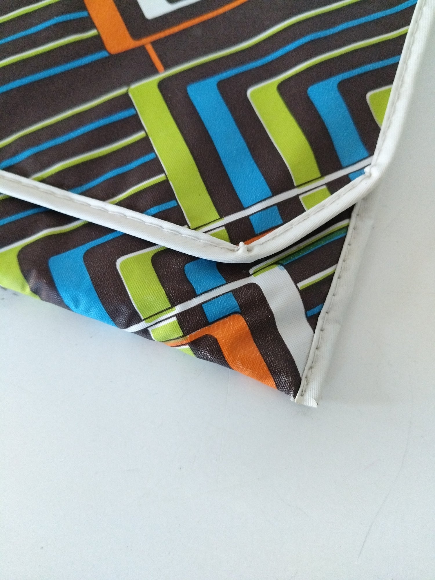 Toile plastifiée - pas de fermeture à part le rabat - quelques petites marques/ traces du temps visibles sur les photos (extérieur et intérieur) - 26 x 13,7cm.,
