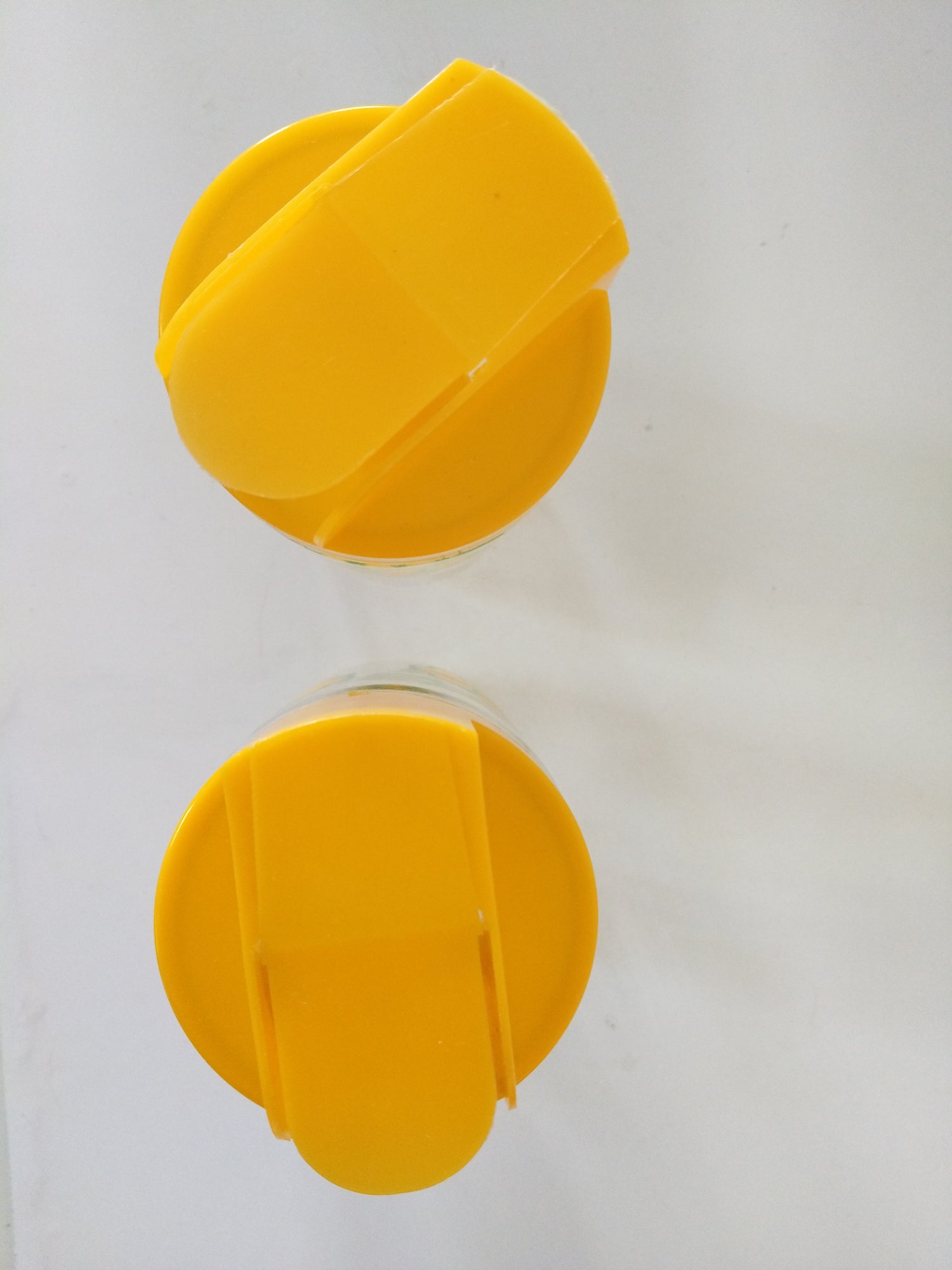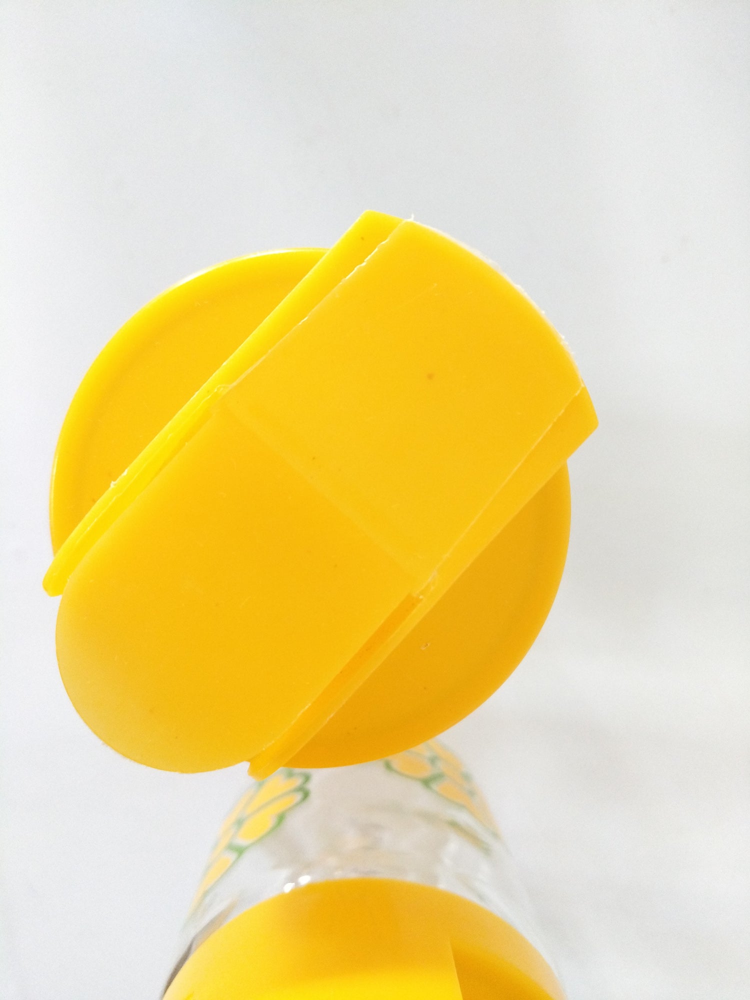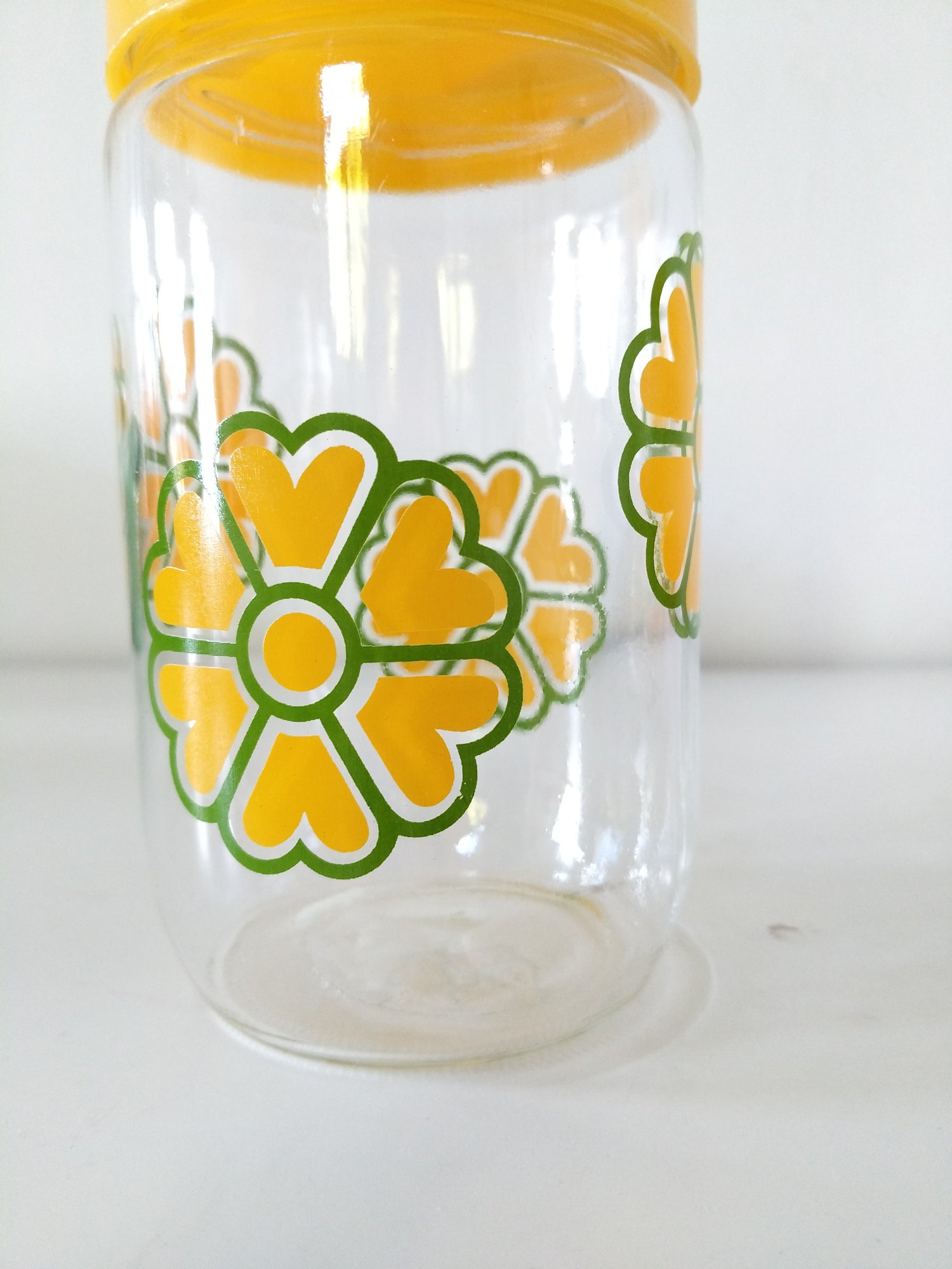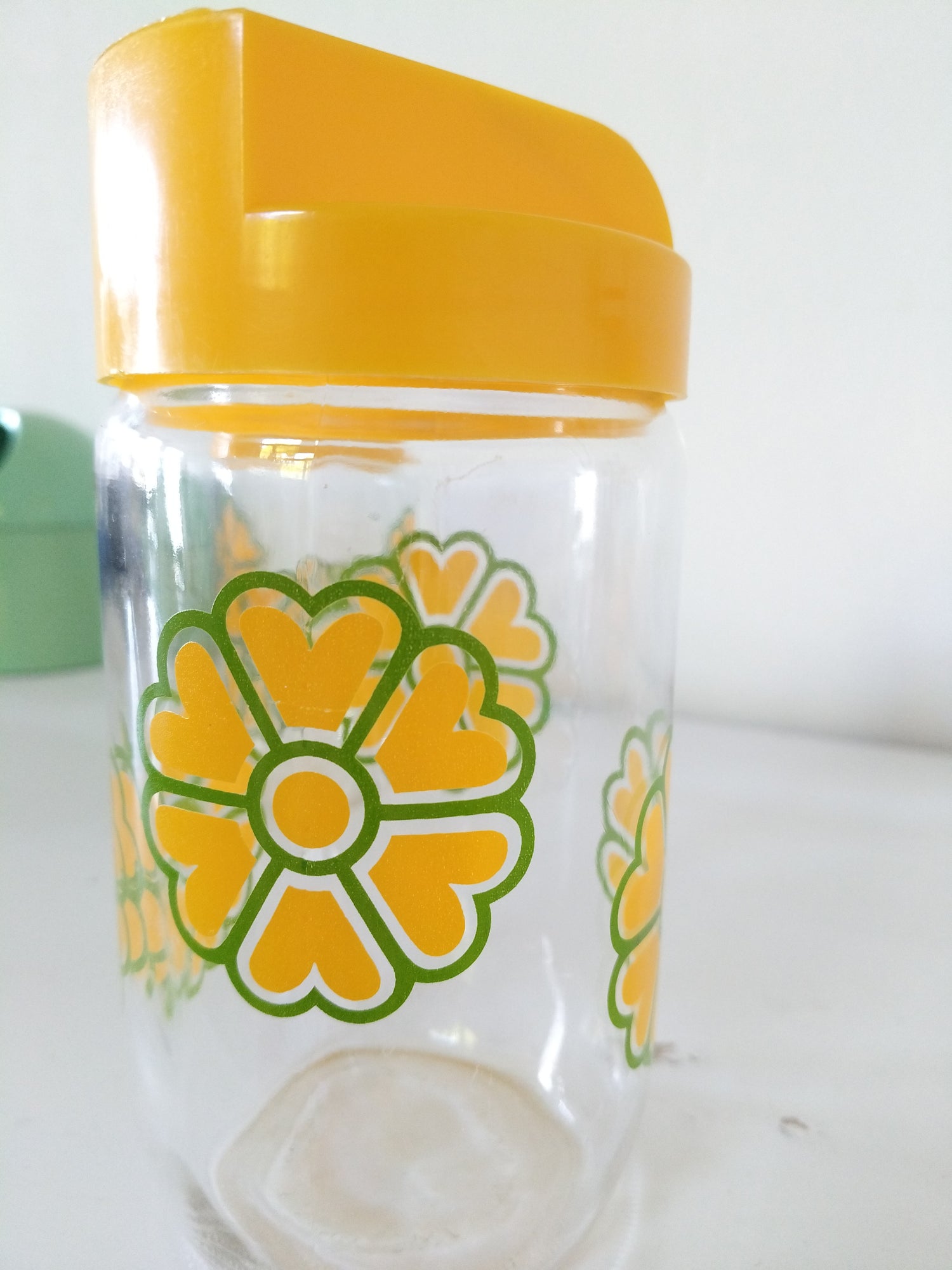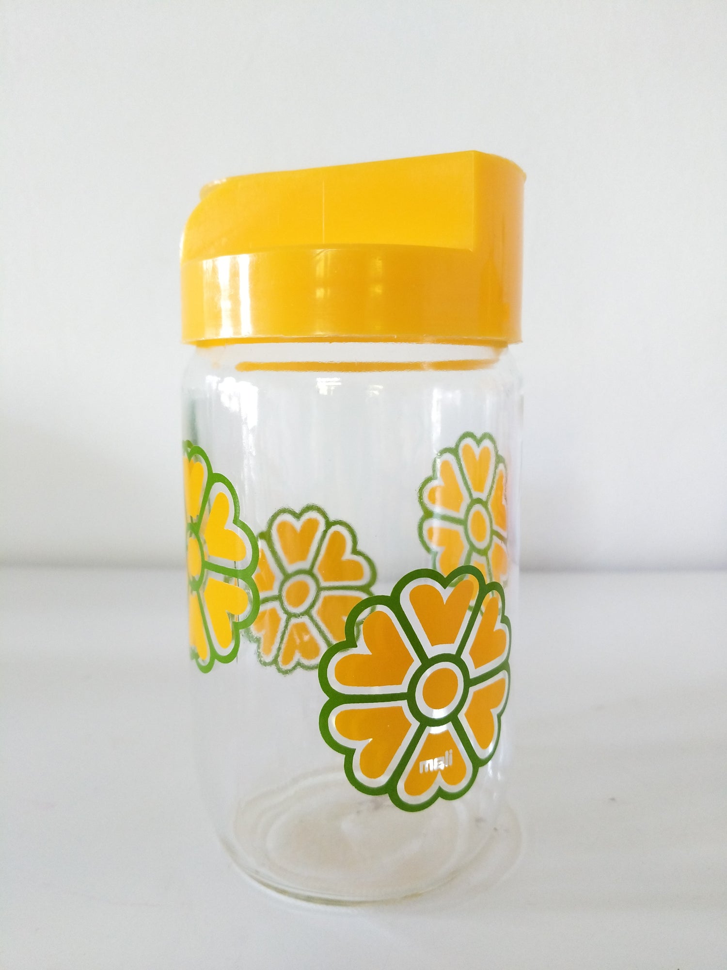 Verre et plastique - très bel état d'époque, quelques très petite marques d'usage et/ ou de fabrication - 17cm au plus haut, 8cm de diamètre - 0,72l de contenance.