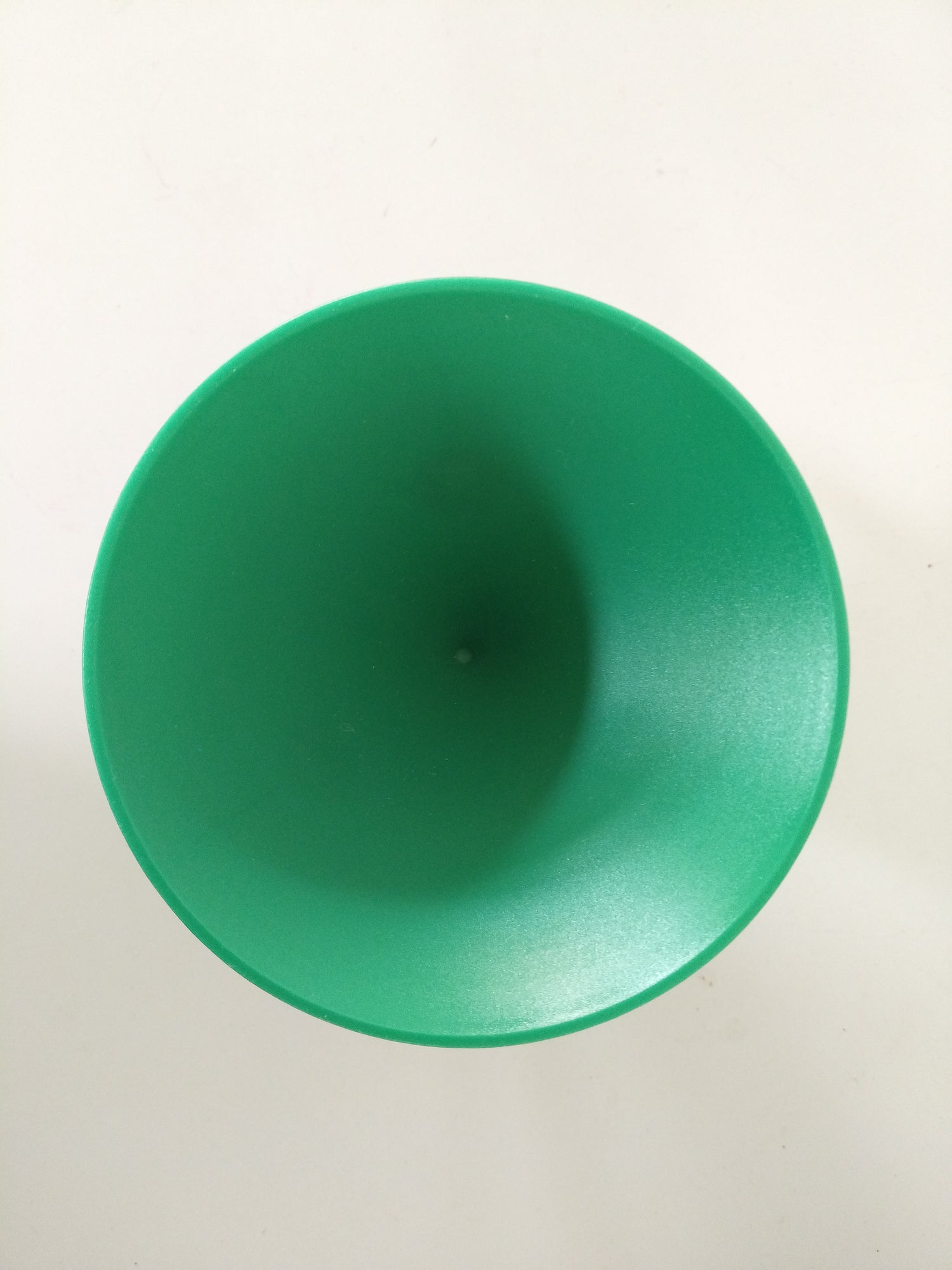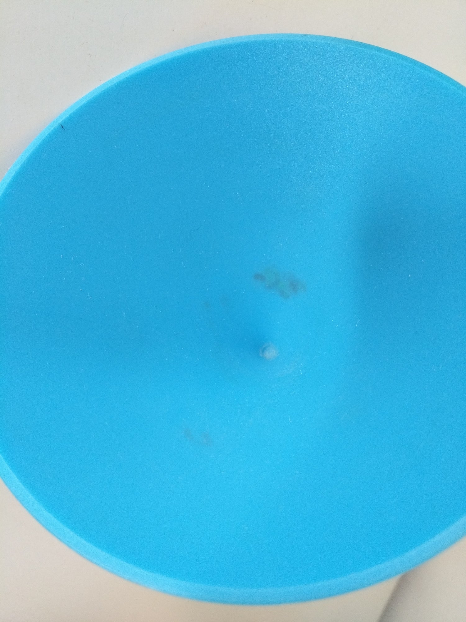 Plastique - le jaune a 2-3 marques à l'intérieur ainsi que le bleu qui est le plus marqué, cf photos - 13cm de diamètre - 8,3cm de hauteur.