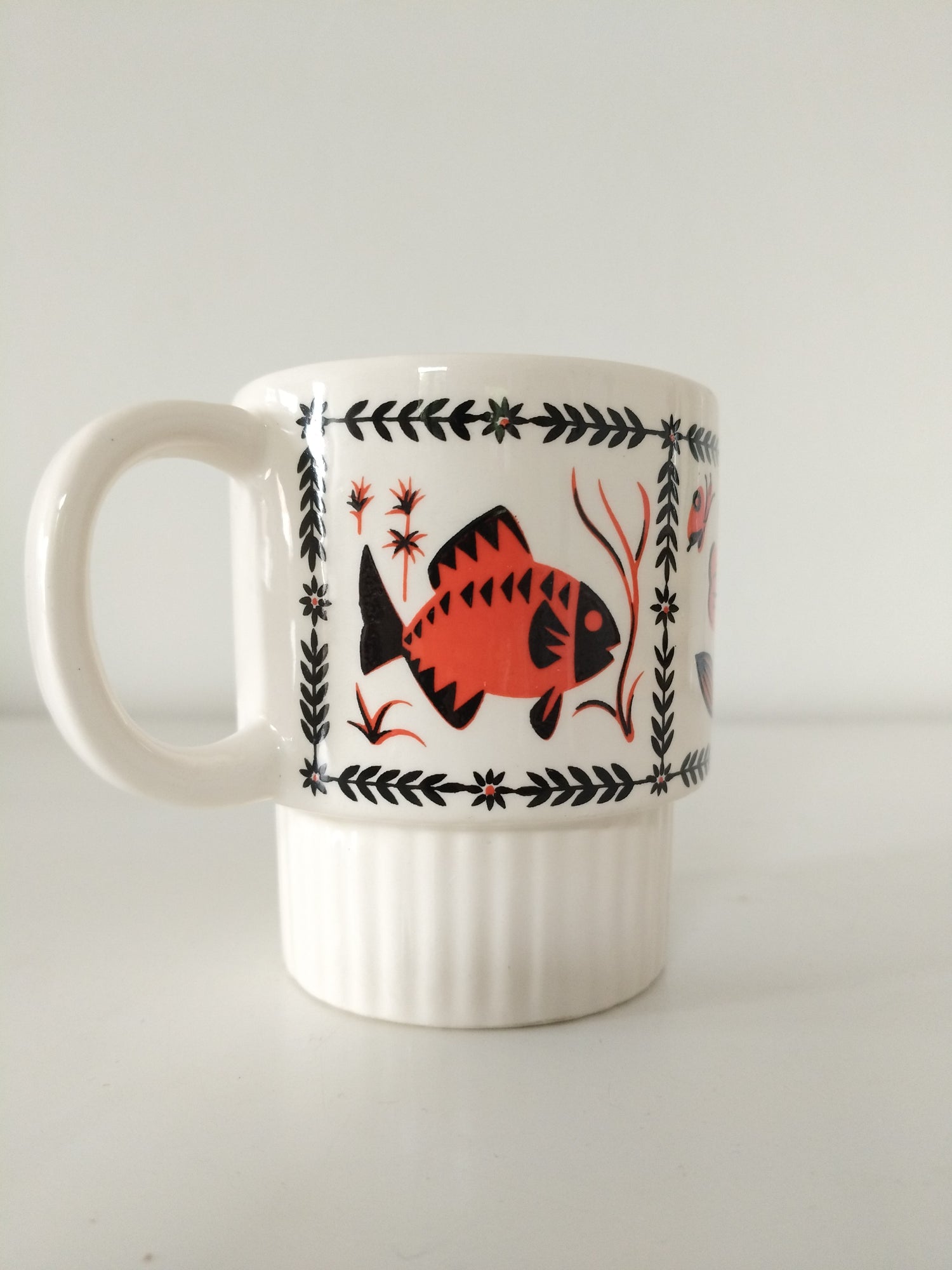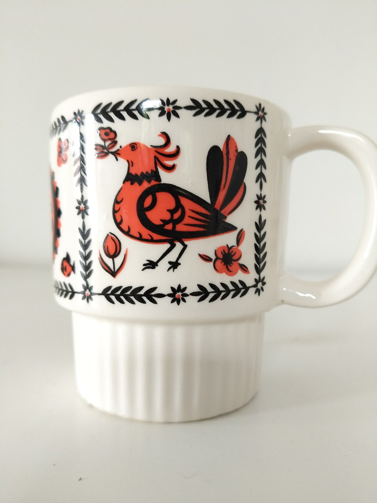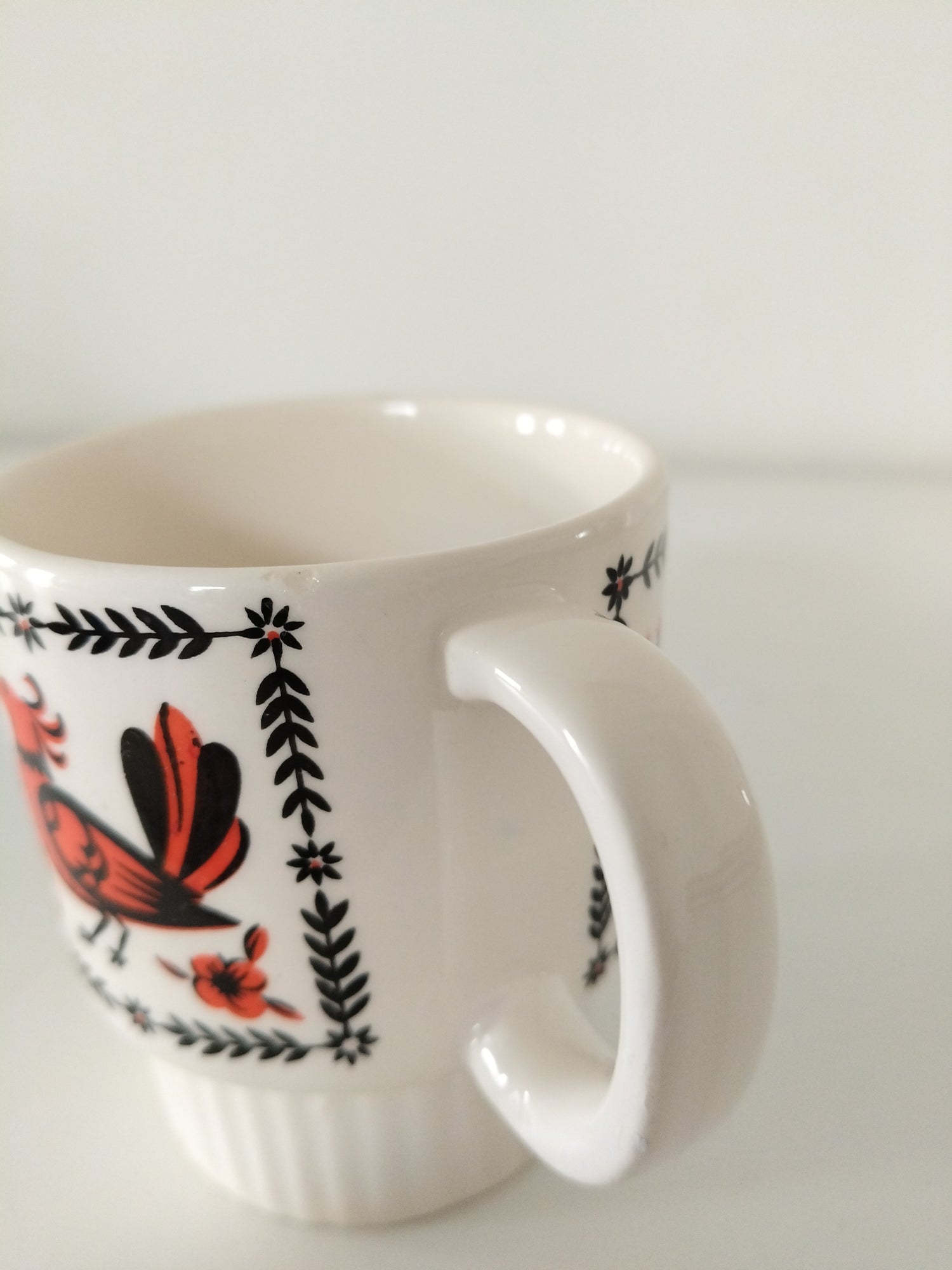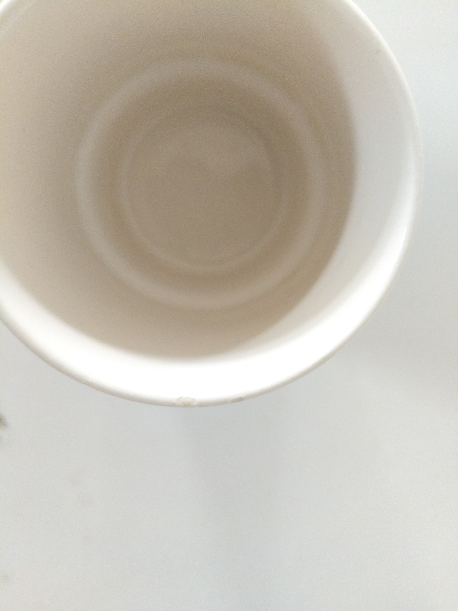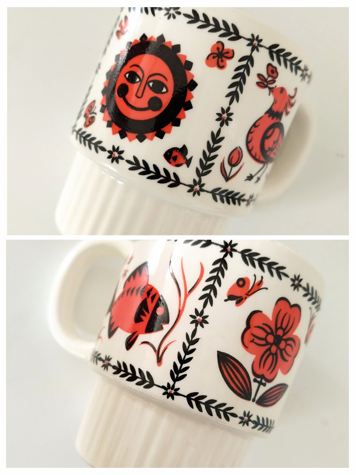 Porcelaine - quelques très petits éclats (bord et un anse) corrigés par mes soins et donc très discrets + 2 très petits sur la base, cf photos - 7cm de diamètre (dessus) et 8,8cm de hauteur.