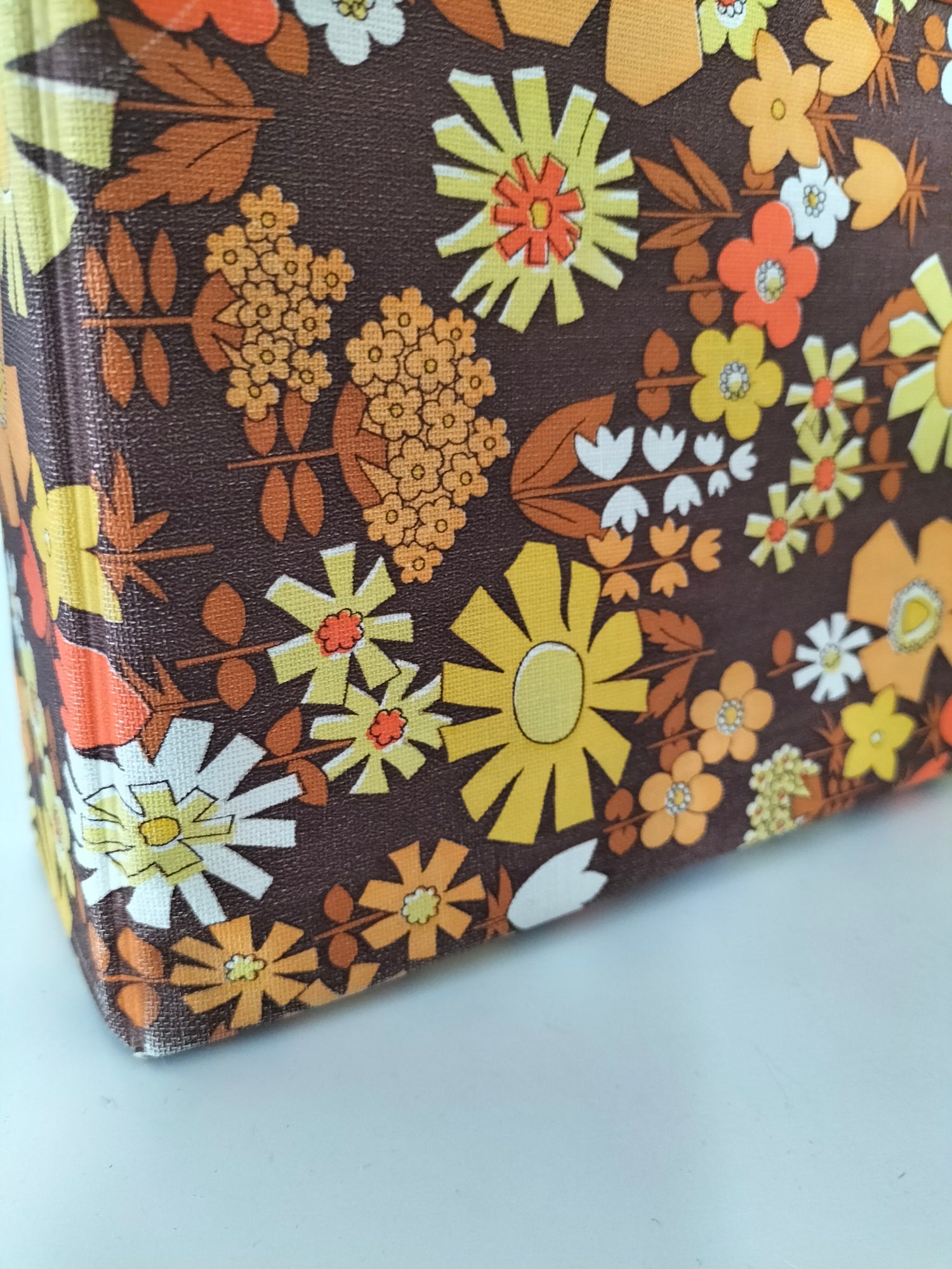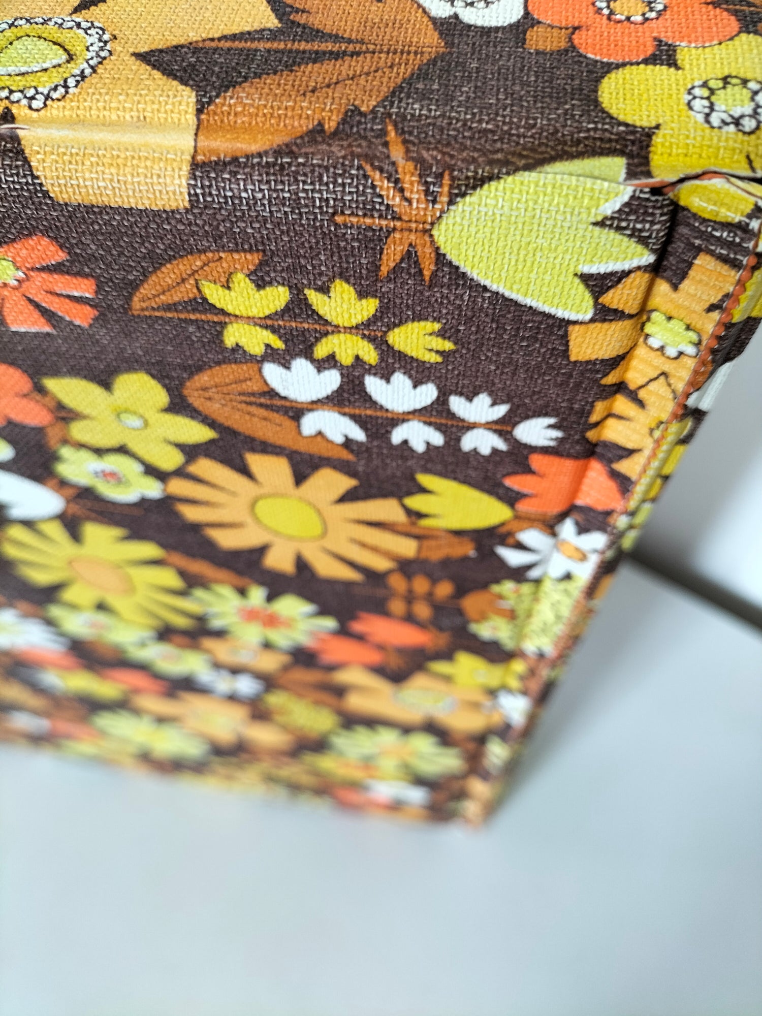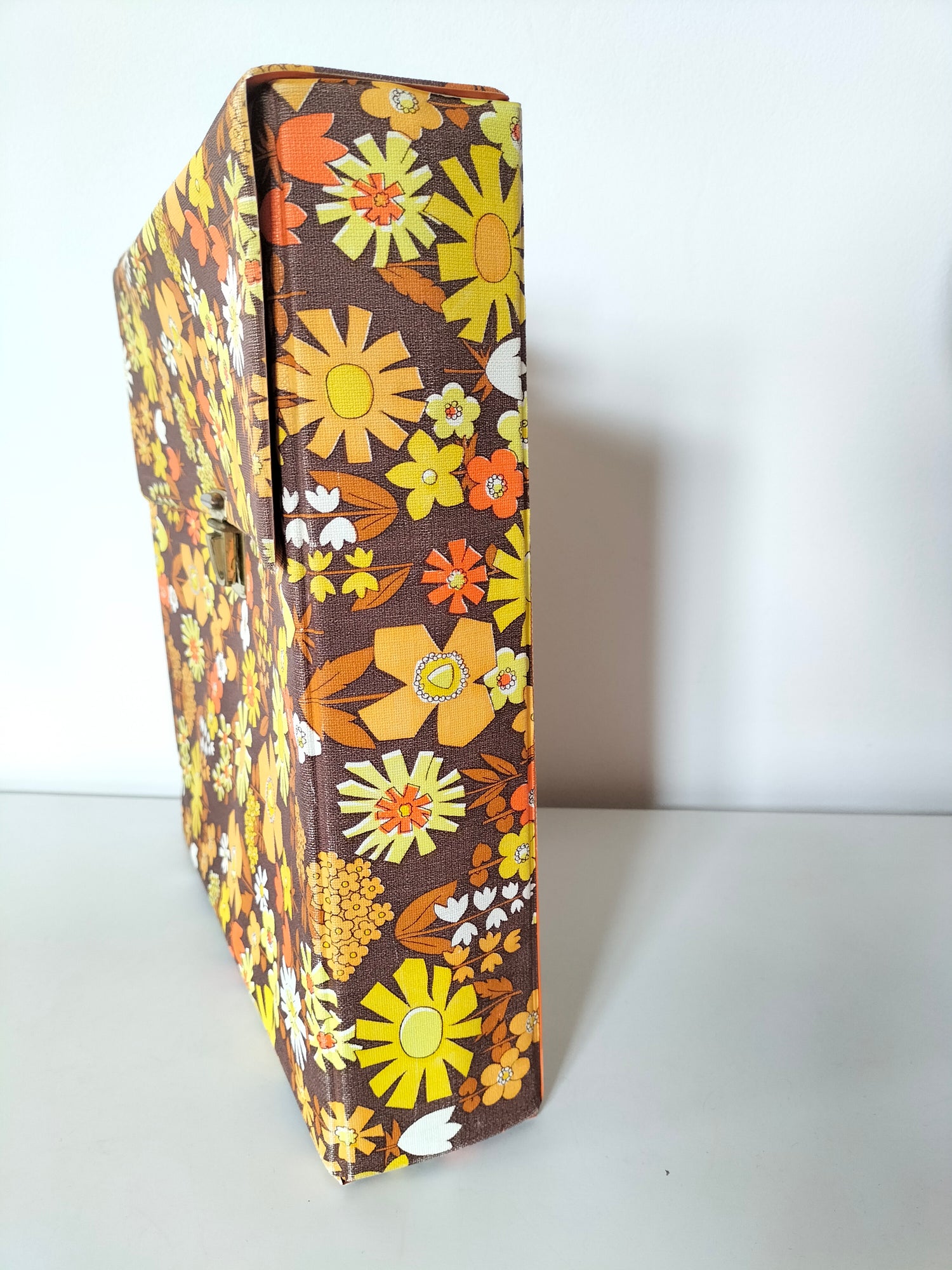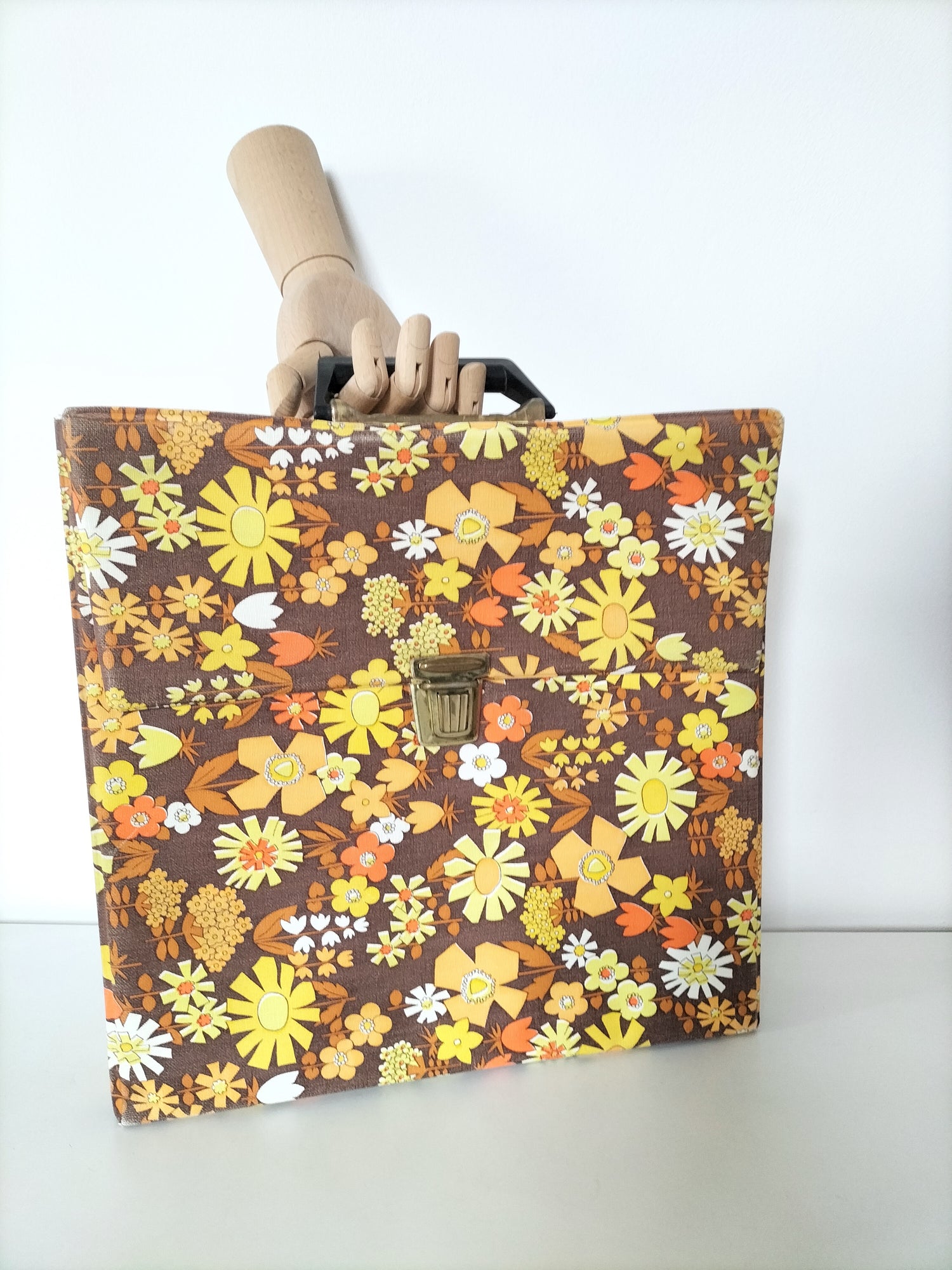 32,5x32 cm et 7,3cm de profondeur - elle a des signes d'usage visibles en photos et ce qui a pu être solidifié l'a été afin d'éviter toute aggravation et que le rendu soit plus joli (fragilités du vinyle au niveau des pliures à l'arrière).