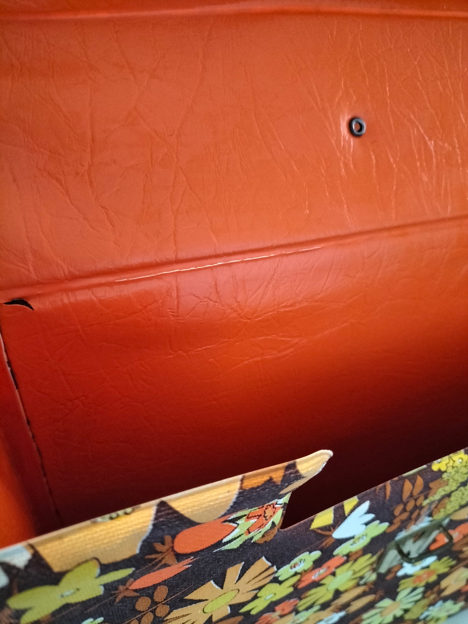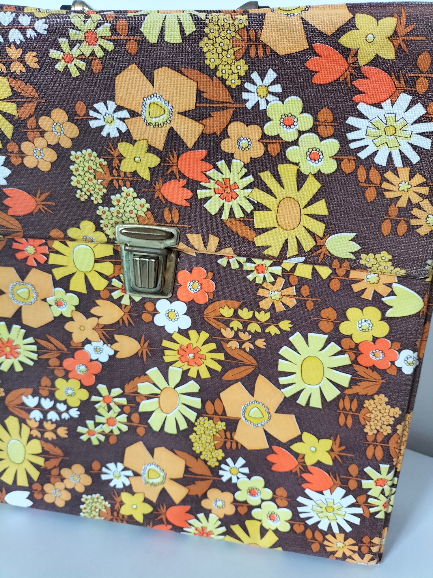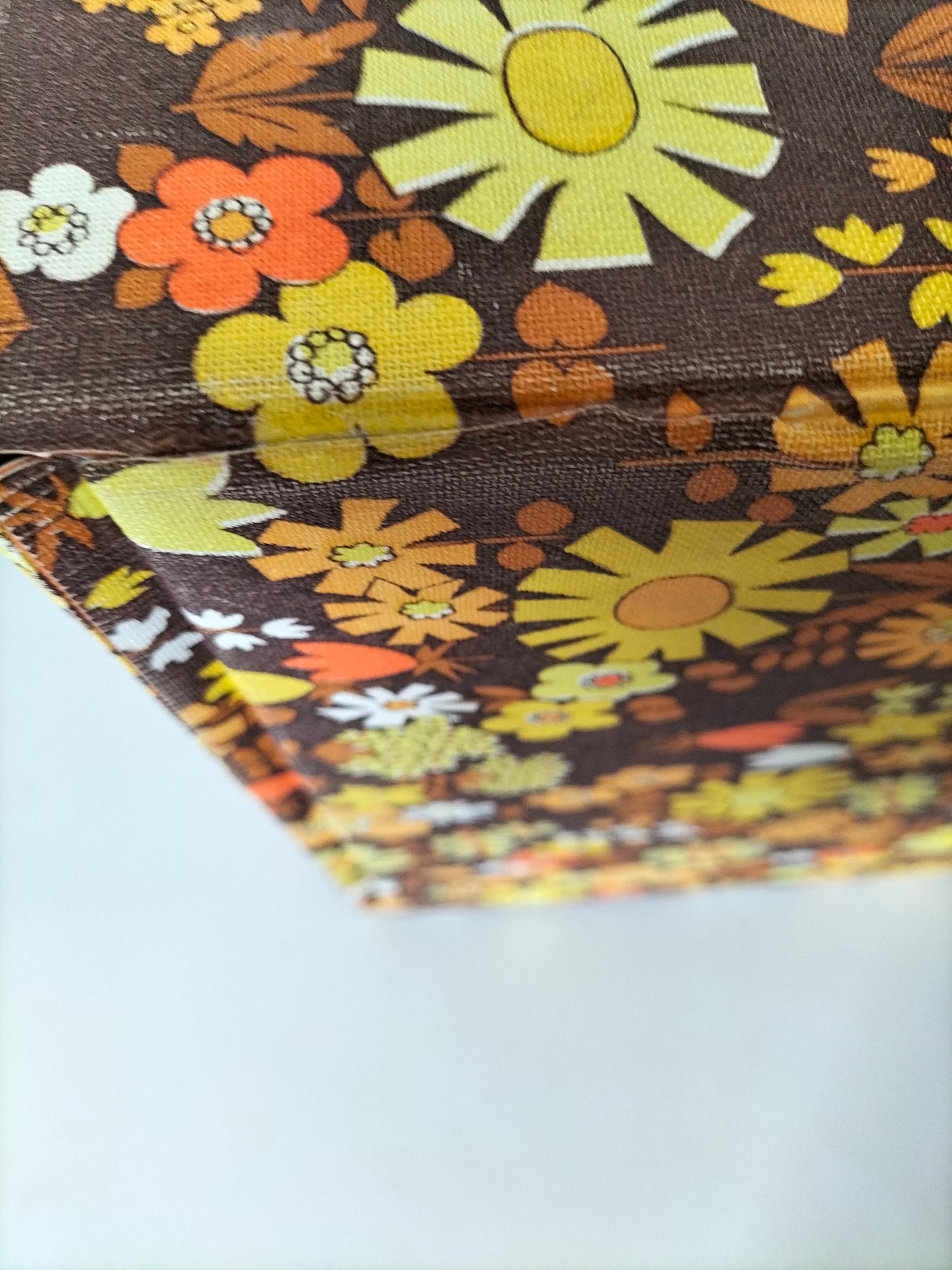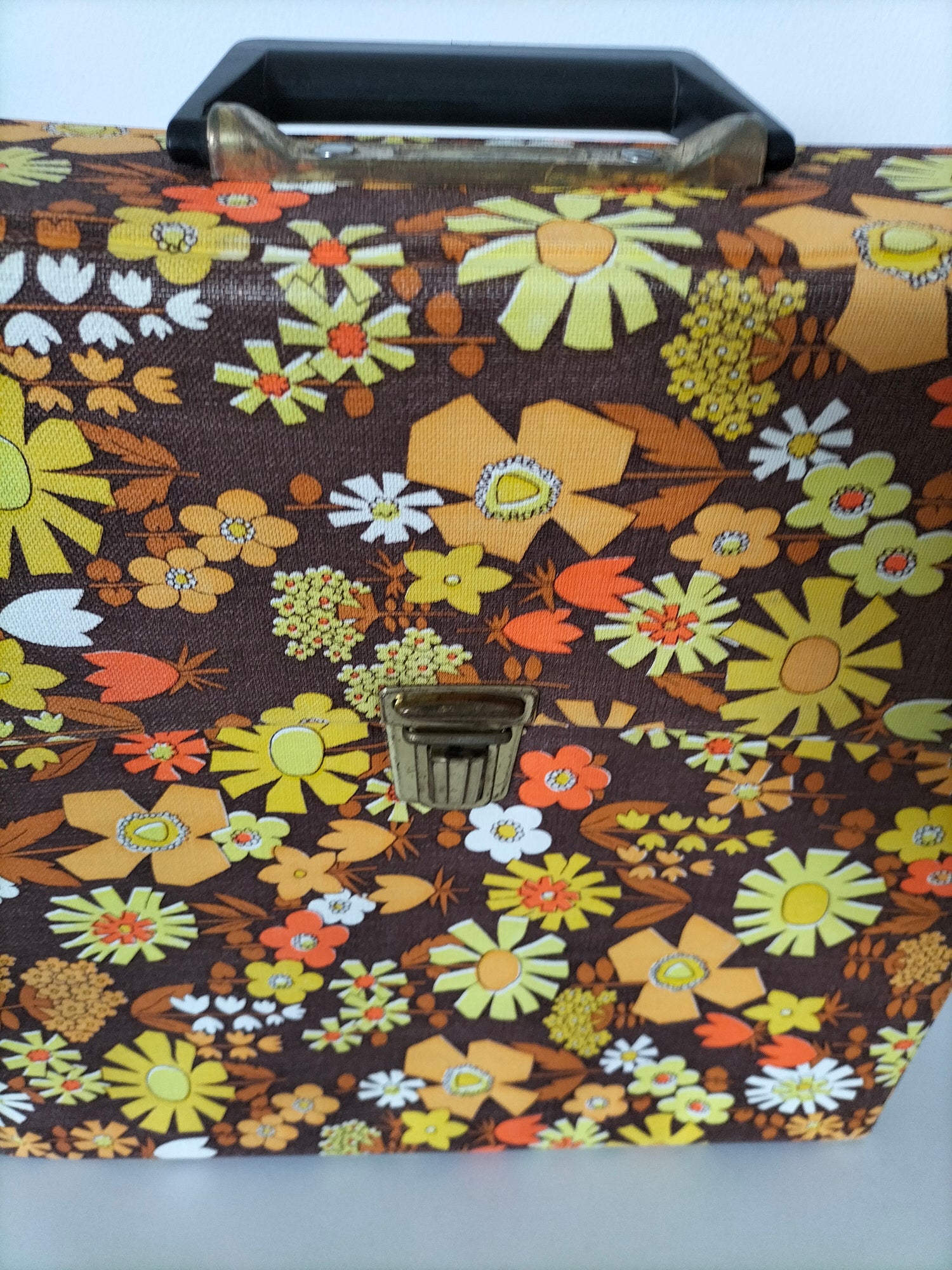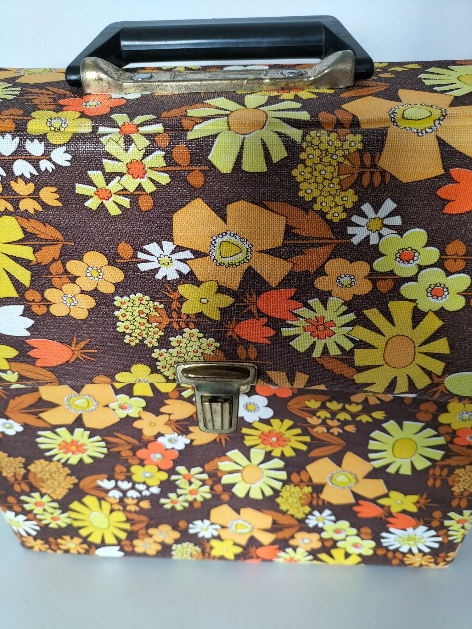 32,5x32 cm et 7,3cm de profondeur - elle a des signes d'usage visibles en photos et ce qui a pu être solidifié l'a été afin d'éviter toute aggravation et que le rendu soit plus joli (fragilités du vinyle au niveau des pliures à l'arrière).